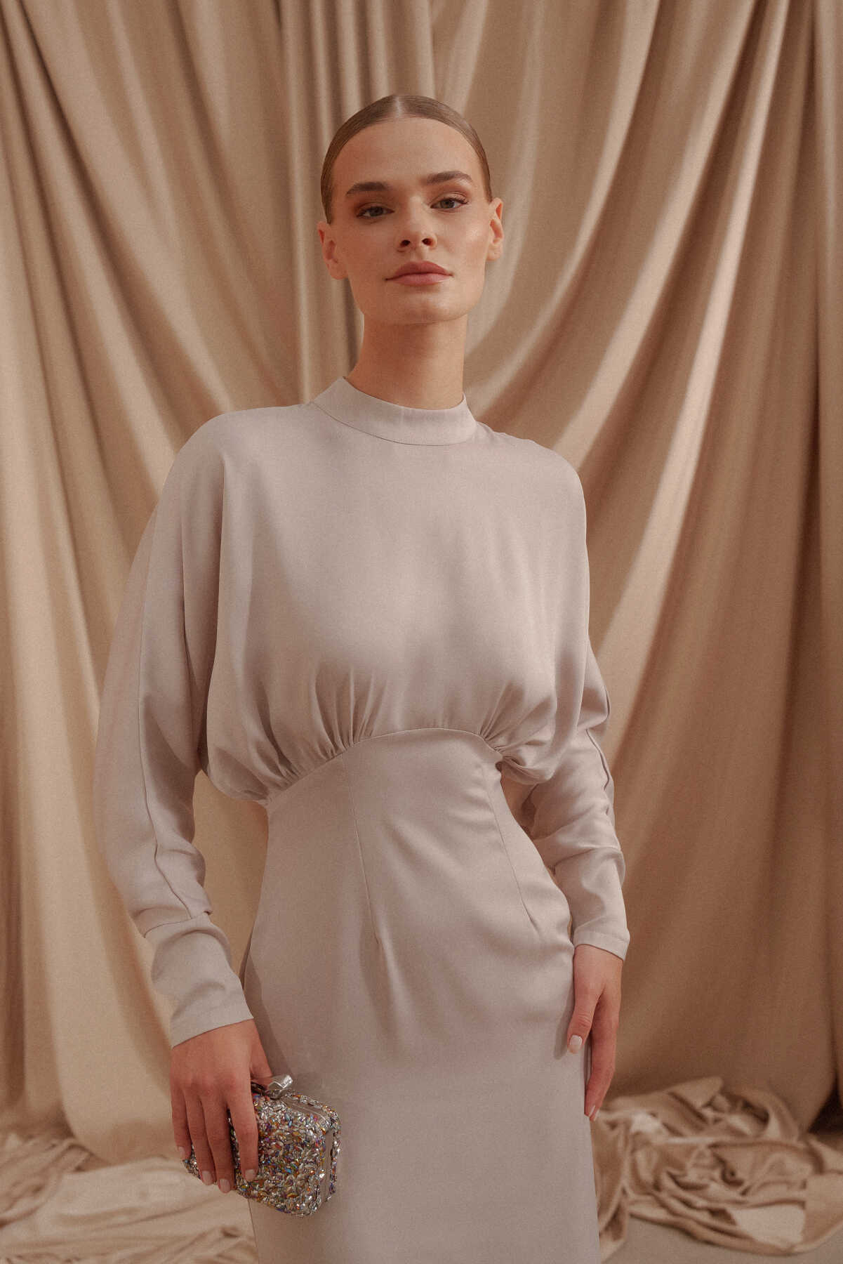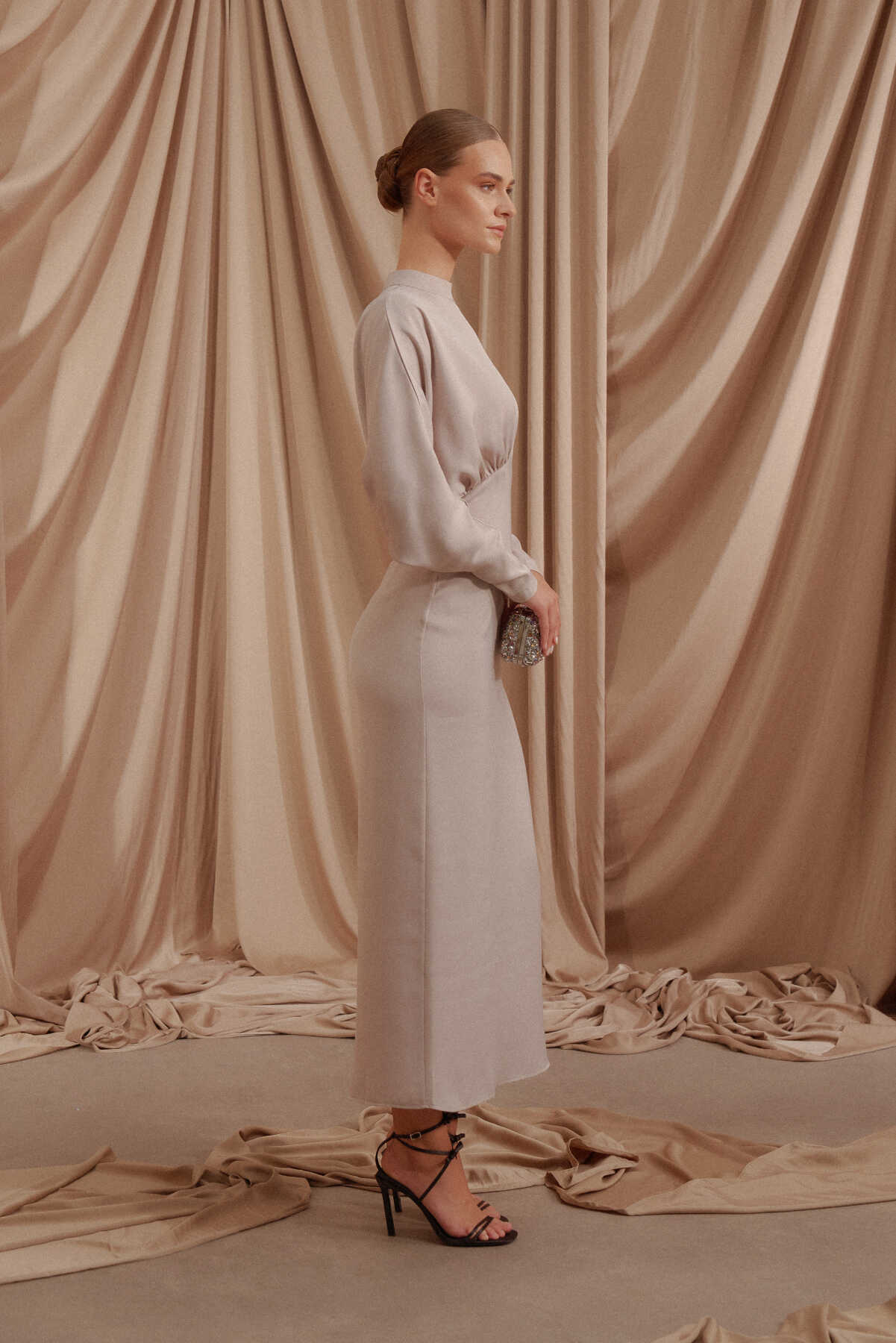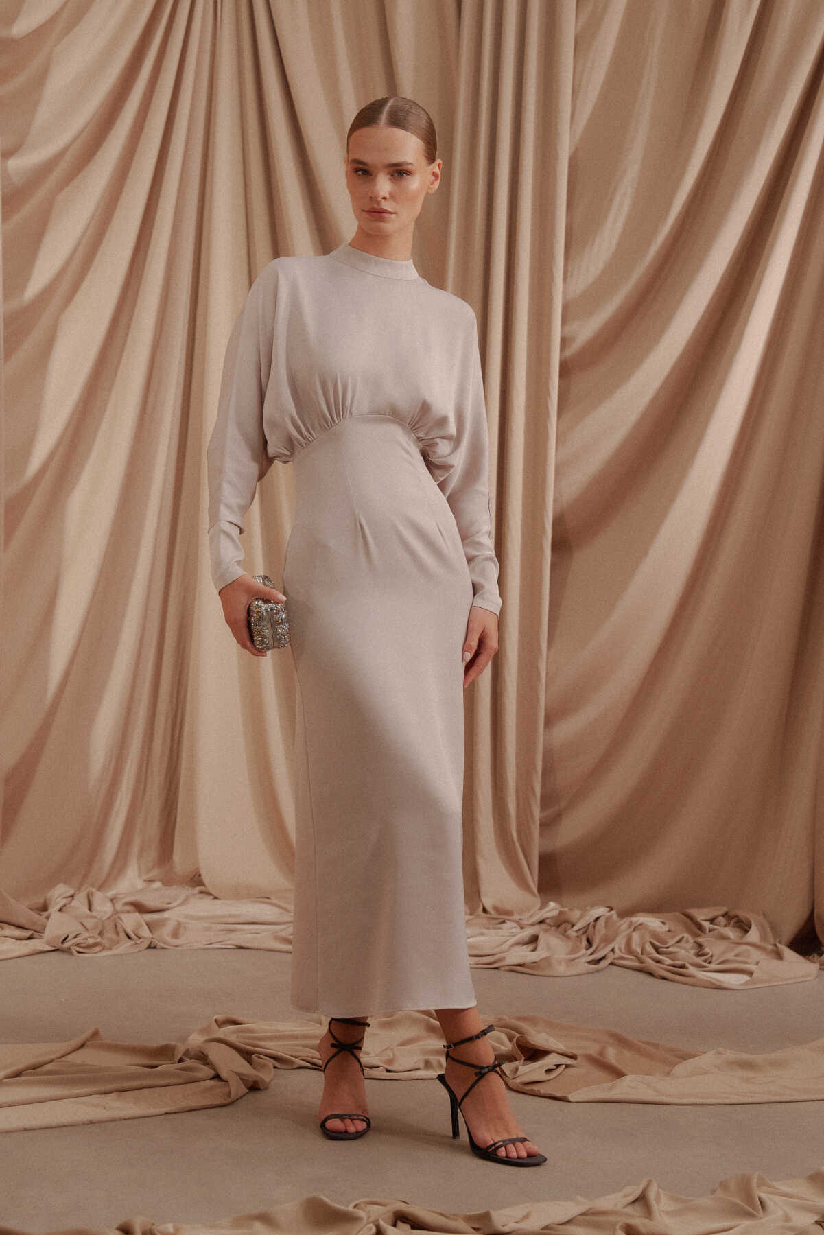 • Arkası gizli fermuar kapamalı, saten kumaş