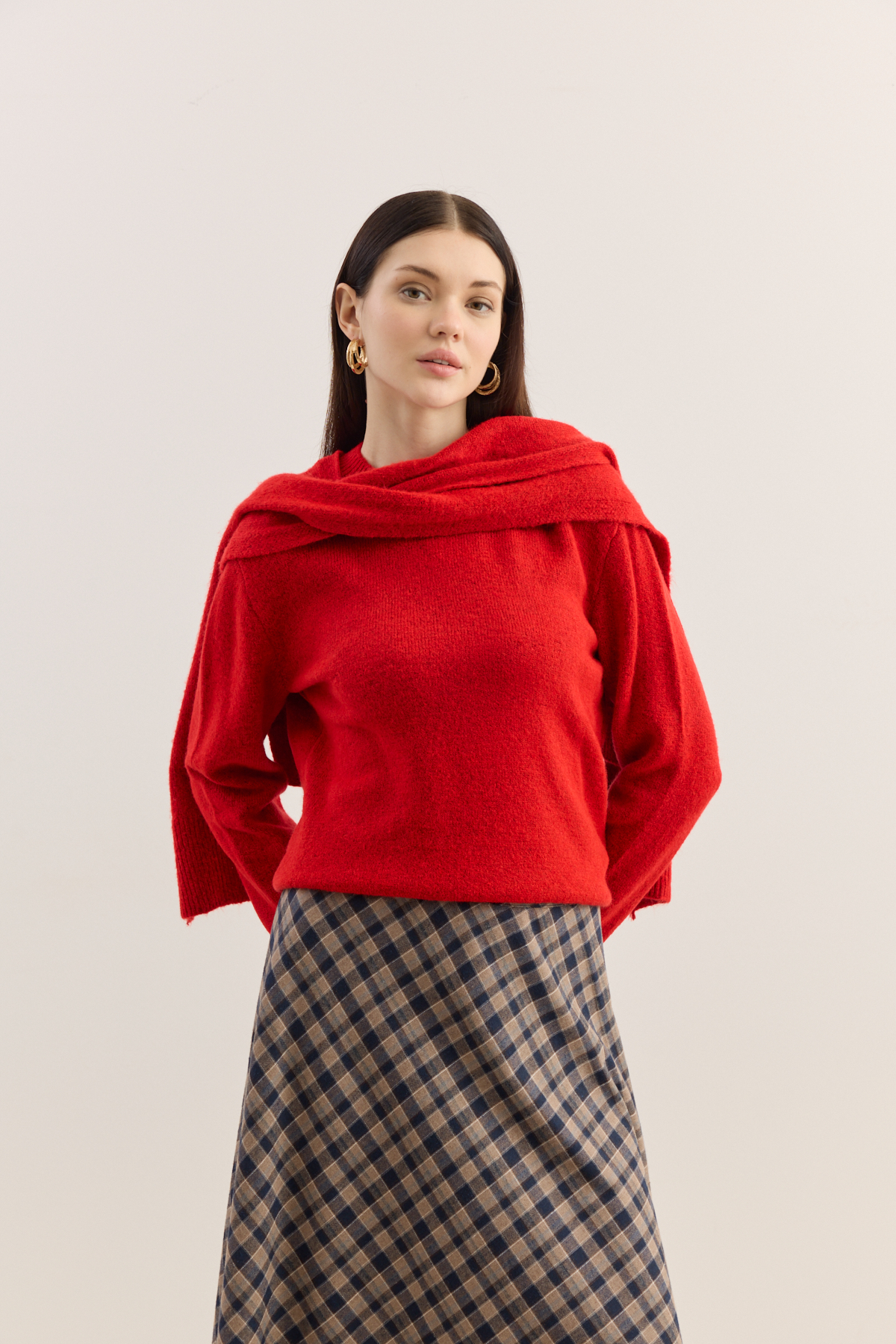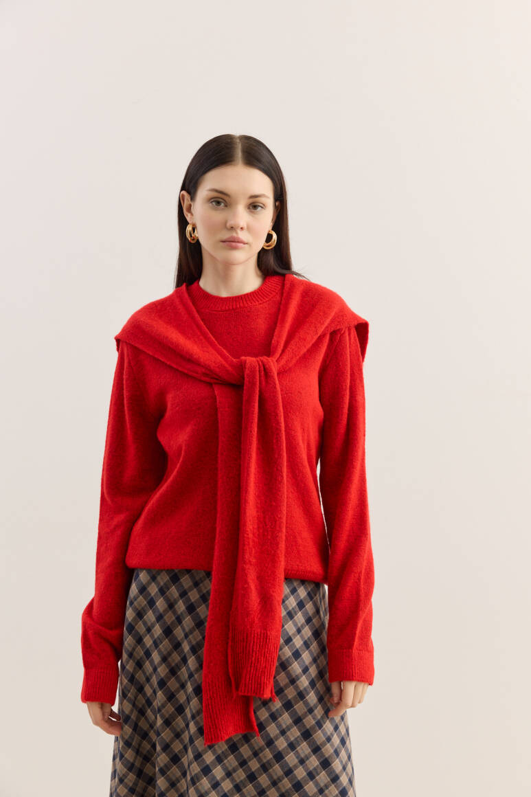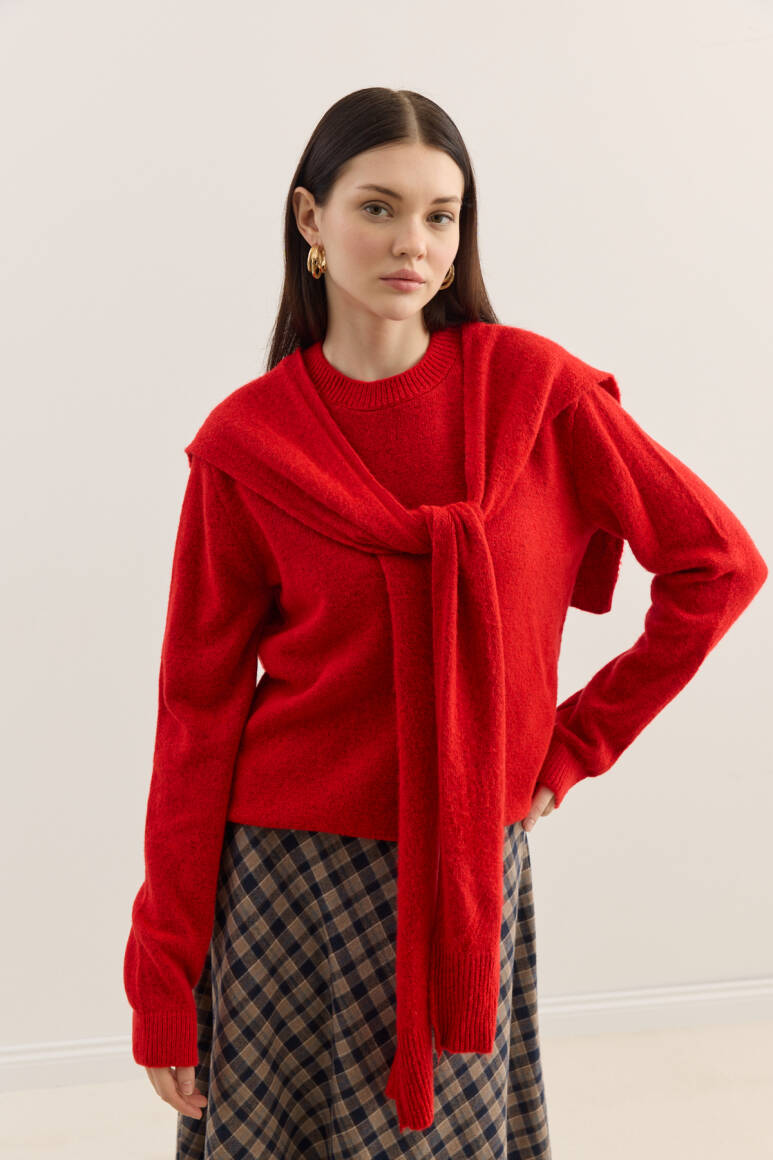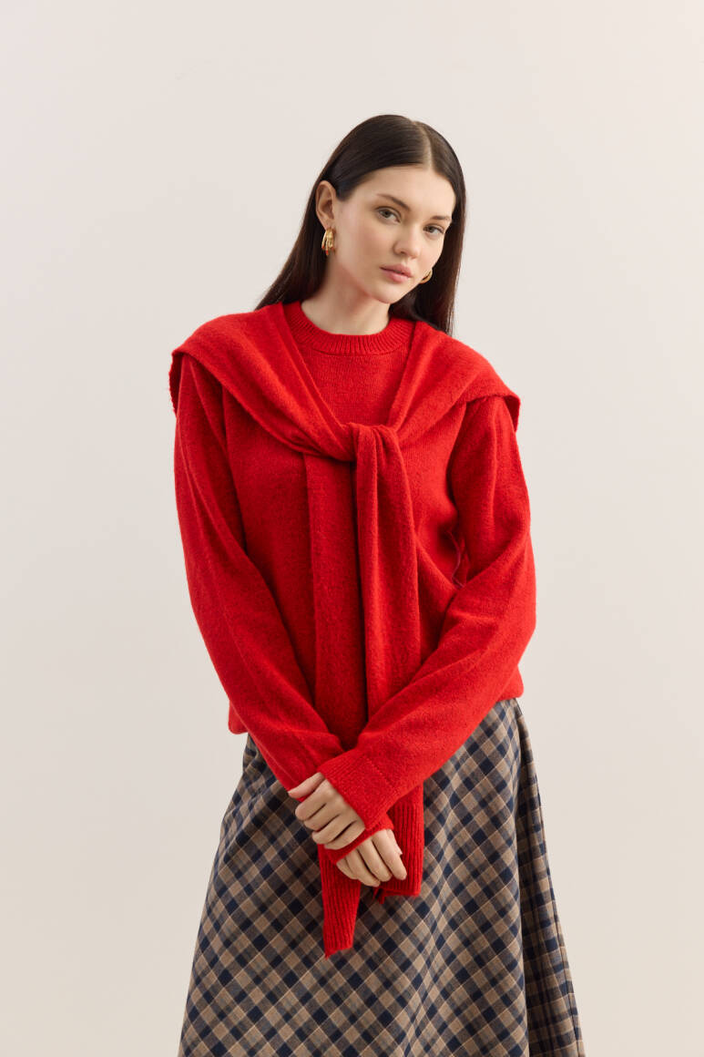 Modern ve sofistike bir görünüm sunan triko kazak, omuzdan bağlamalı şal detayıyla klasik triko tasarımına farklı bir yorum kazandırır. Yumuşak dokulu kumaşı sayesinde gün boyu konfor sağlarken, akıcı formu vücuda zarif bir şekilde oturur.