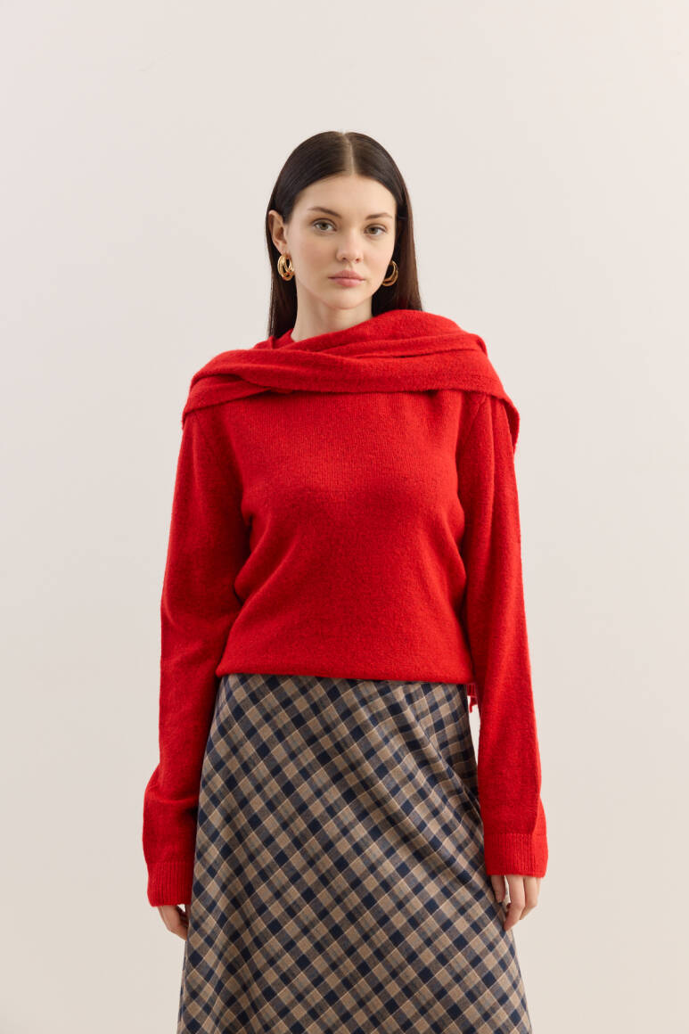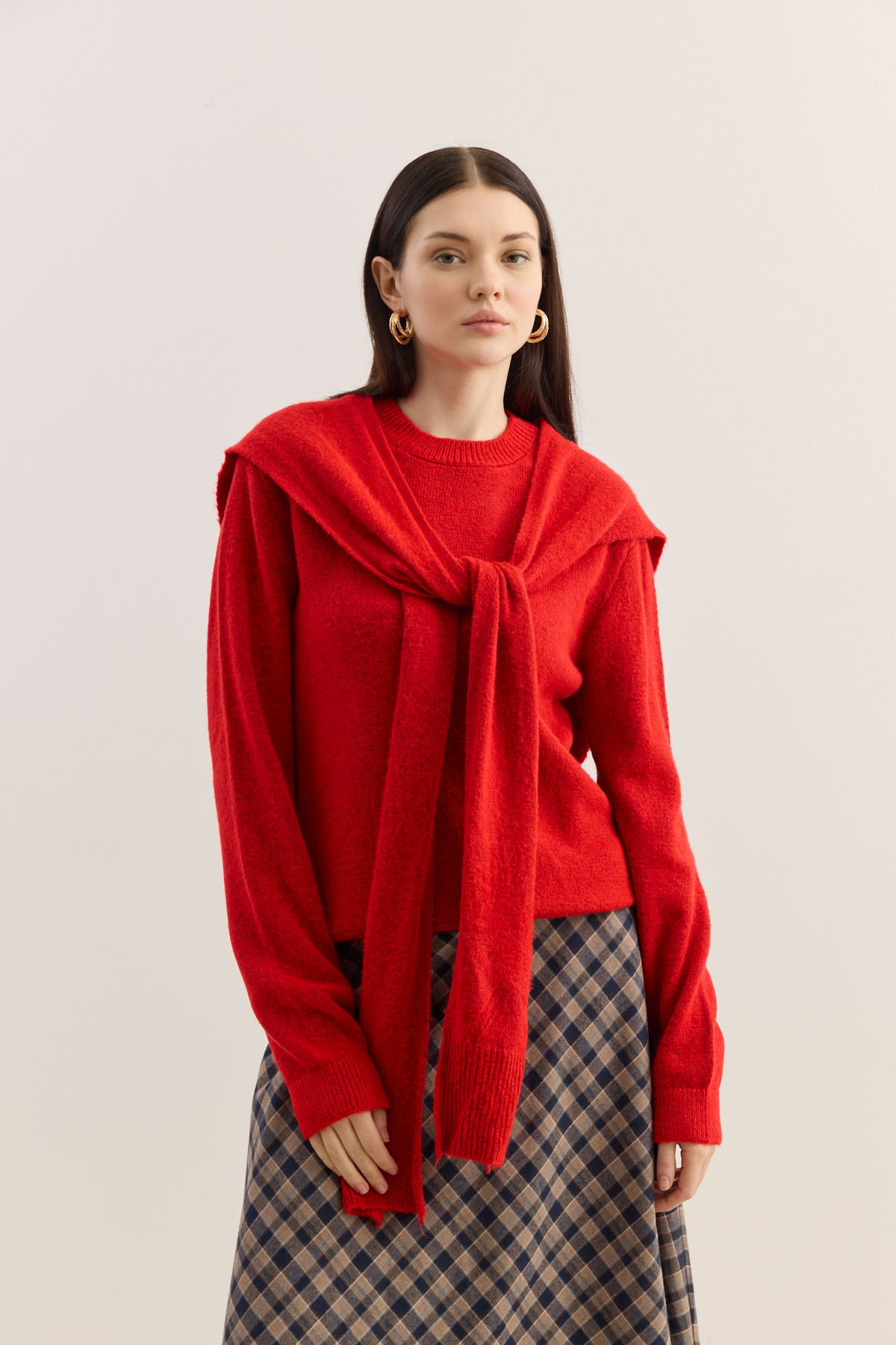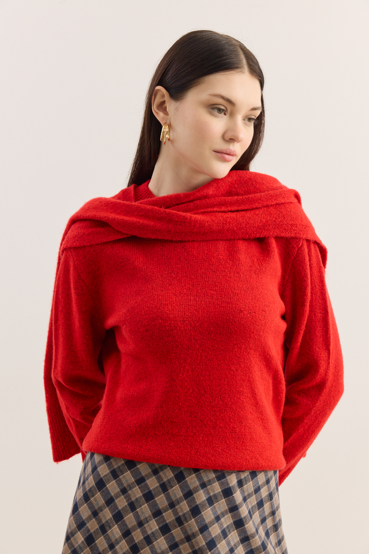 Modern ve sofistike bir görünüm sunan triko kazak, omuzdan bağlamalı şal detayıyla klasik triko tasarımına farklı bir yorum kazandırır. Yumuşak dokulu kumaşı sayesinde gün boyu konfor sağlarken, akıcı formu vücuda zarif bir şekilde oturur.