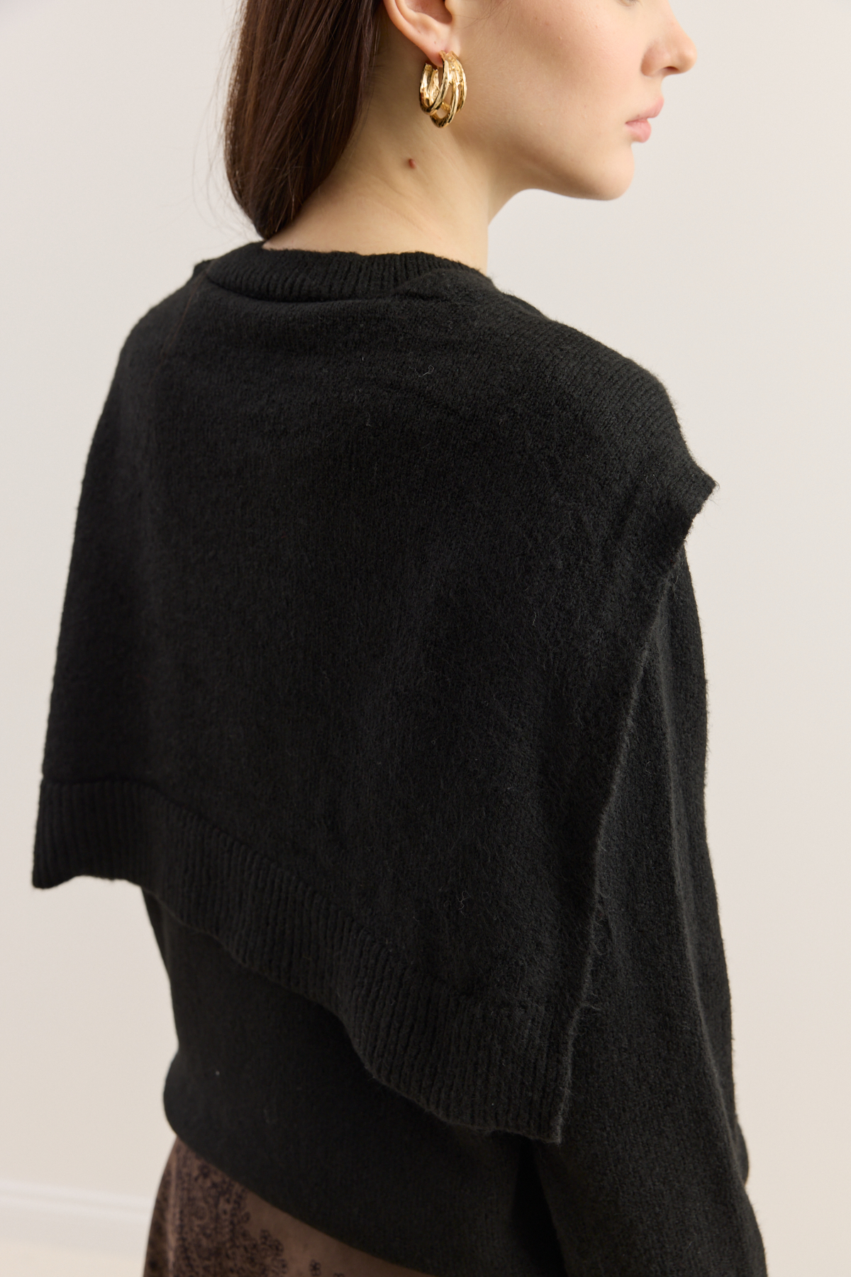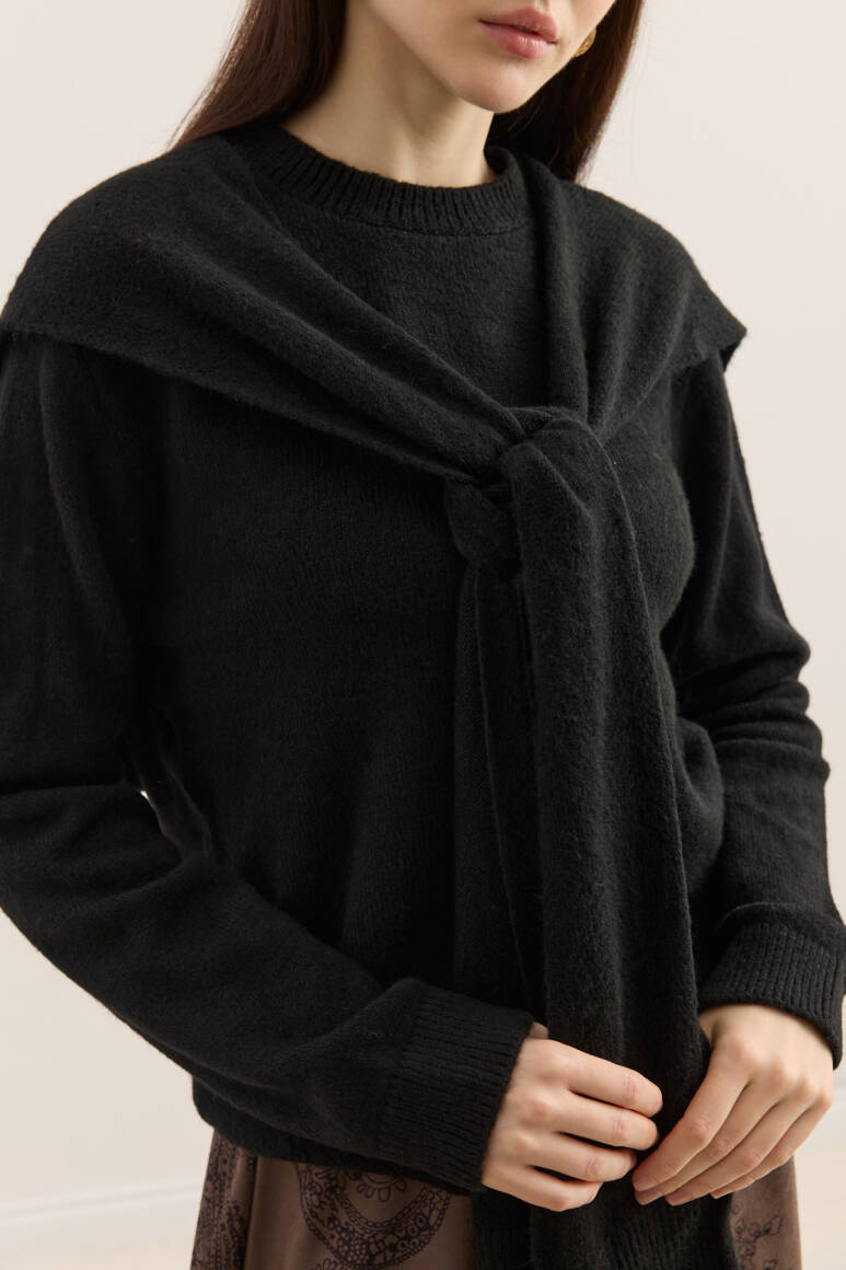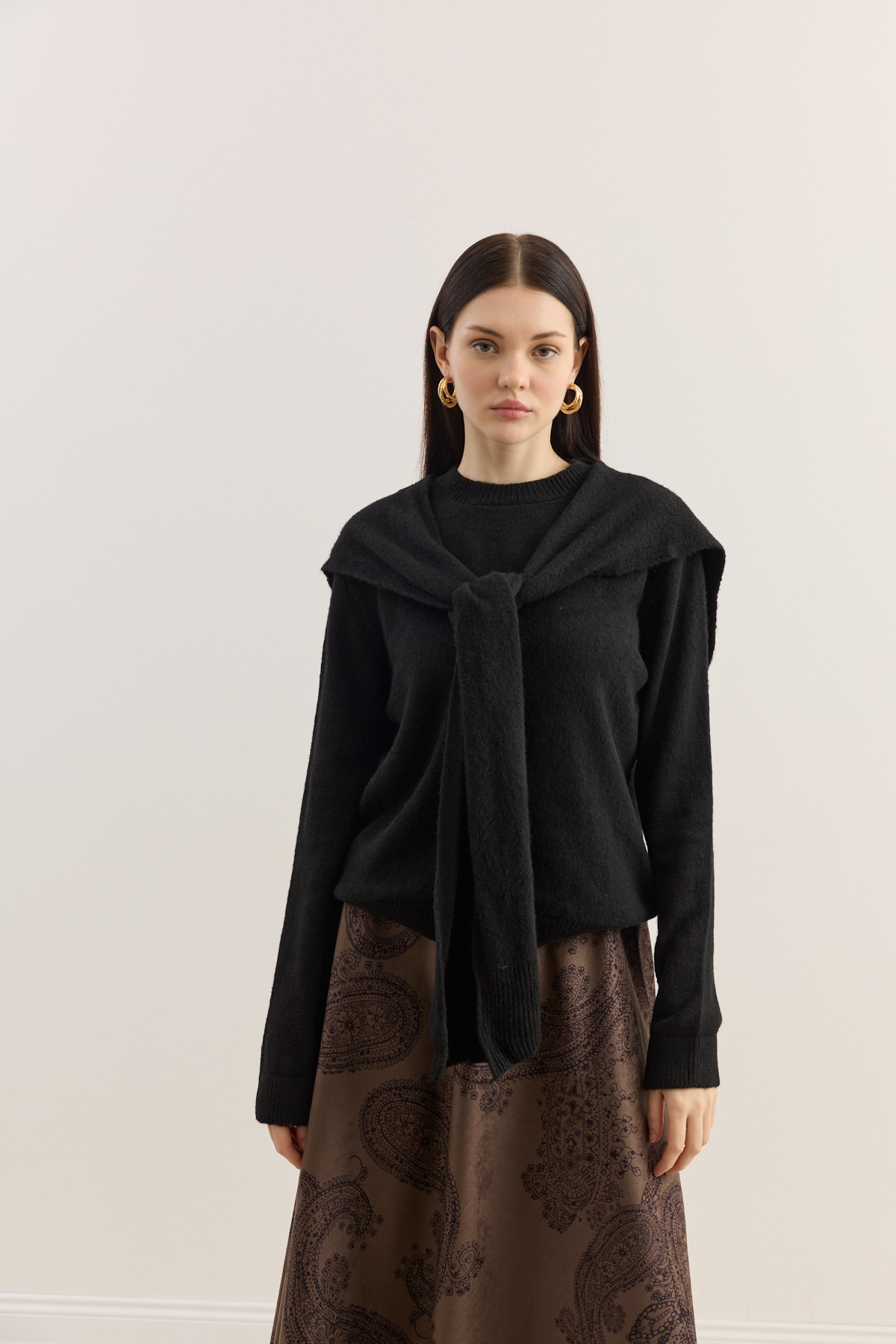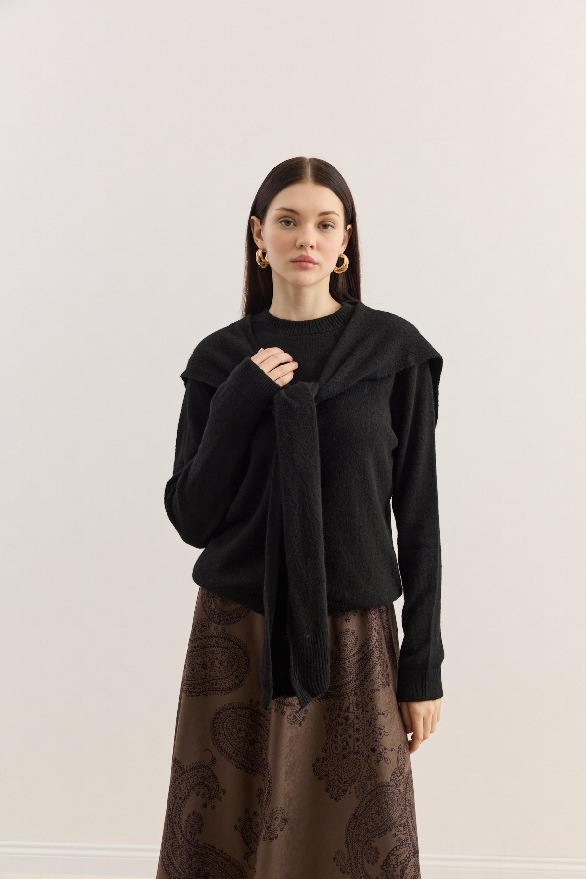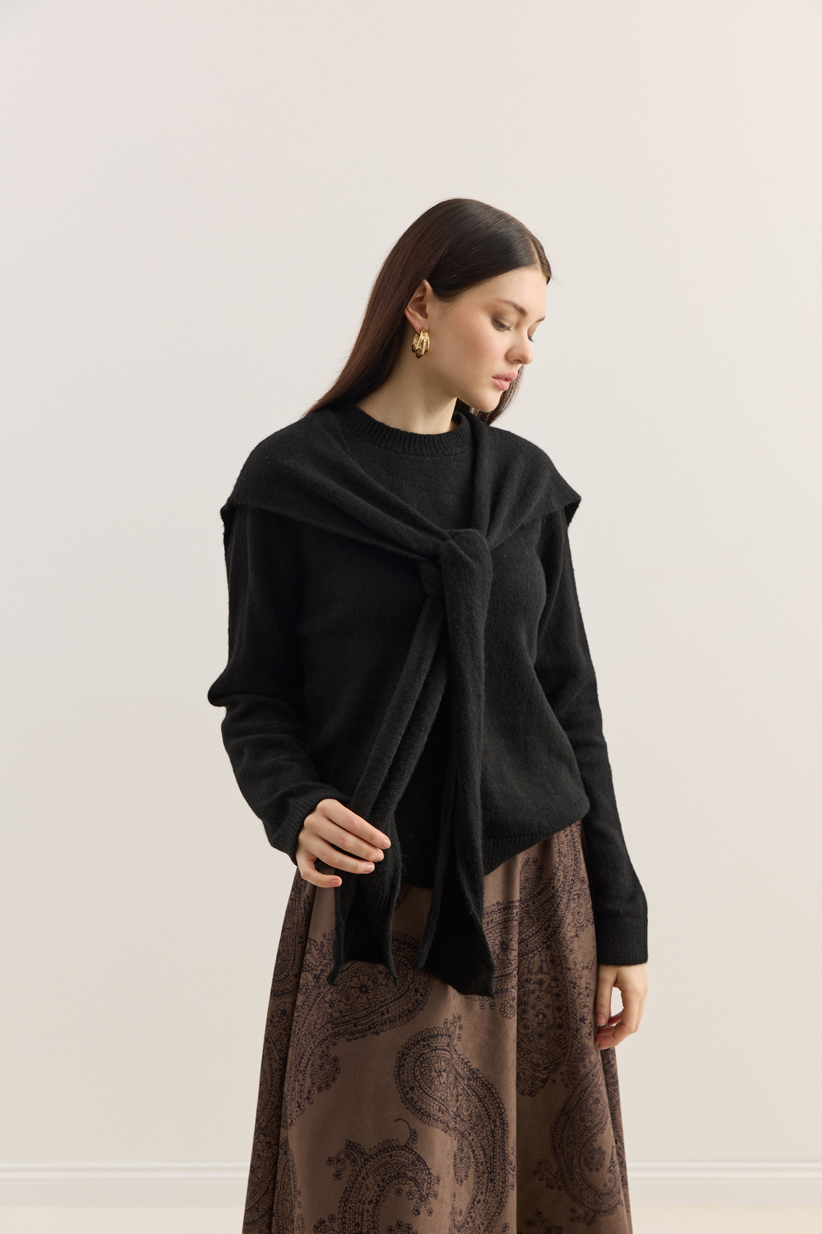 Modern ve sofistike bir görünüm sunan triko kazak, omuzdan bağlamalı şal detayıyla klasik triko tasarımına farklı bir yorum kazandırır. Yumuşak dokulu kumaşı sayesinde gün boyu konfor sağlarken, akıcı formu vücuda zarif bir şekilde oturur.