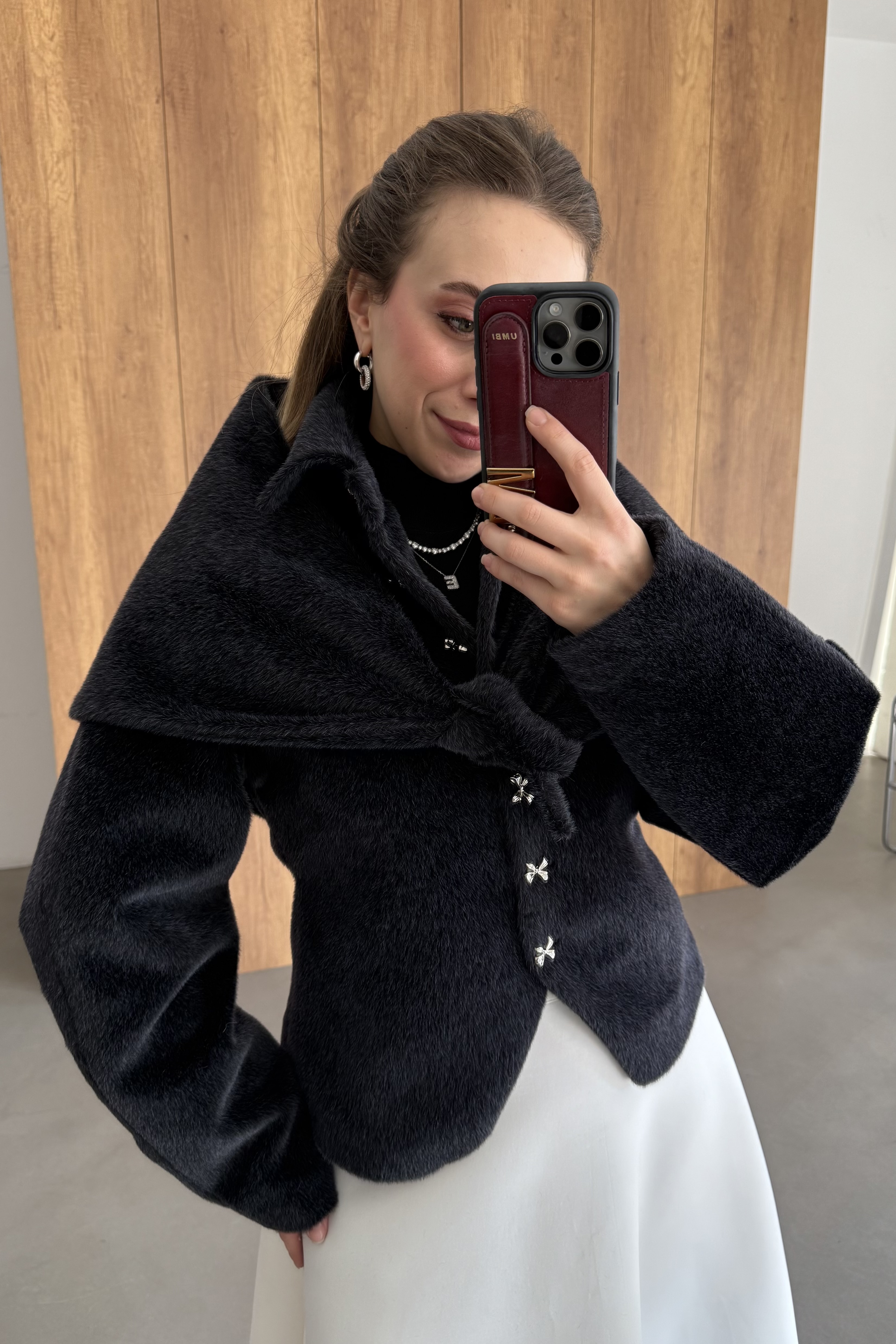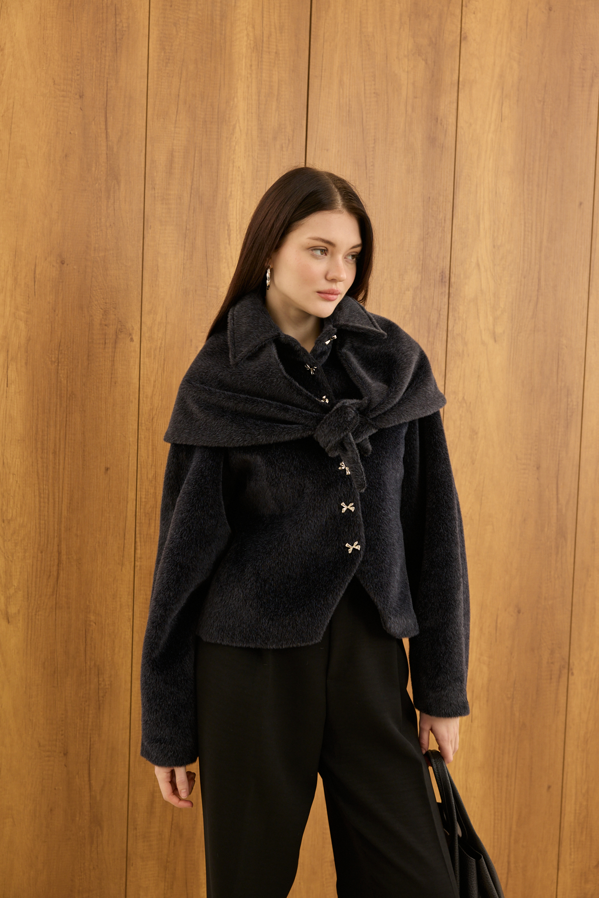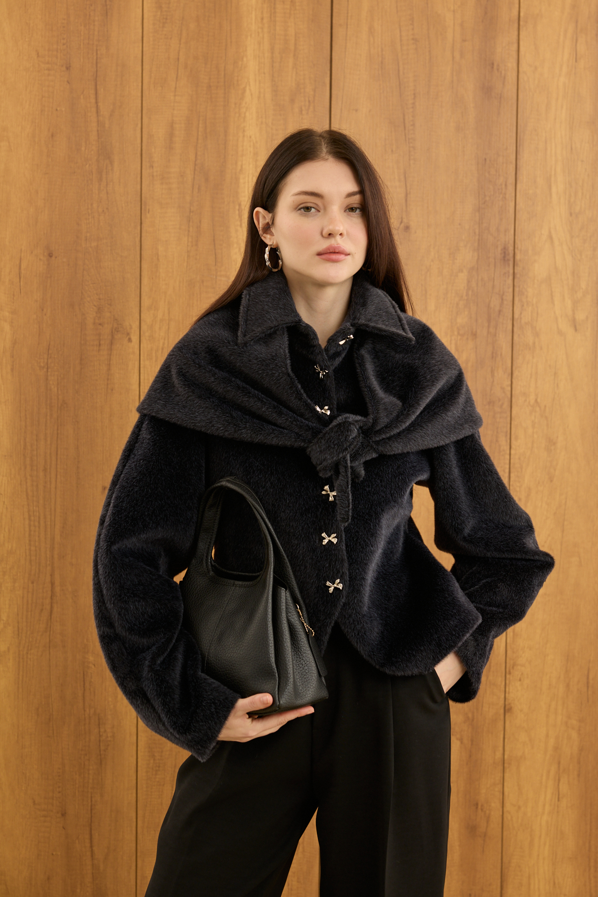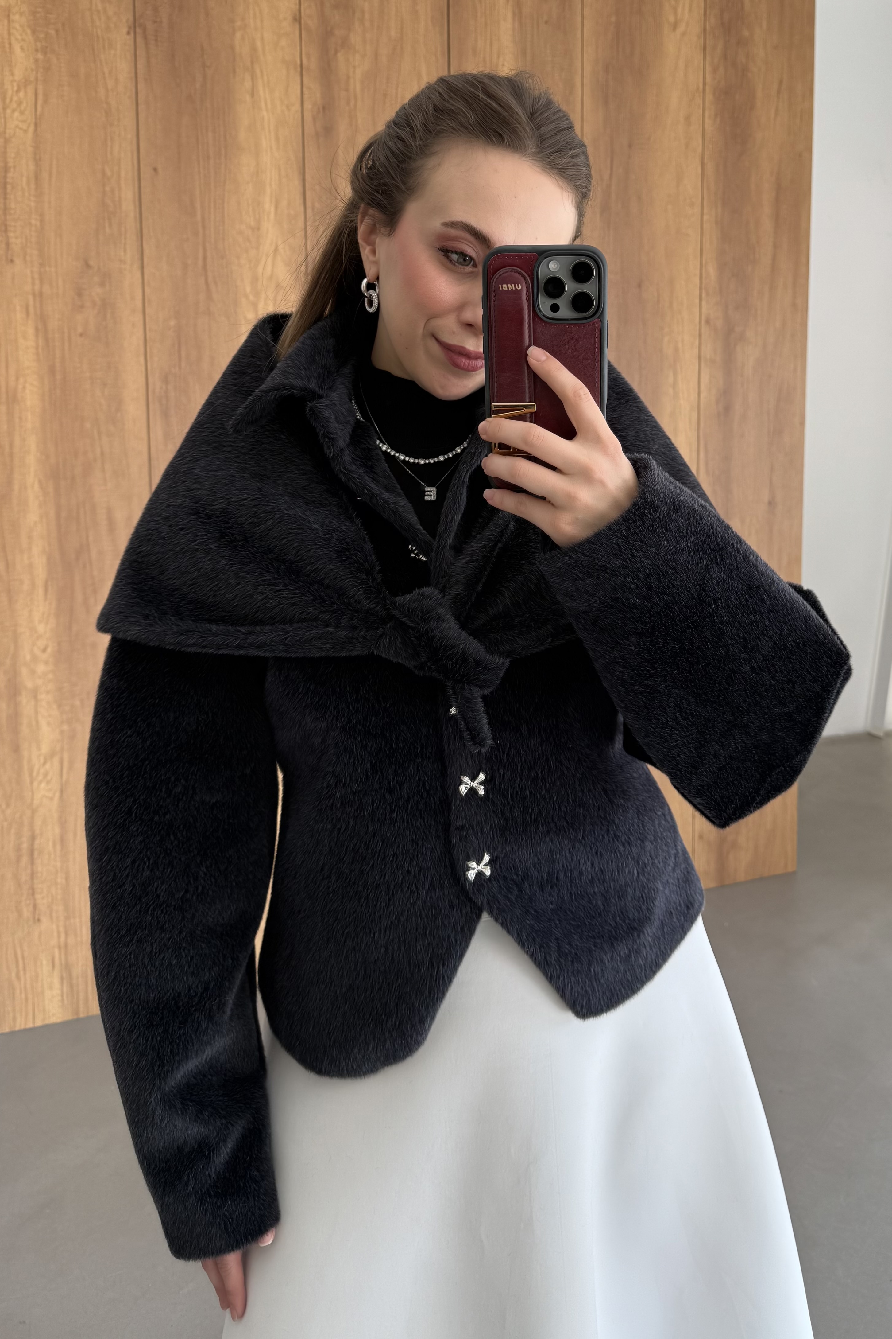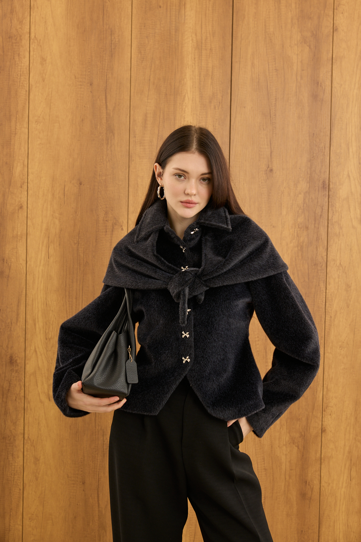 Belden oturtmalı kesimi ve fiyonklu düğme detayıyla feminen bir siluet yaratan fox kaban, çıkarılabilir atkı detayı sayesinde sofistike bir dokunuş sunuyor. Lüks dokusu ve modern tasarımı, soğuk günlerde sıcaklık sağlarken şıklığınızı ve zarif duruşunuzu ön plana çıkarıyor.