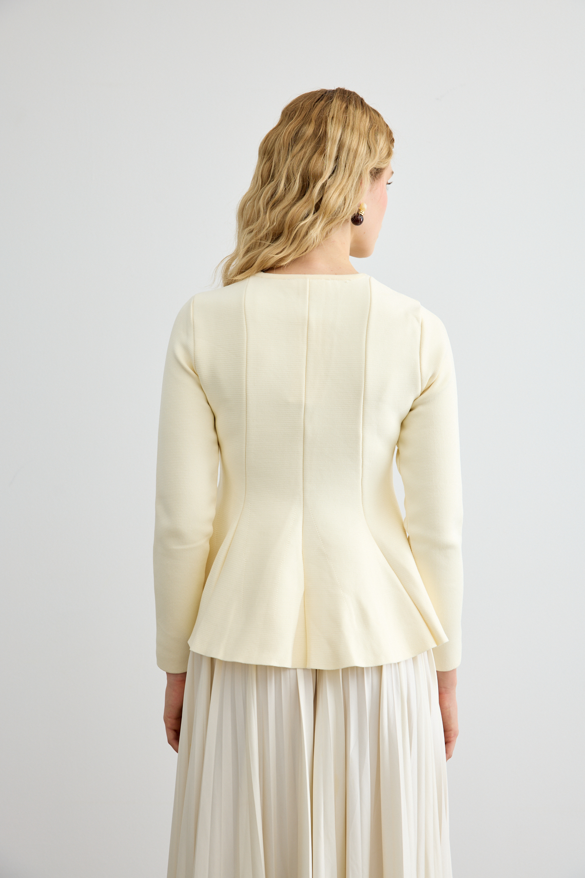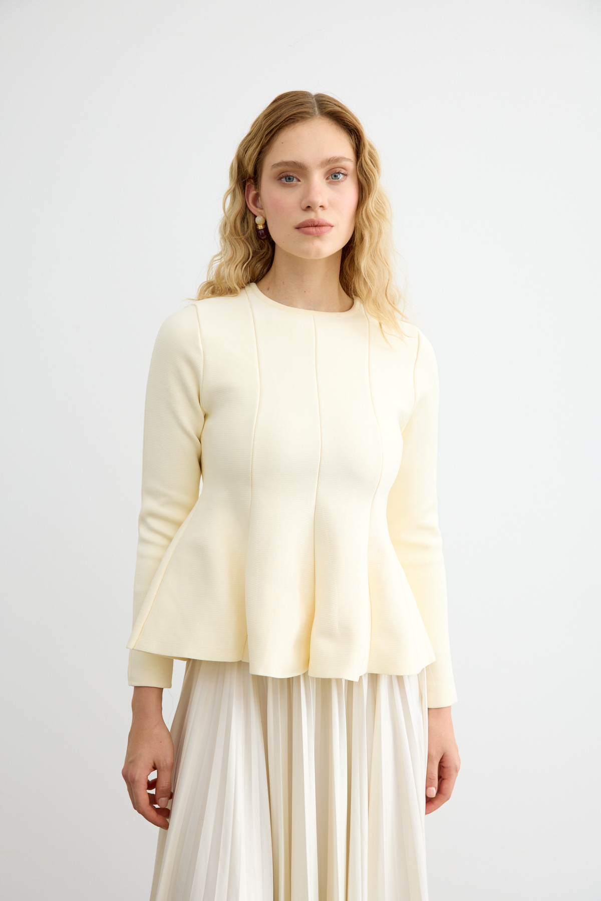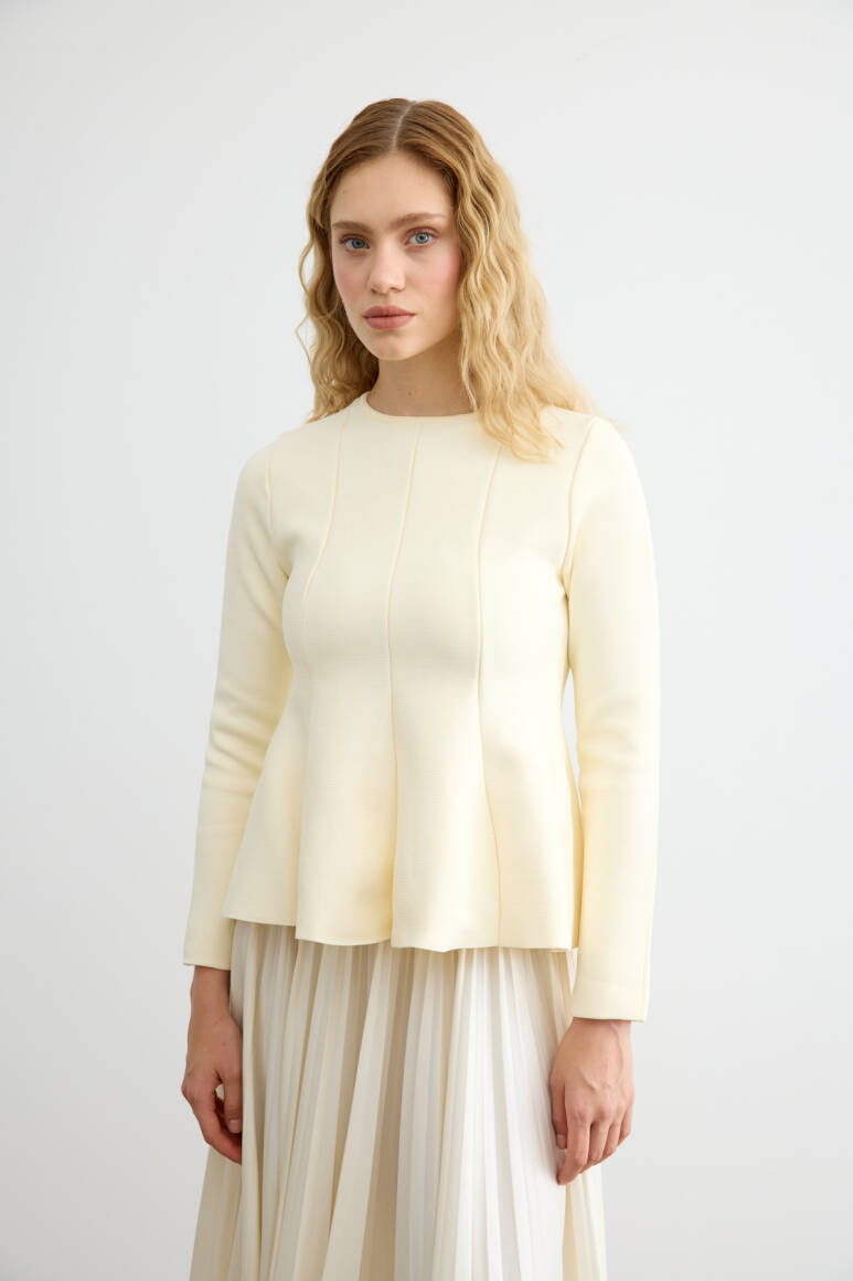 Vücuda oturan formuyla feminen bir siluet yaratan bu bluz, zarif triko dokusuyla öne çıkıyor. Günlük kombinlere modern ve şık bir dokunuş katıyor.