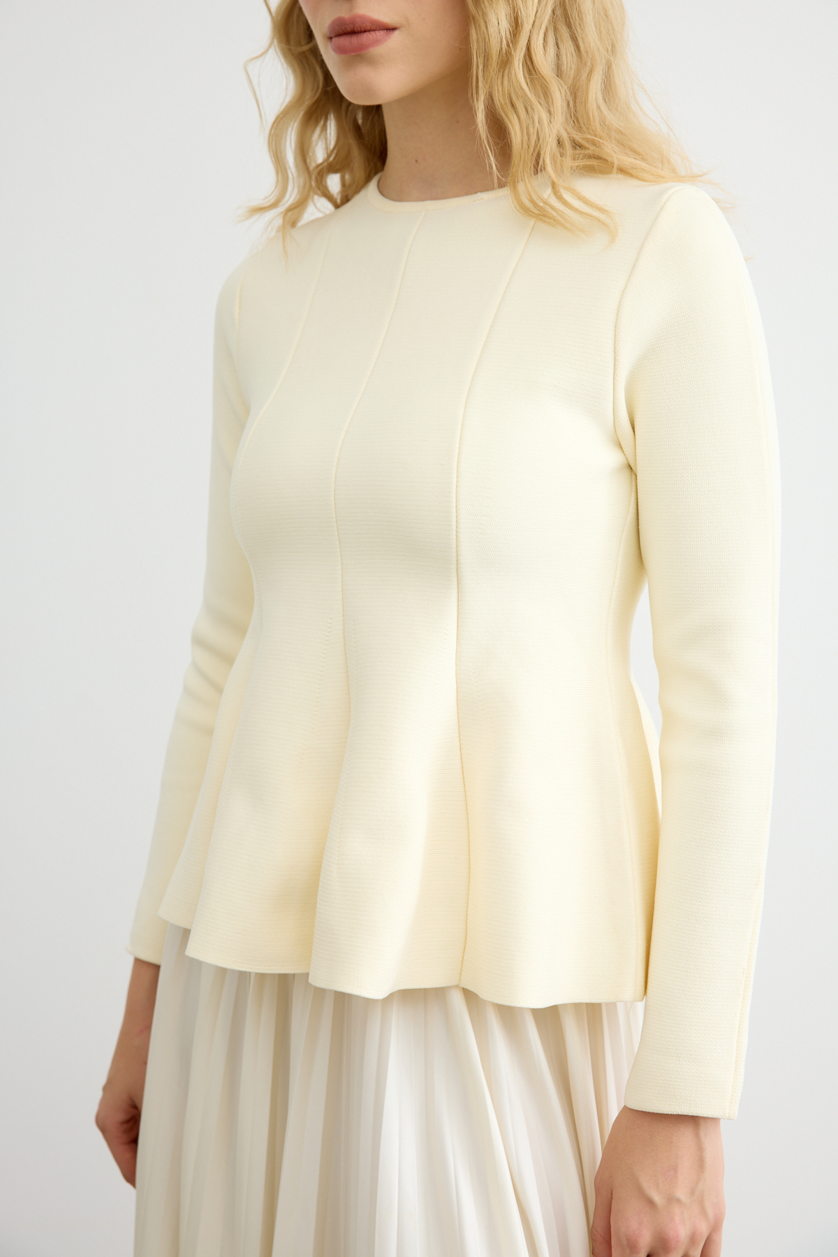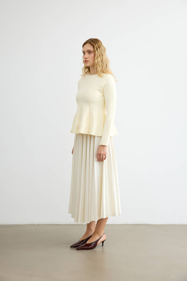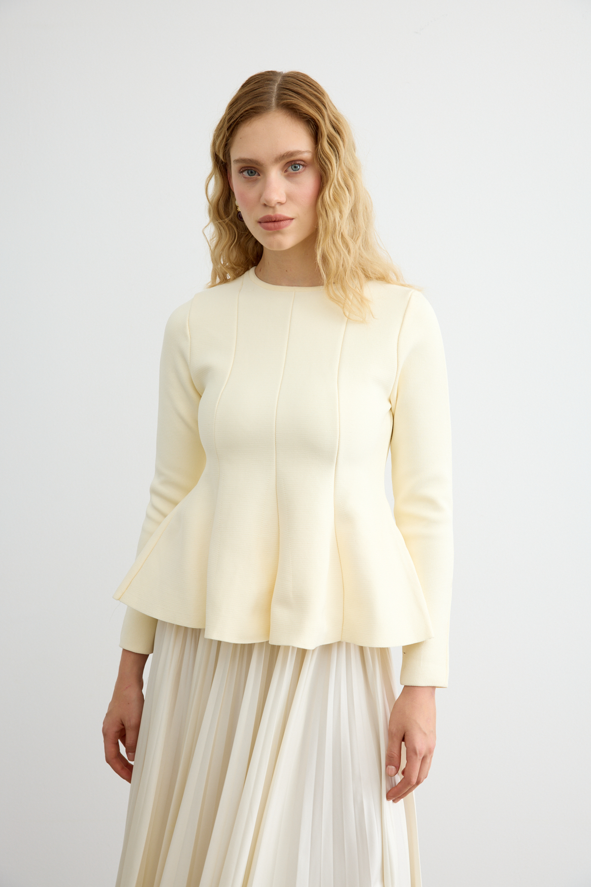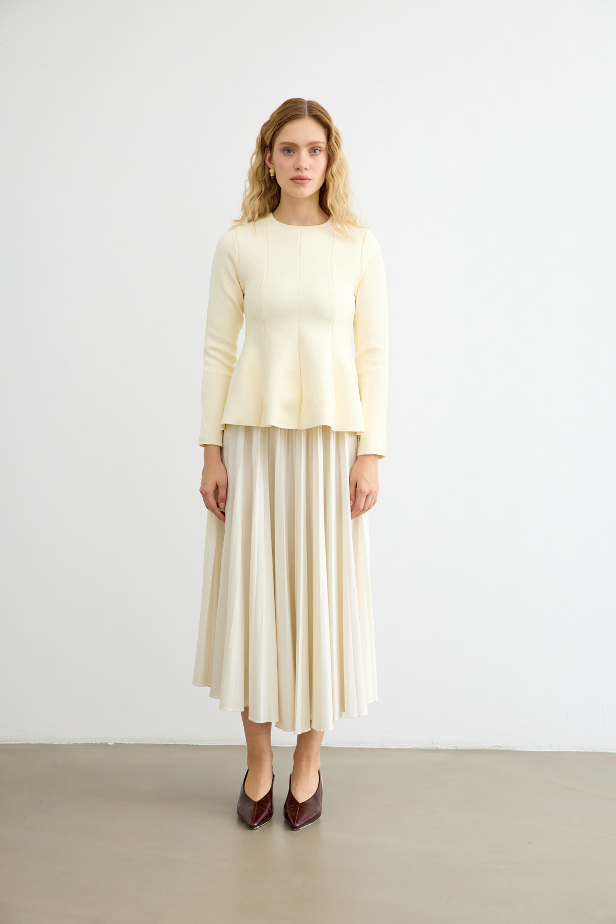 Vücuda oturan formuyla feminen bir siluet yaratan bu bluz, zarif triko dokusuyla öne çıkıyor. Günlük kombinlere modern ve şık bir dokunuş katıyor.