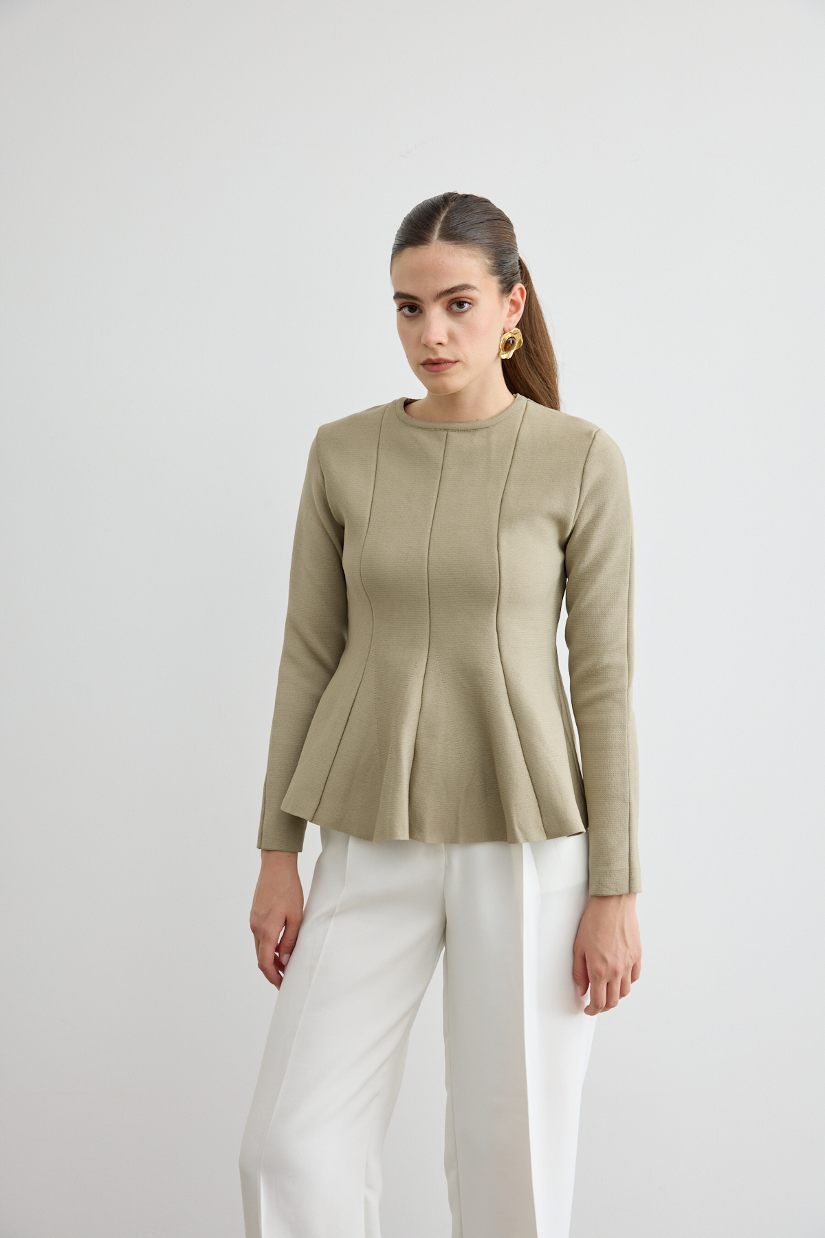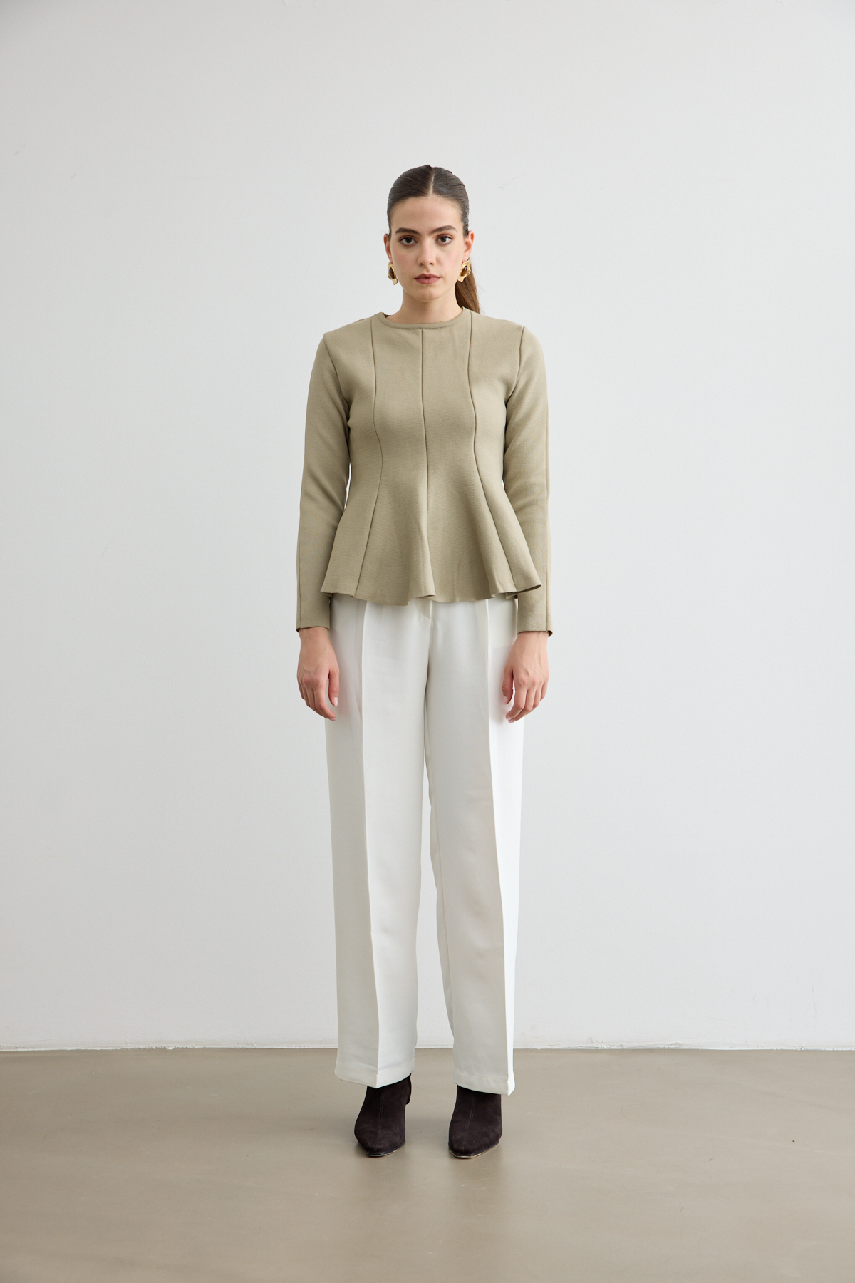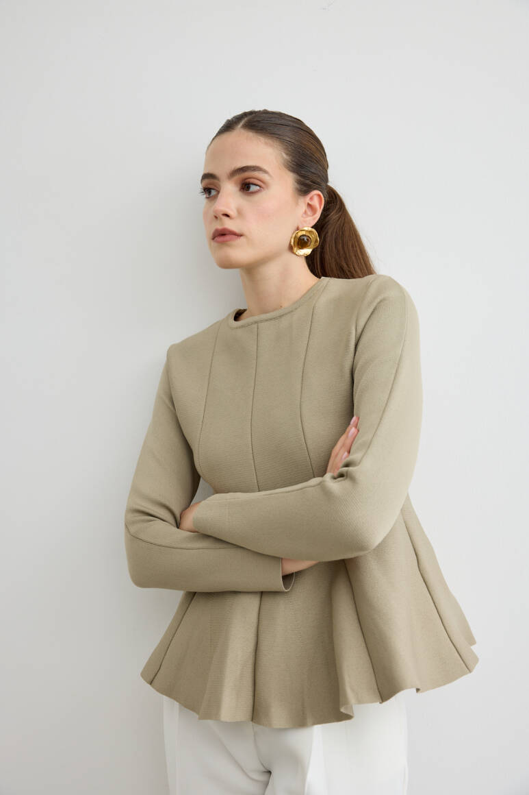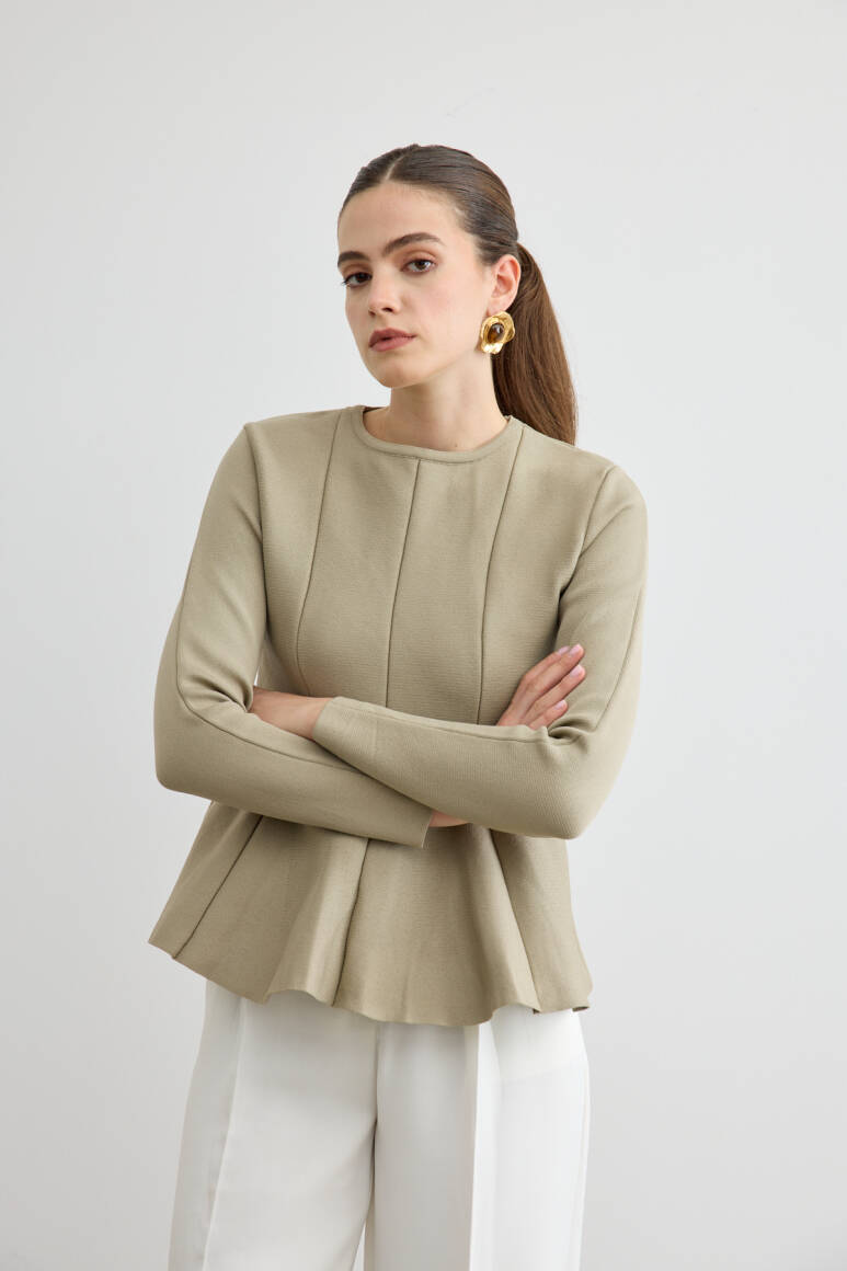 Vücuda oturan formuyla feminen bir siluet yaratan bu bluz, zarif triko dokusuyla öne çıkıyor. Günlük kombinlere modern ve şık bir dokunuş katıyor.