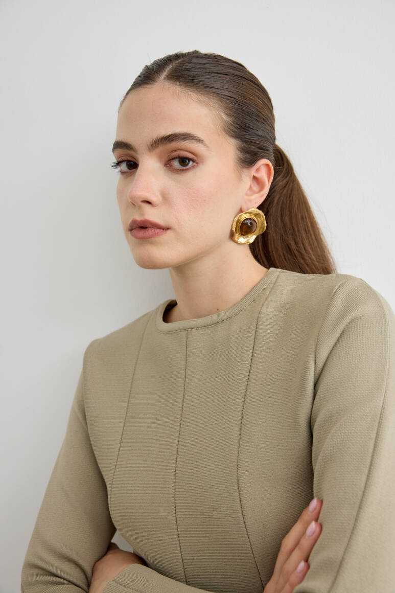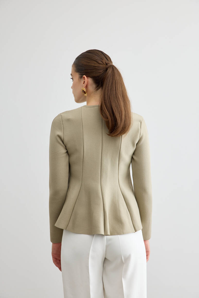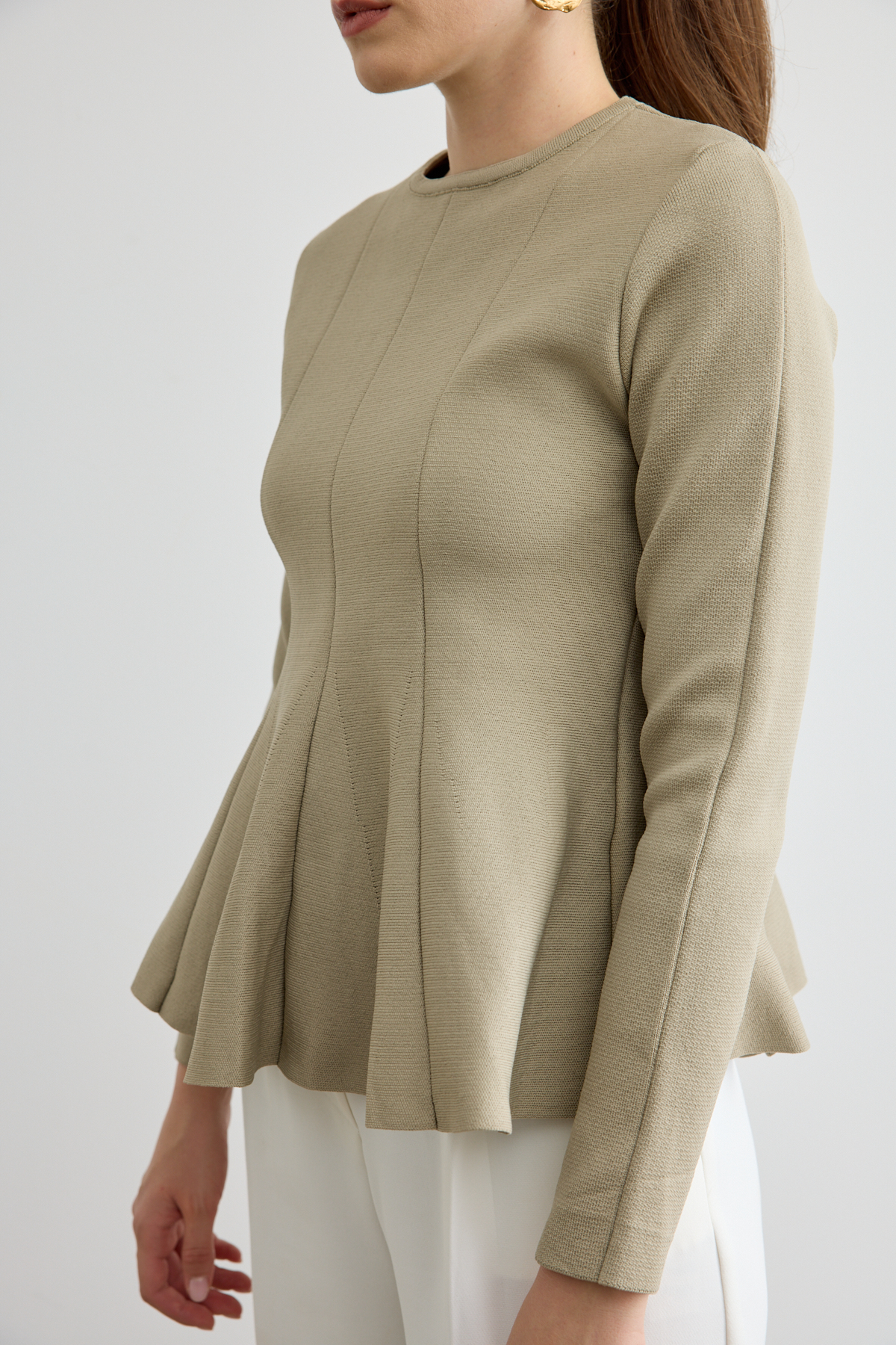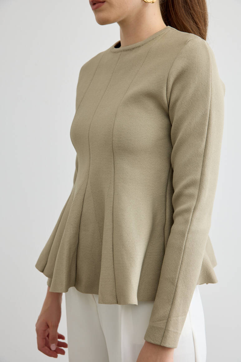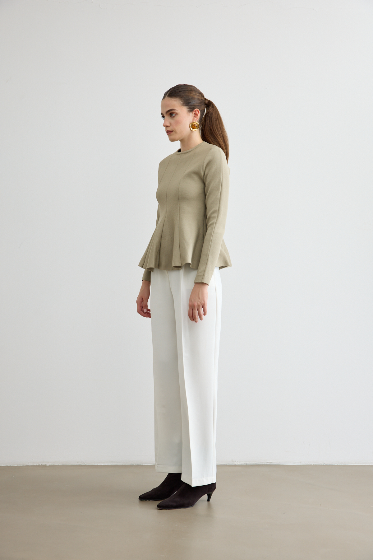 Vücuda oturan formuyla feminen bir siluet yaratan bu bluz, zarif triko dokusuyla öne çıkıyor. Günlük kombinlere modern ve şık bir dokunuş katıyor.