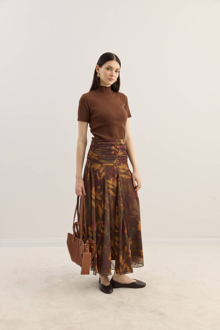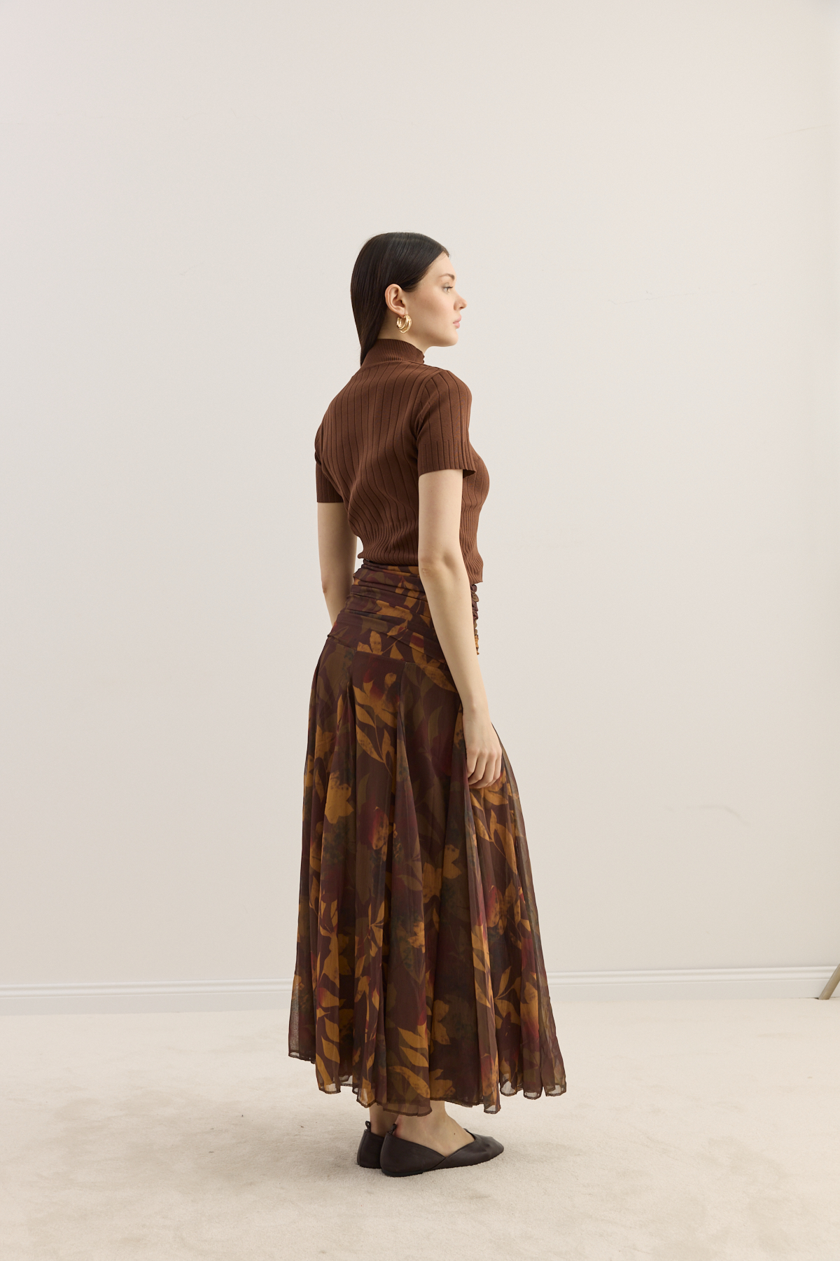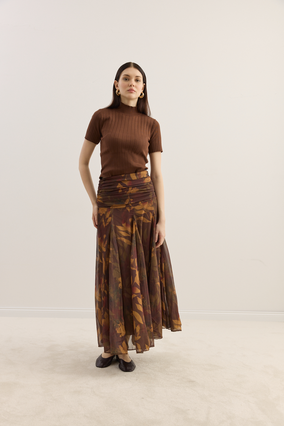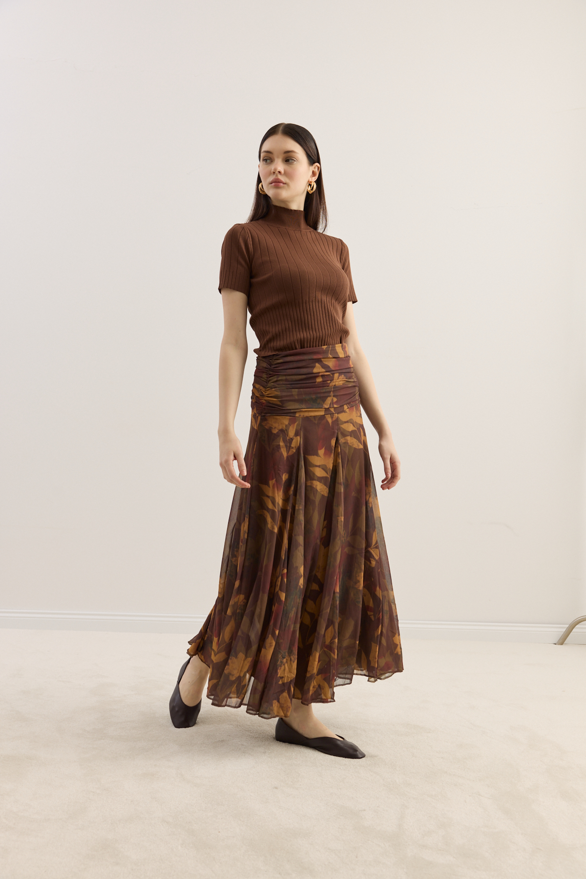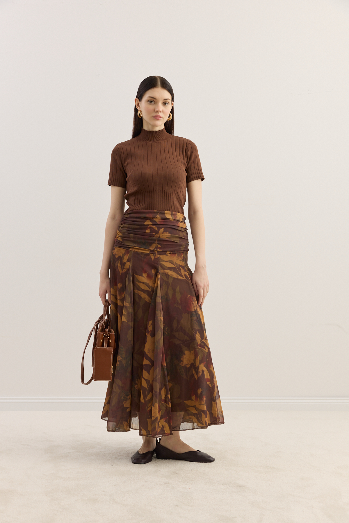 Hafif ve akışkan şifon dokusuyla hareket kazanan şifon etek, doğadan ilham alan yaprak desenleriyle zamansız bir şıklık sunar. Bel kısmındaki toparlayıcı form, silueti dengelerken eteğin dökümlü yapısı feminen bir görünüm yaratır.