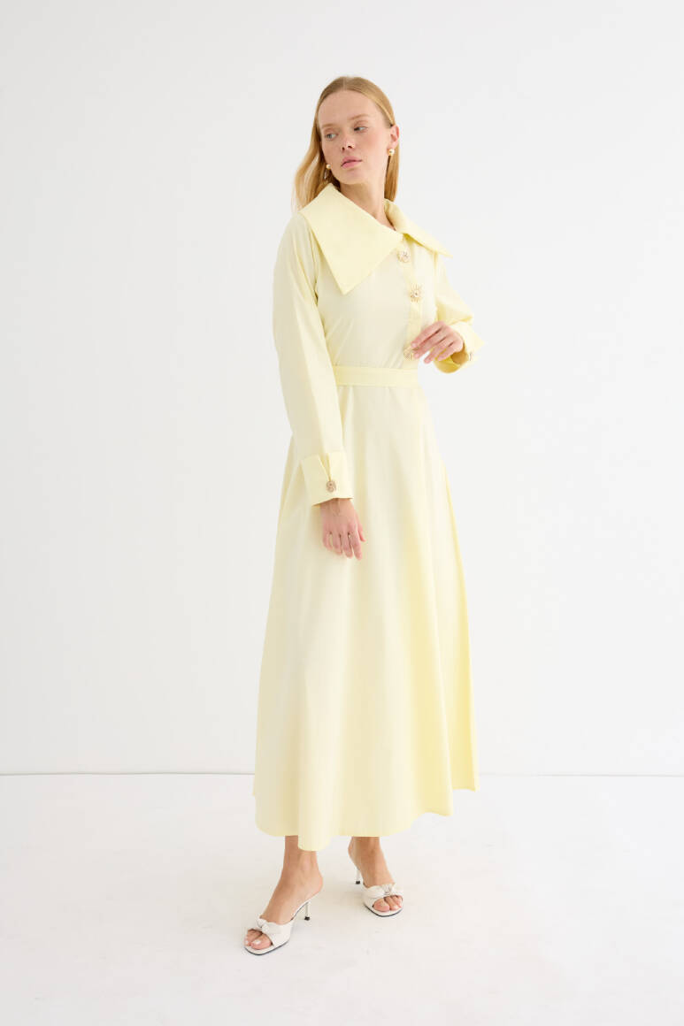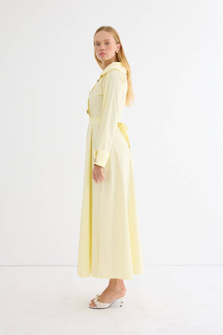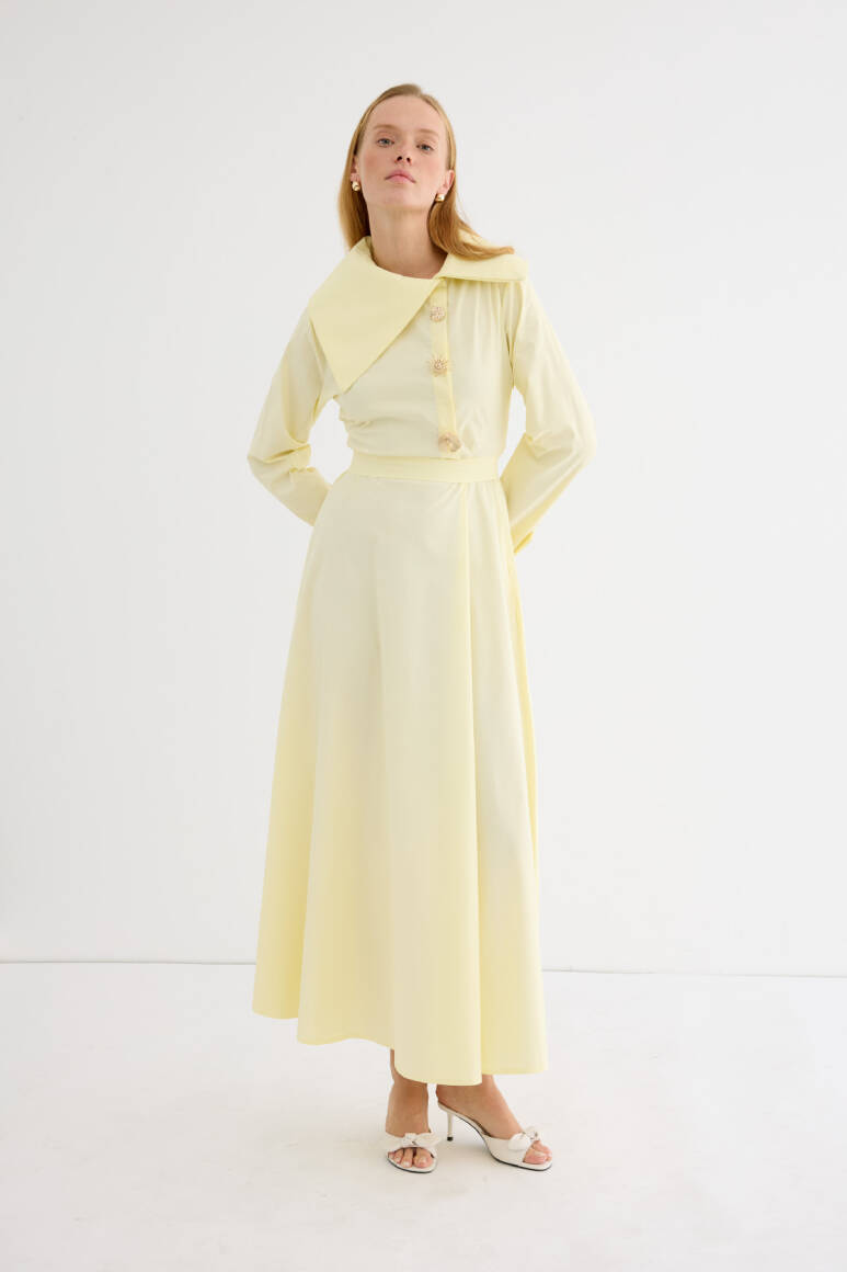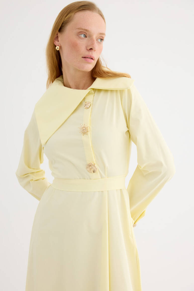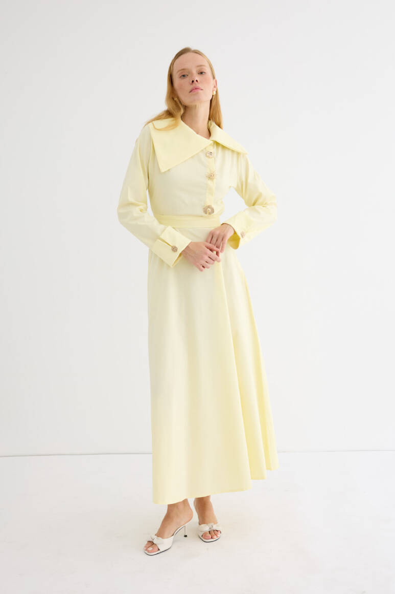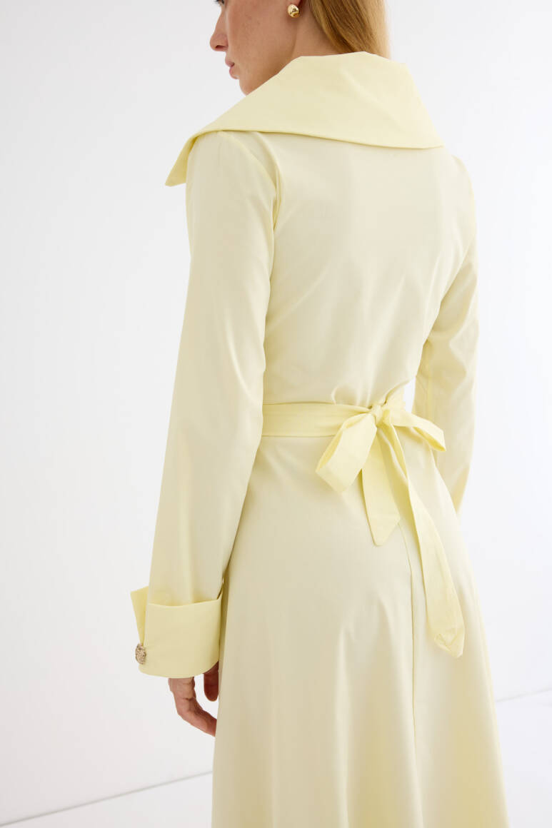 Geniş ve asimetrik yakalı tasarım, uzun kol, manşet düğmeli, ön kısmında yer alan özel tasarım broşları ve altındaki gizli düğme kapaması