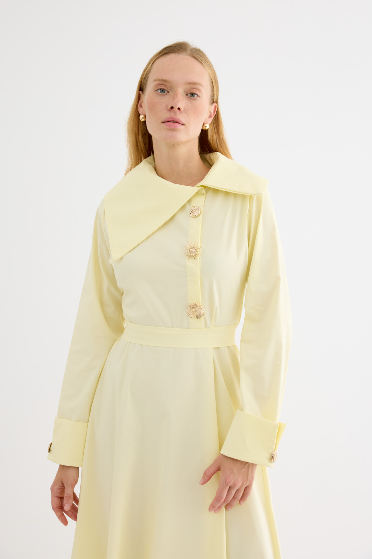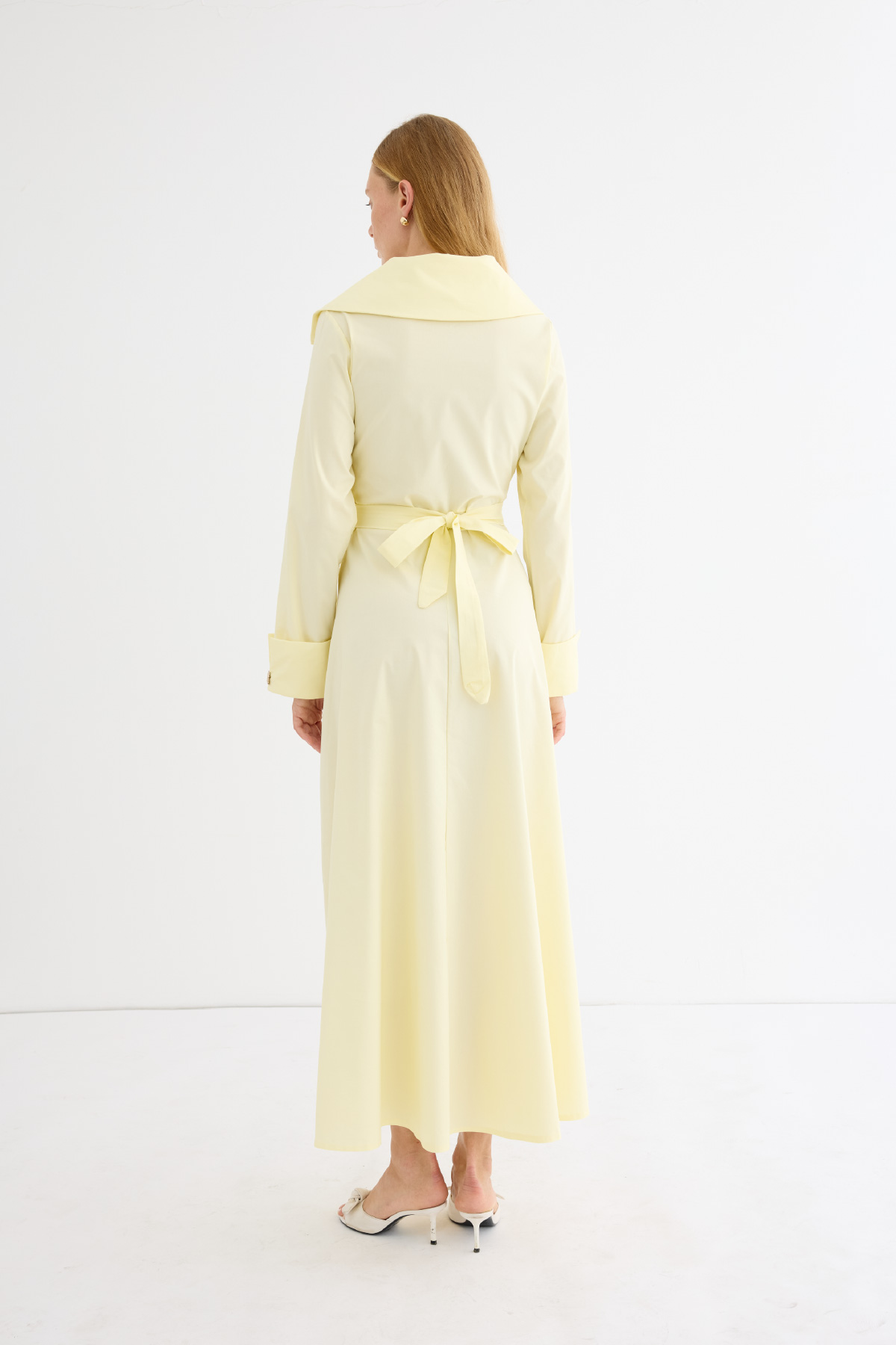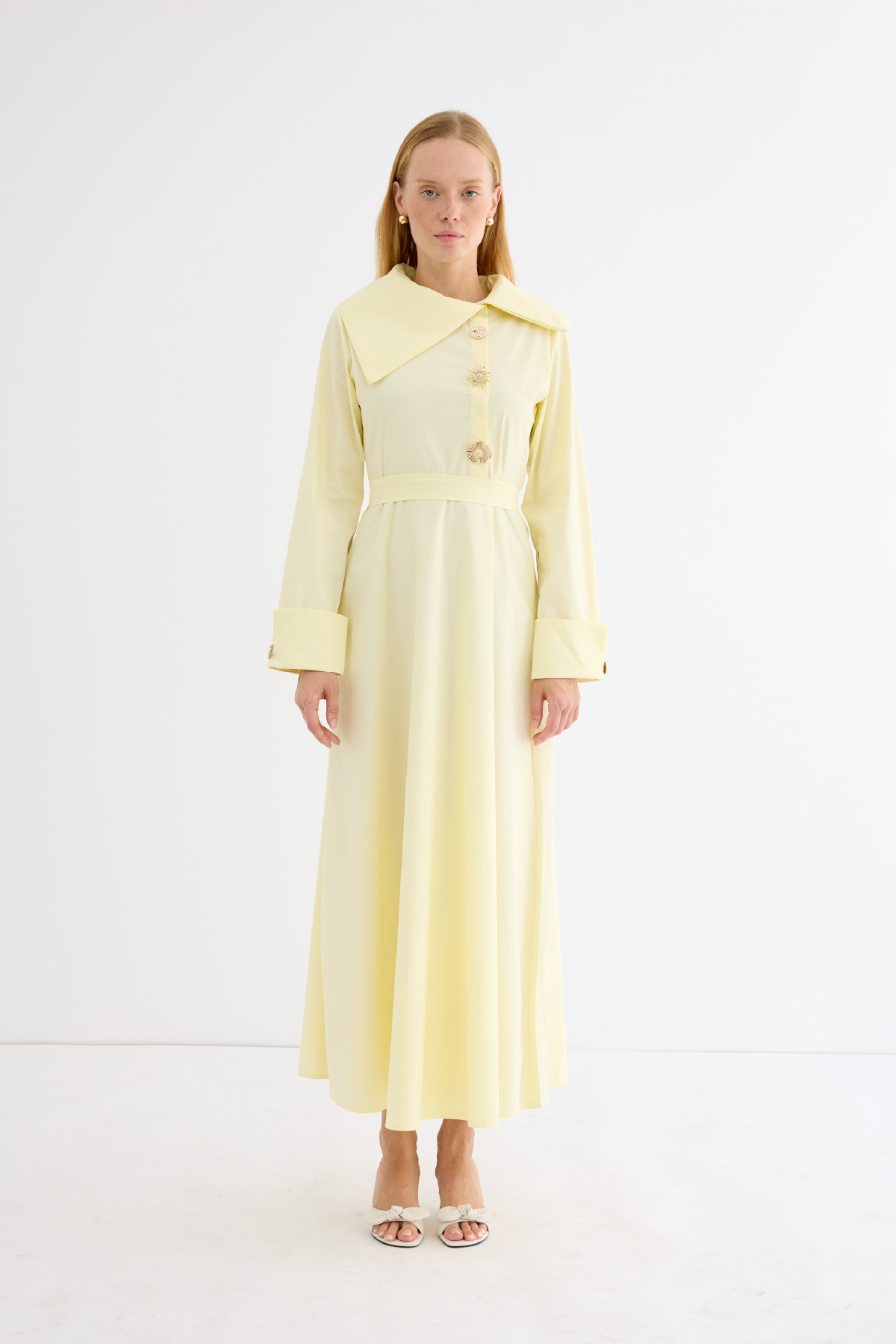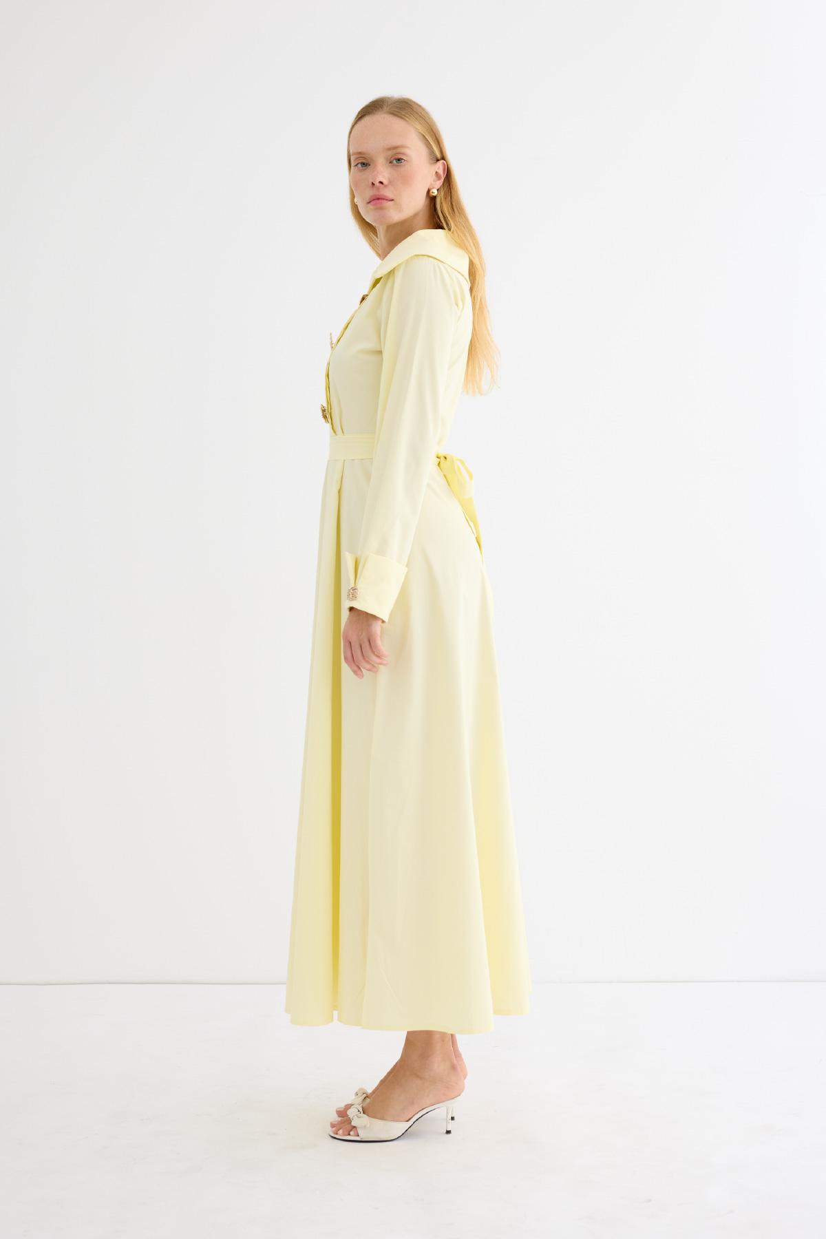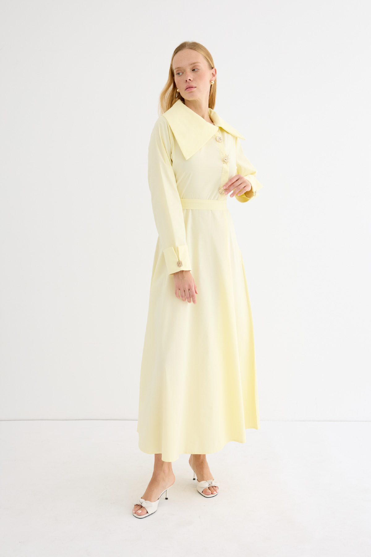 Geniş ve asimetrik yakalı tasarım, uzun kol, manşet düğmeli, ön kısmında yer alan özel tasarım broşları ve altındaki gizli düğme kapaması