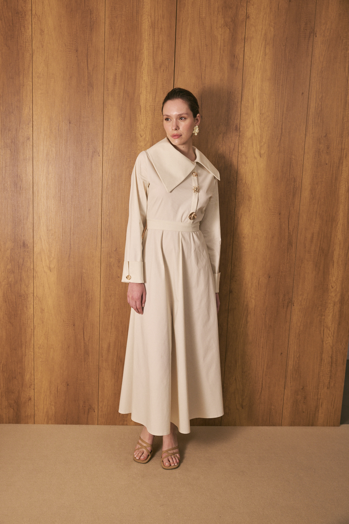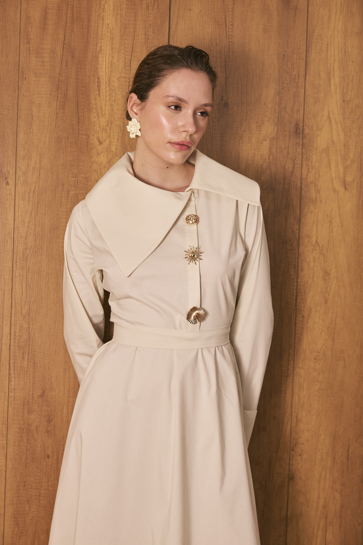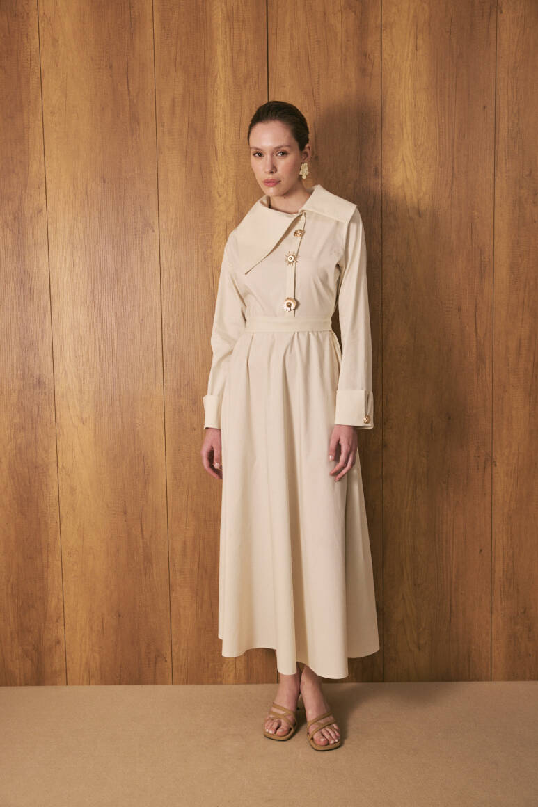 Geniş ve asimetrik yakalı tasarım, uzun kol, manşet düğmeli, ön kısmında yer alan özel tasarım broşları ve altındaki gizli düğme kapaması