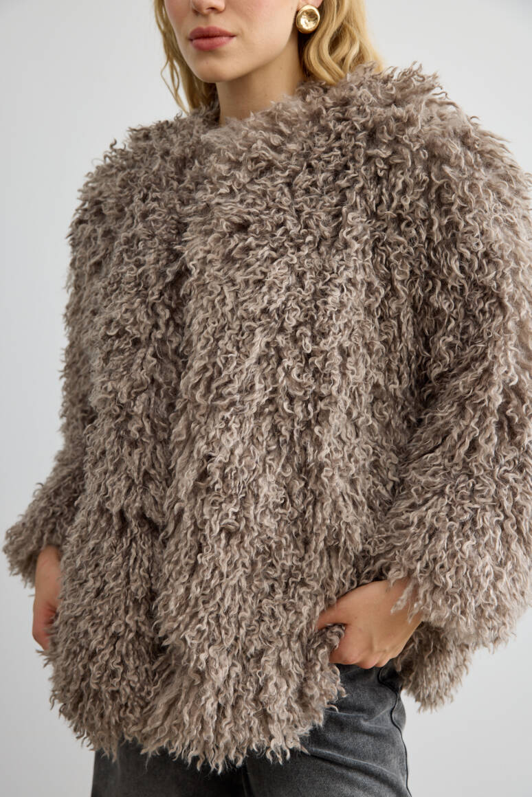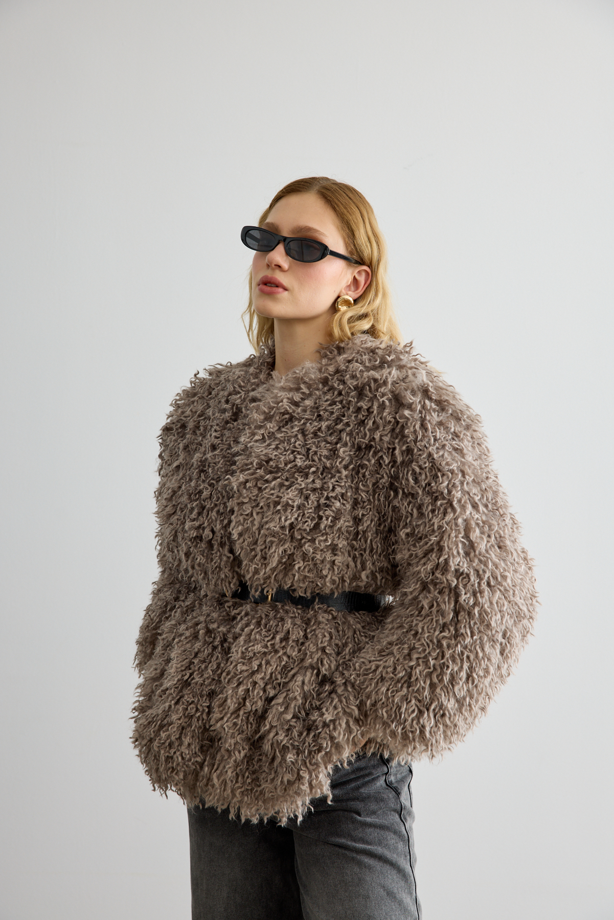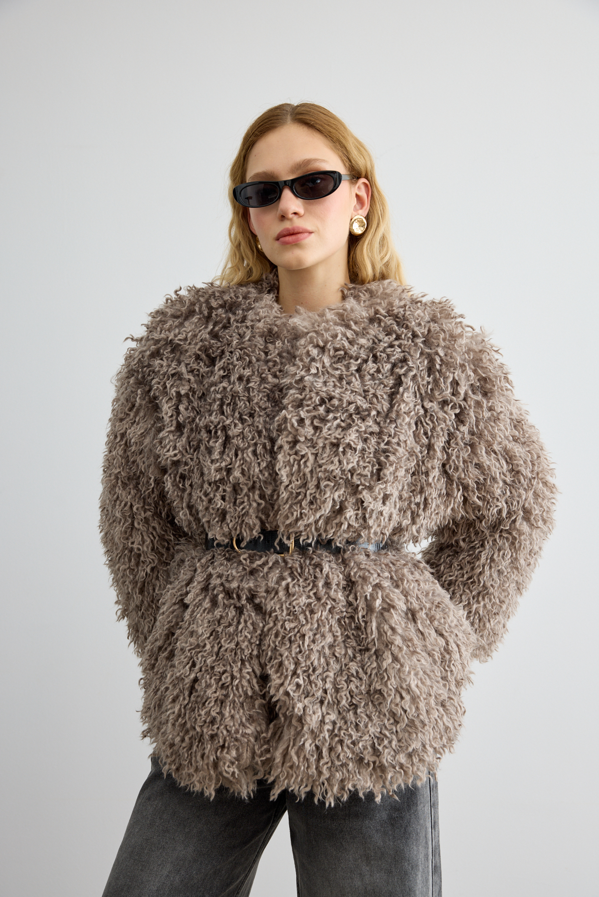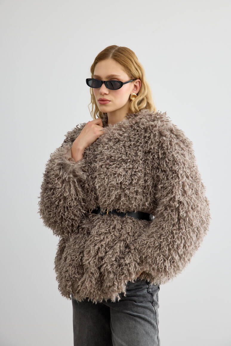 Modern dokusu ve hacimli görünümüyle öne çıkan bu bürümcük kürk, stilinize özgün bir karakter katıyor. Yumuşak yapısı sayesinde sıcak tutarken, sofistike duruşuyla her kombine zarif bir tamamlayıcı oluyor.