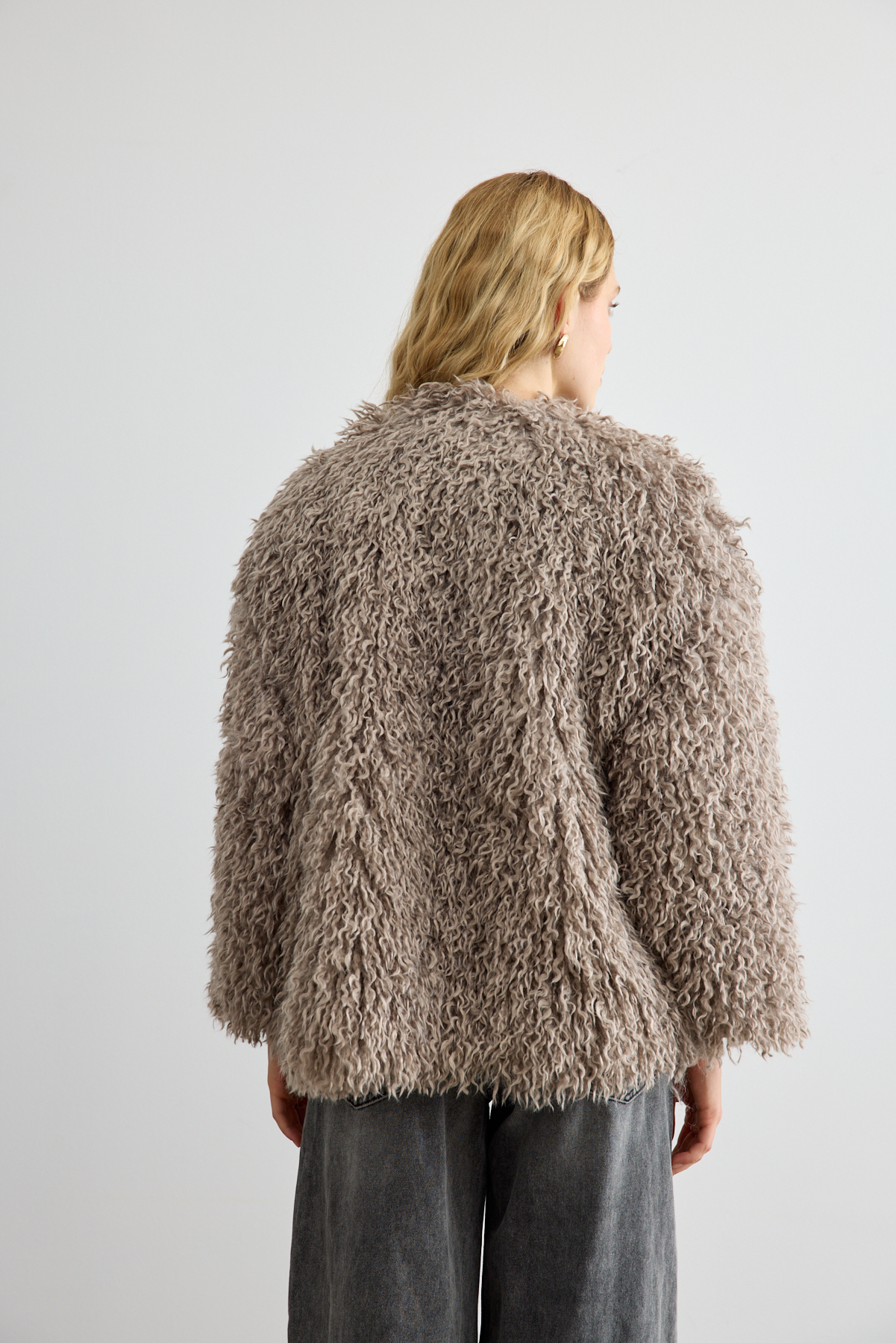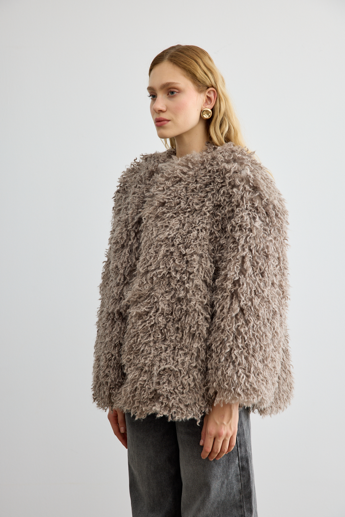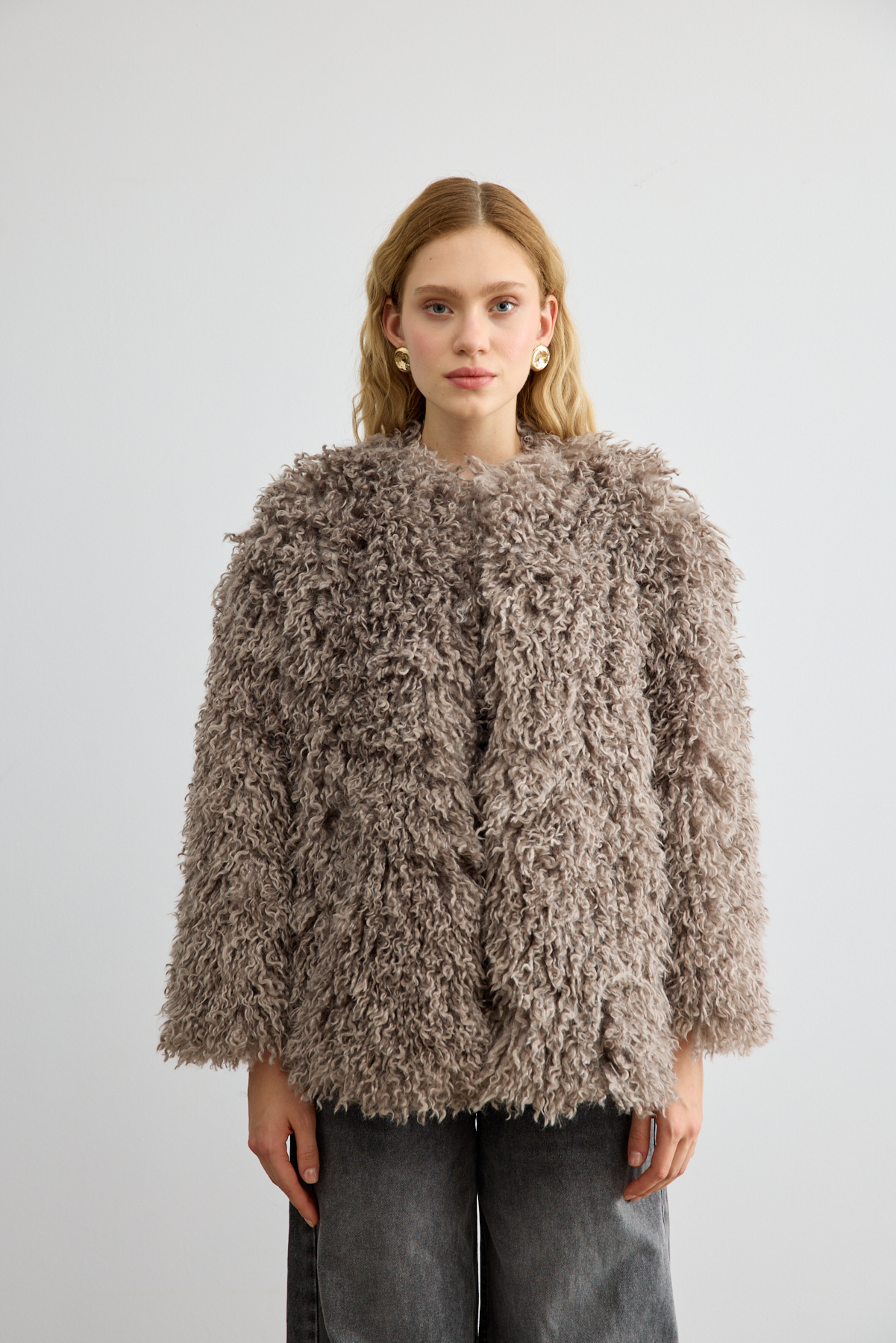Modern dokusu ve hacimli görünümüyle öne çıkan bu bürümcük kürk, stilinize özgün bir karakter katıyor. Yumuşak yapısı sayesinde sıcak tutarken, sofistike duruşuyla her kombine zarif bir tamamlayıcı oluyor.