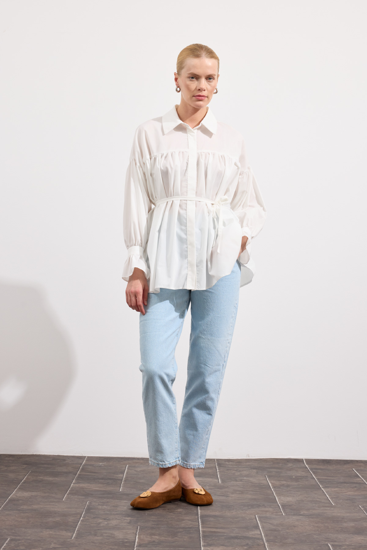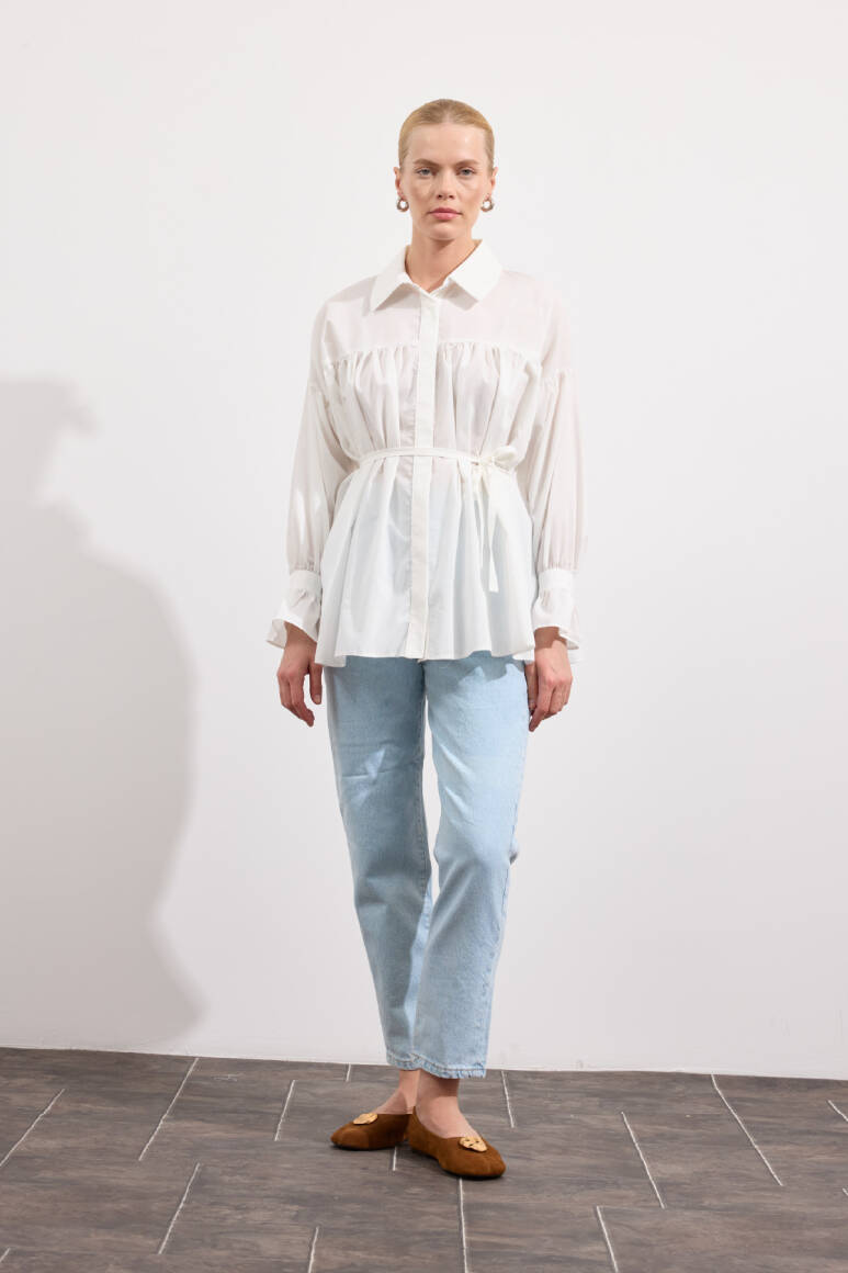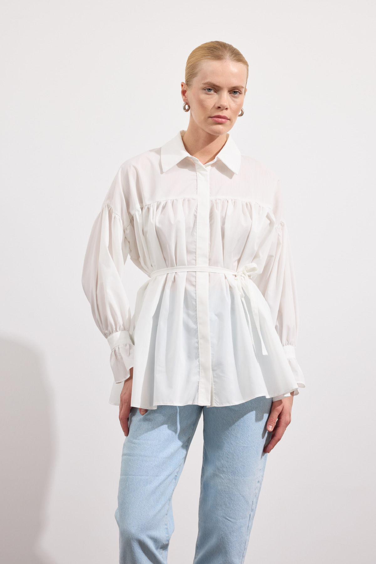 Beden boyunca büzgü detayı, pamuk içerikli, bel kısmı ip biyeli, gizli pat düğmeli, kol manşeti büzgülü ekstra parçalı.
