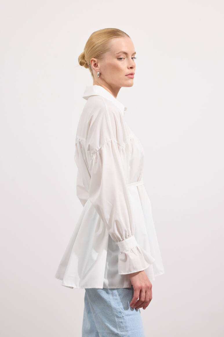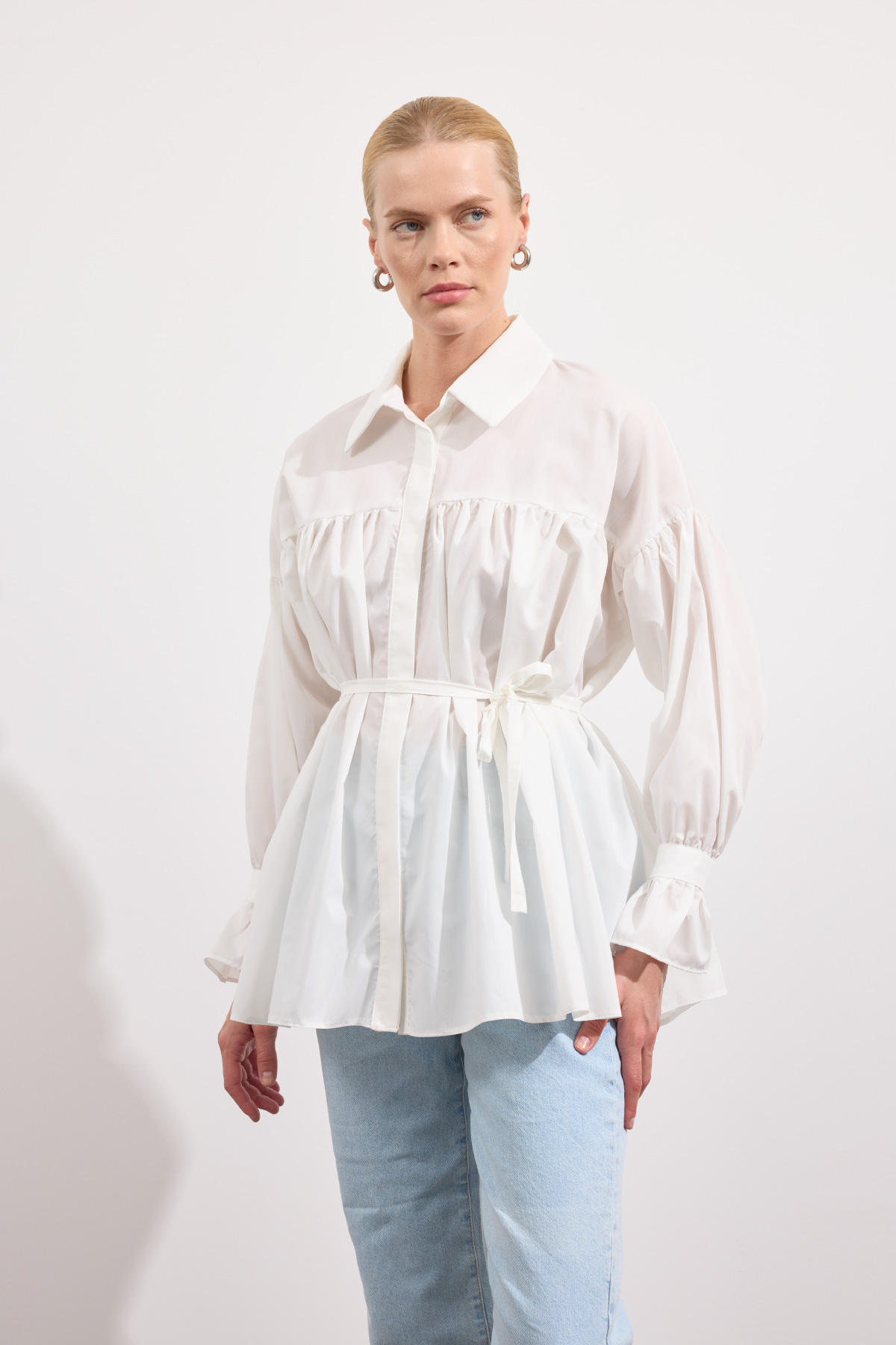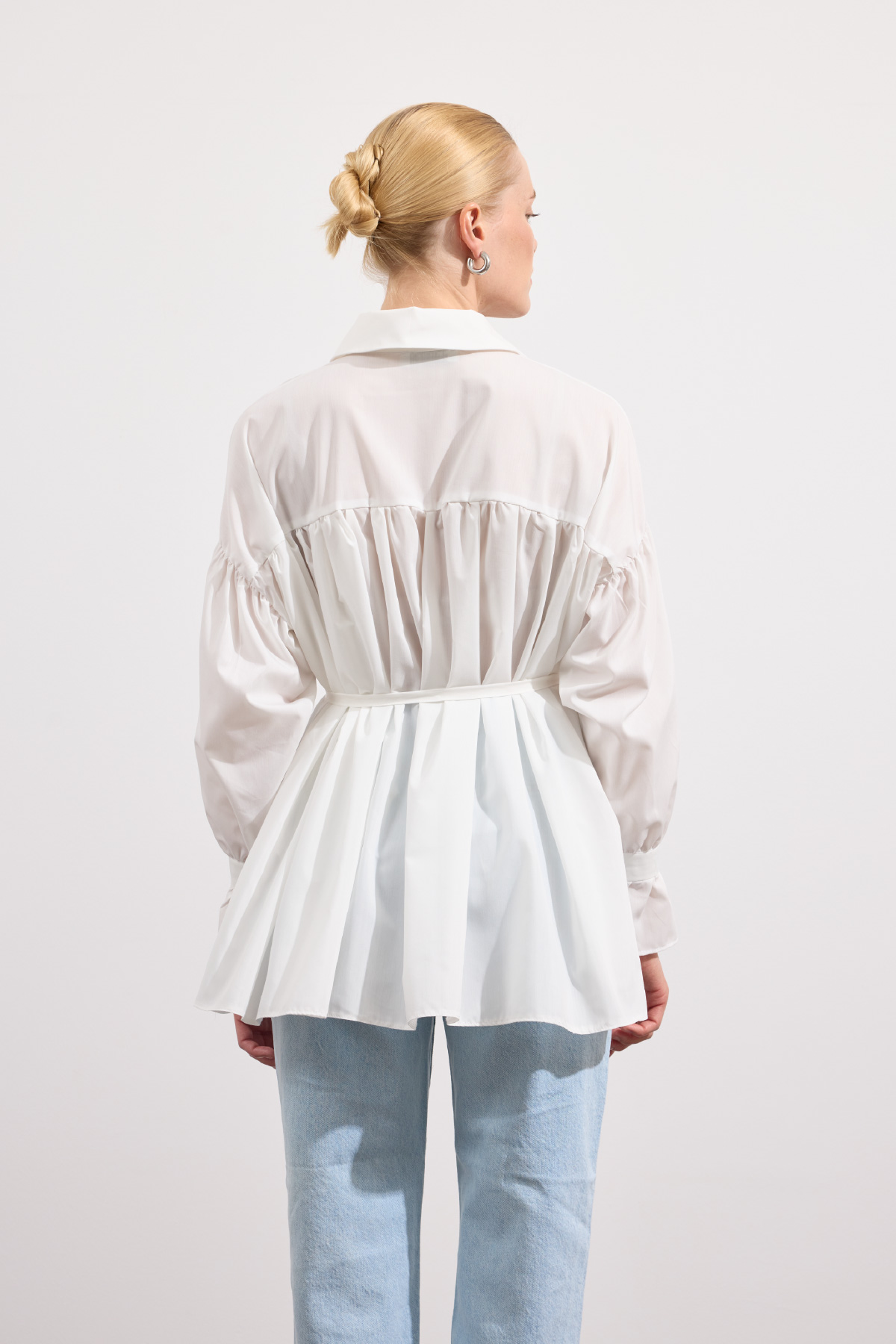 Beden boyunca büzgü detayı, pamuk içerikli, bel kısmı ip biyeli, gizli pat düğmeli, kol manşeti büzgülü ekstra parçalı.