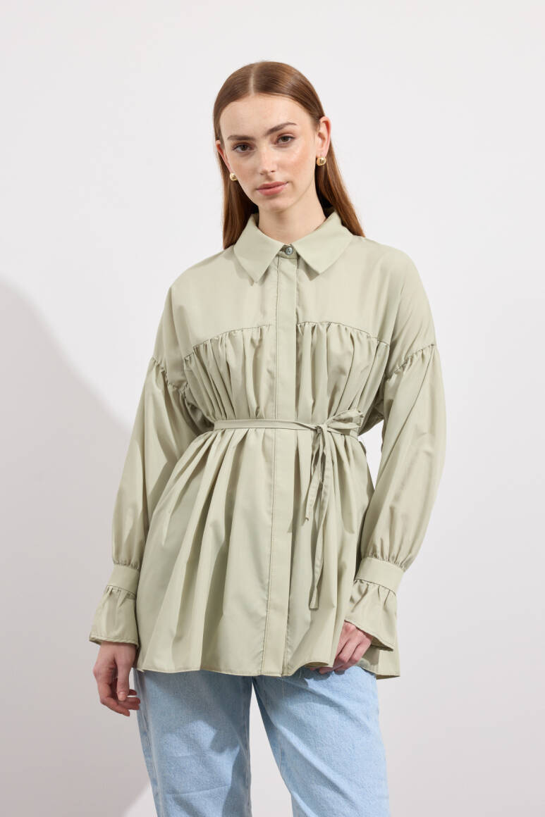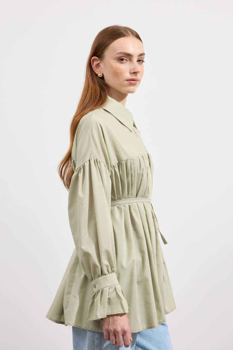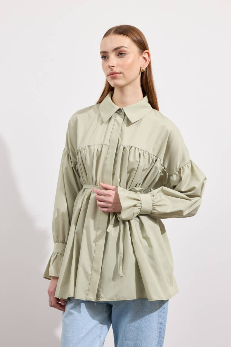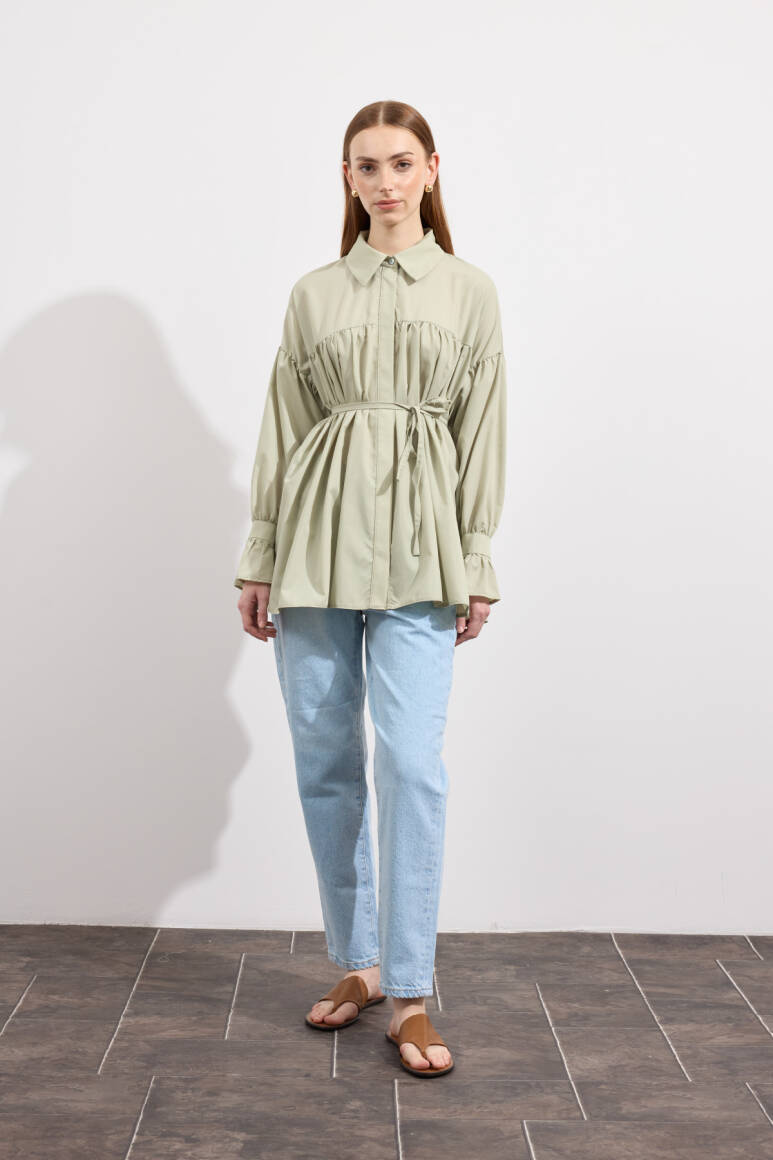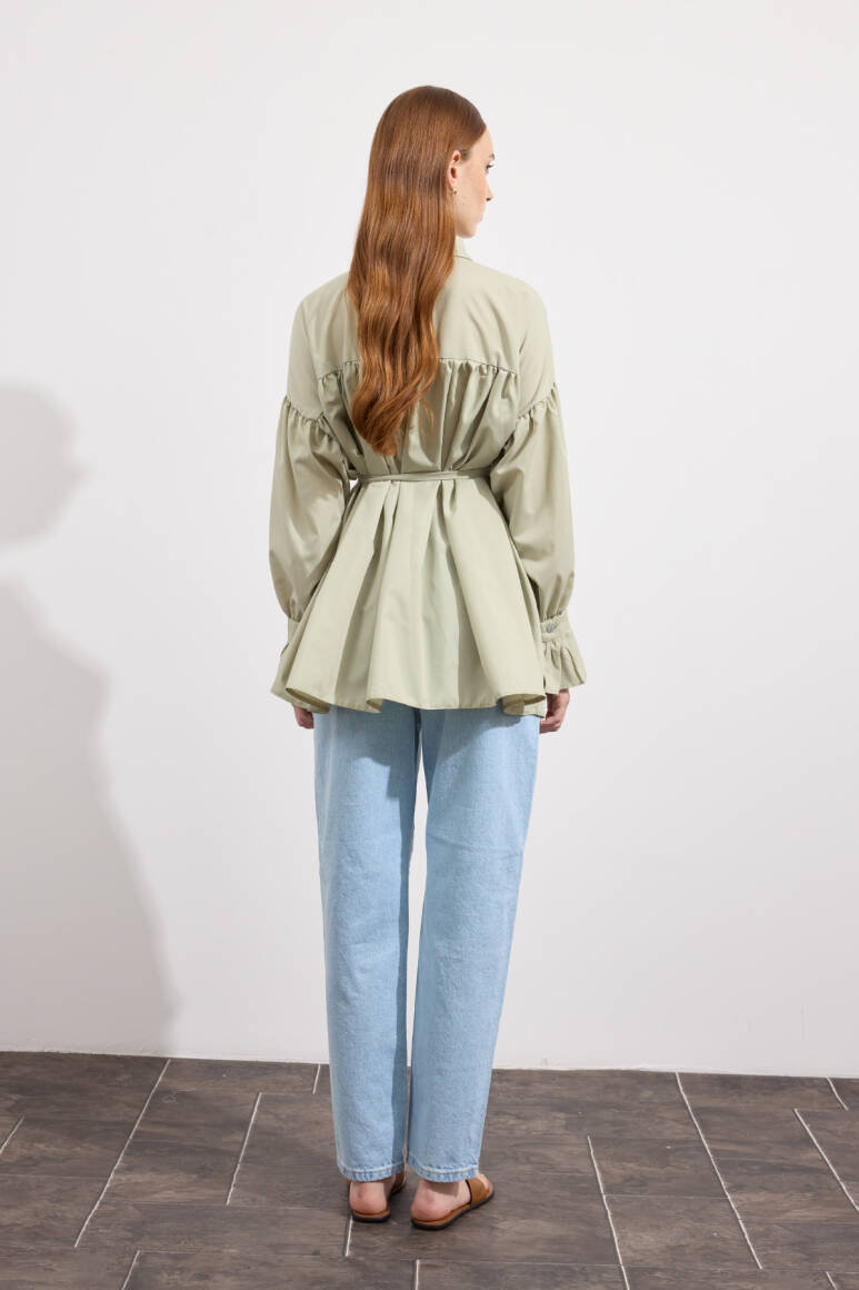 Beden boyunca büzgü detayı, pamuk içerikli, bel kısmı ip biyeli, gizli pat düğmeli, kol manşeti büzgülü ekstra parçalı.