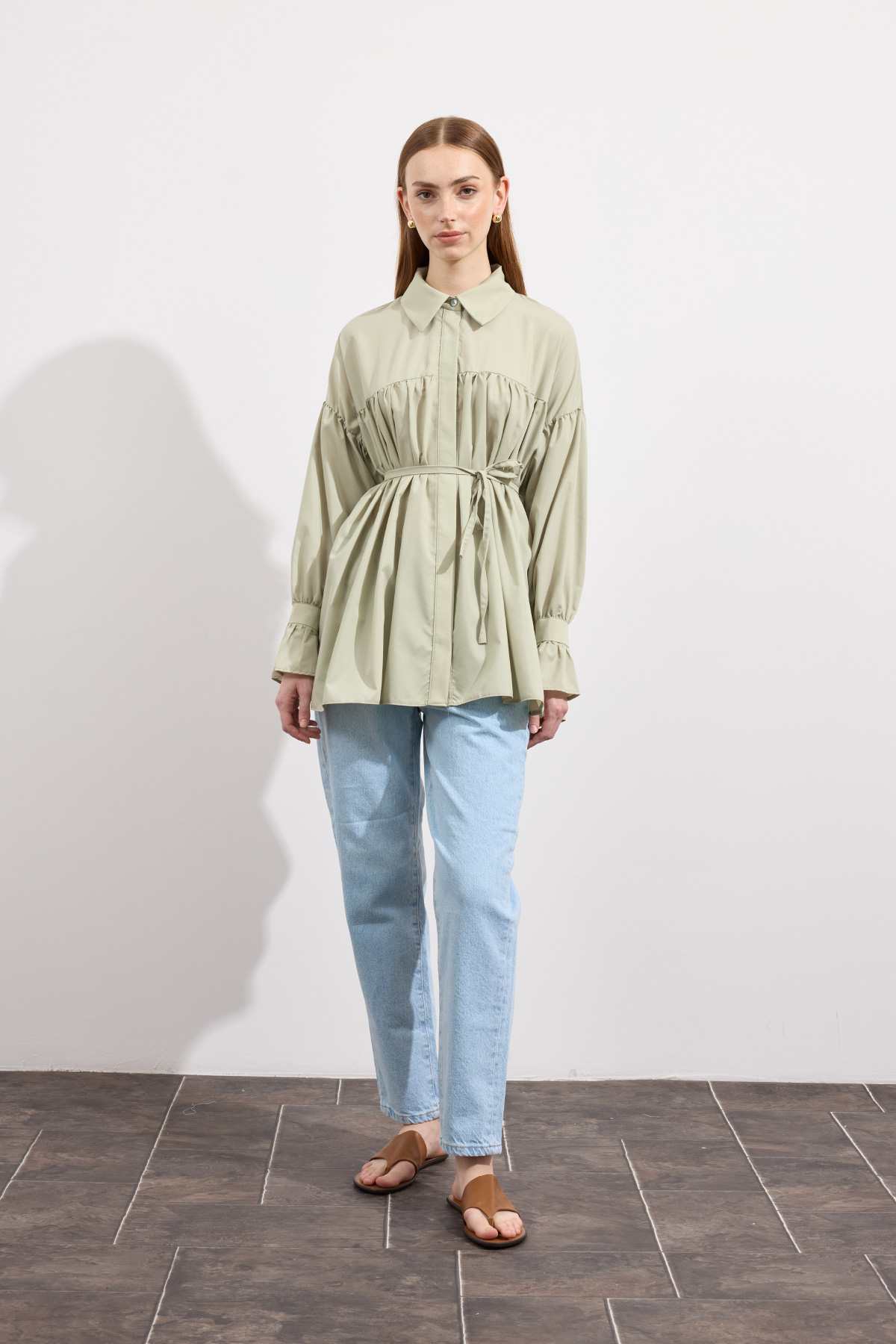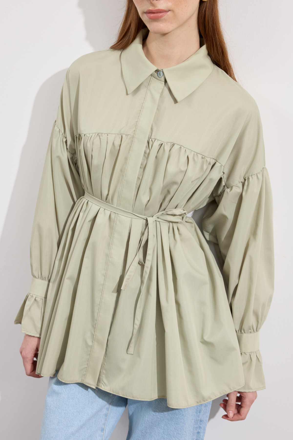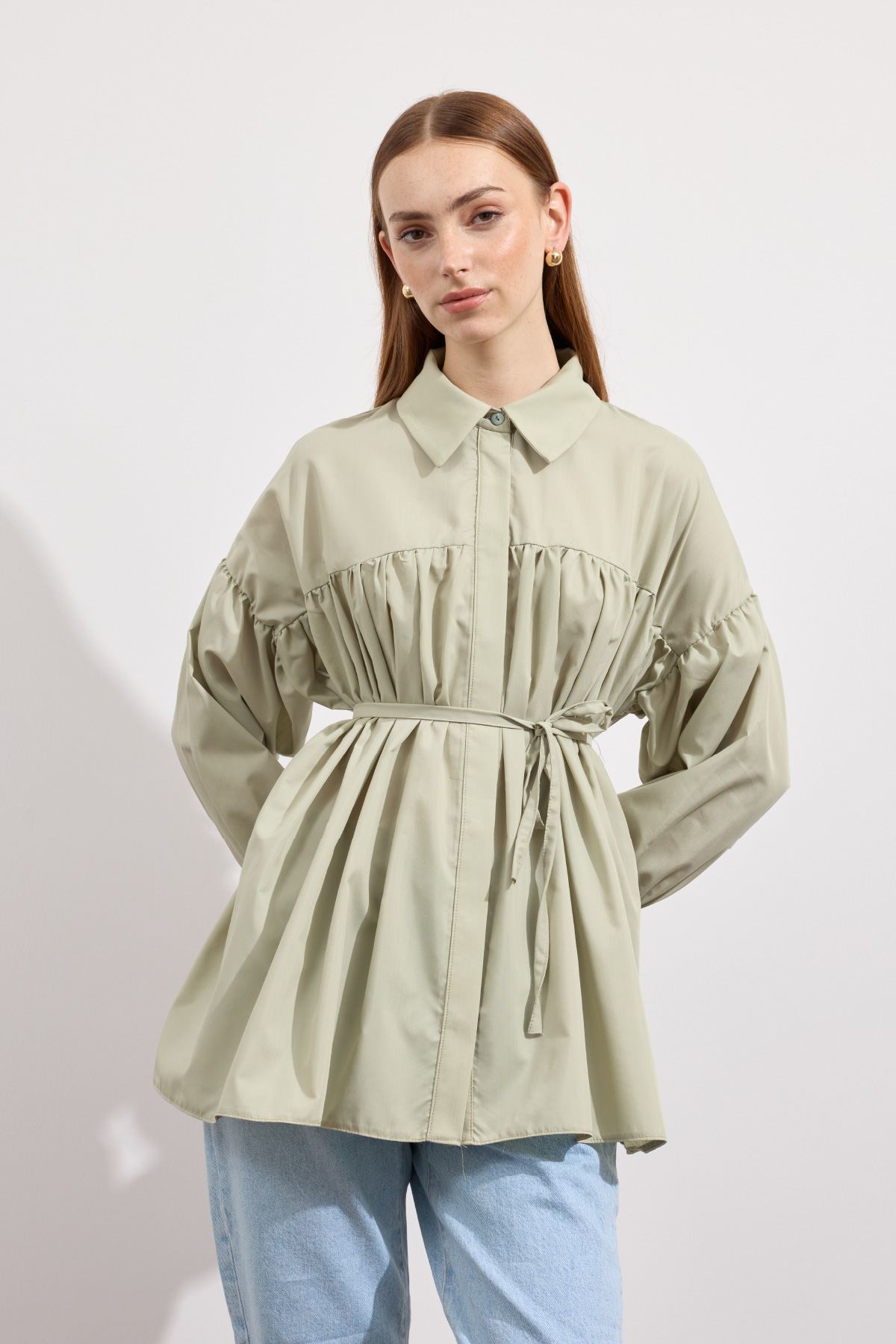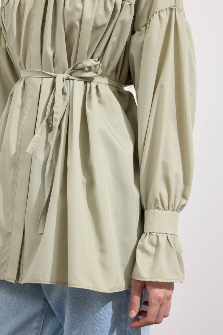 Beden boyunca büzgü detayı, pamuk içerikli, bel kısmı ip biyeli, gizli pat düğmeli, kol manşeti büzgülü ekstra parçalı.