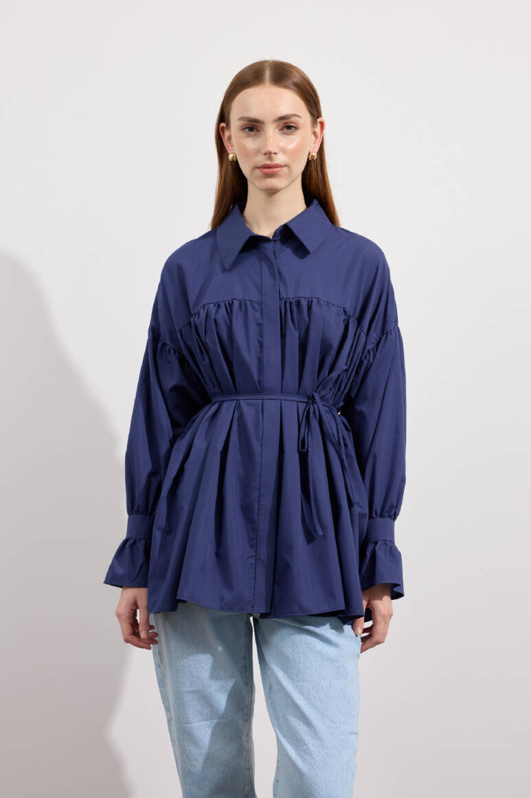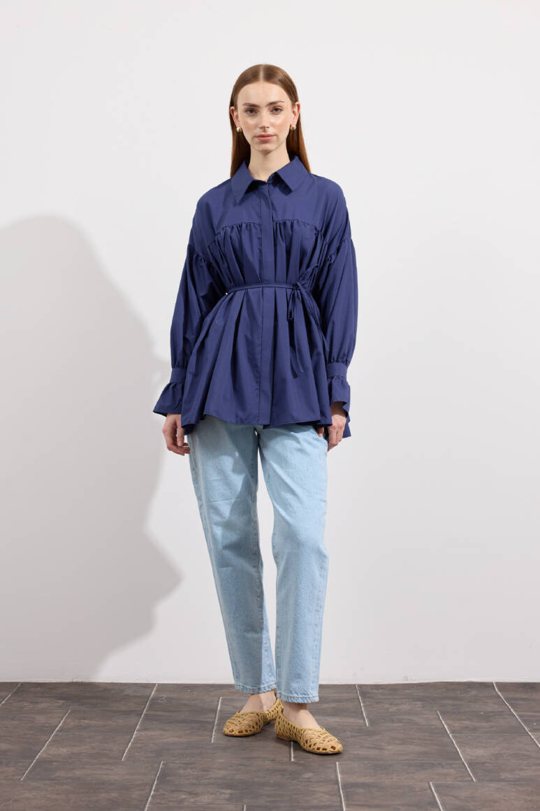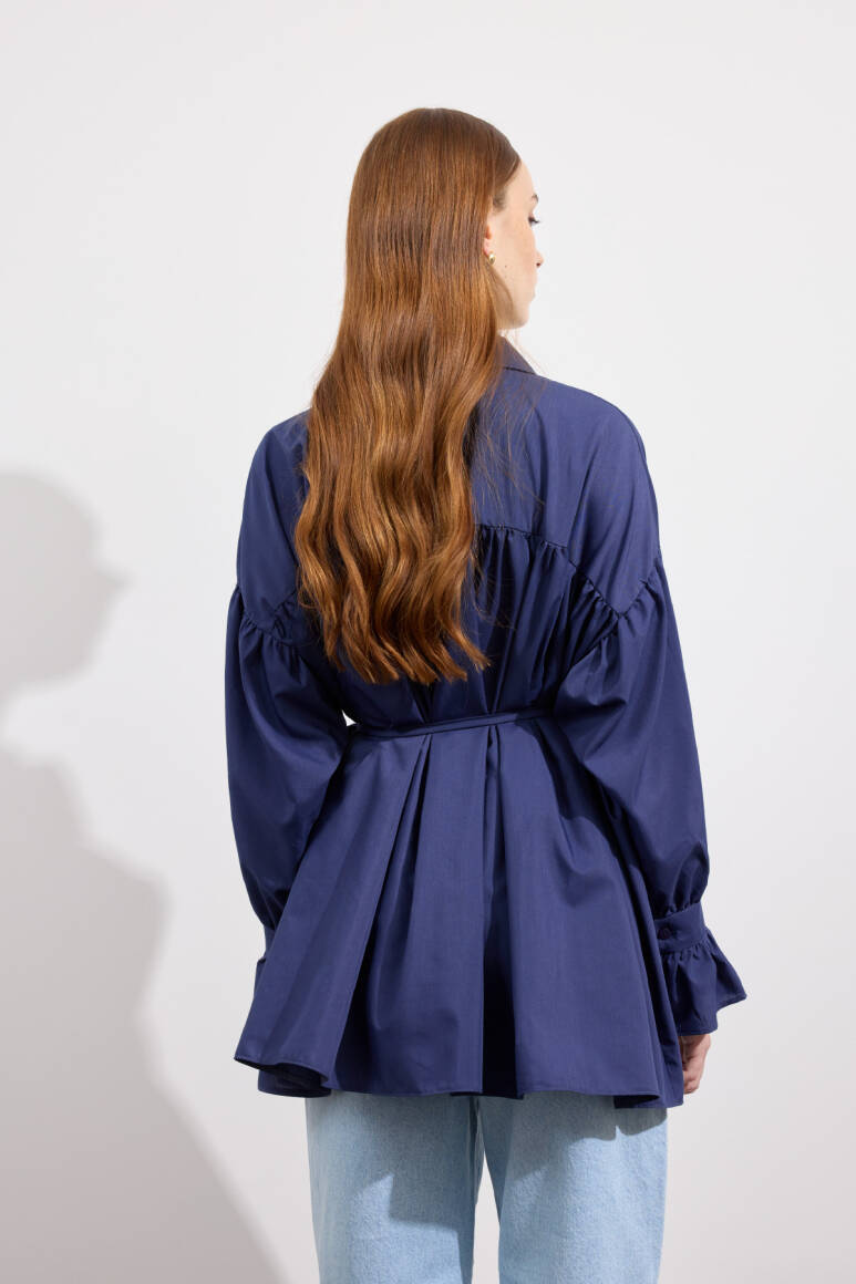 Beden boyunca büzgü detayı, pamuk içerikli, bel kısmı ip biyeli, gizli pat düğmeli, kol manşeti büzgülü ekstra parçalı.