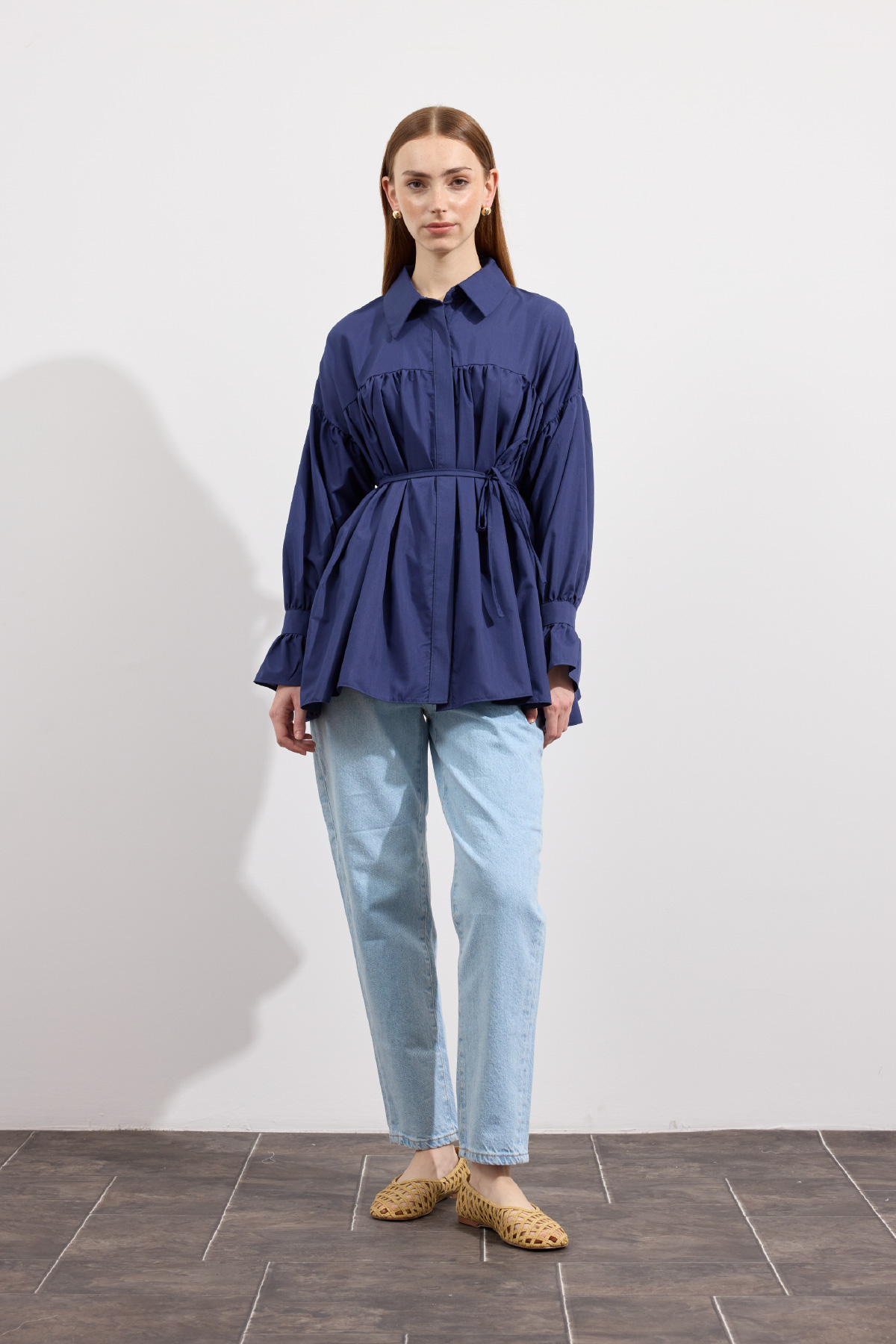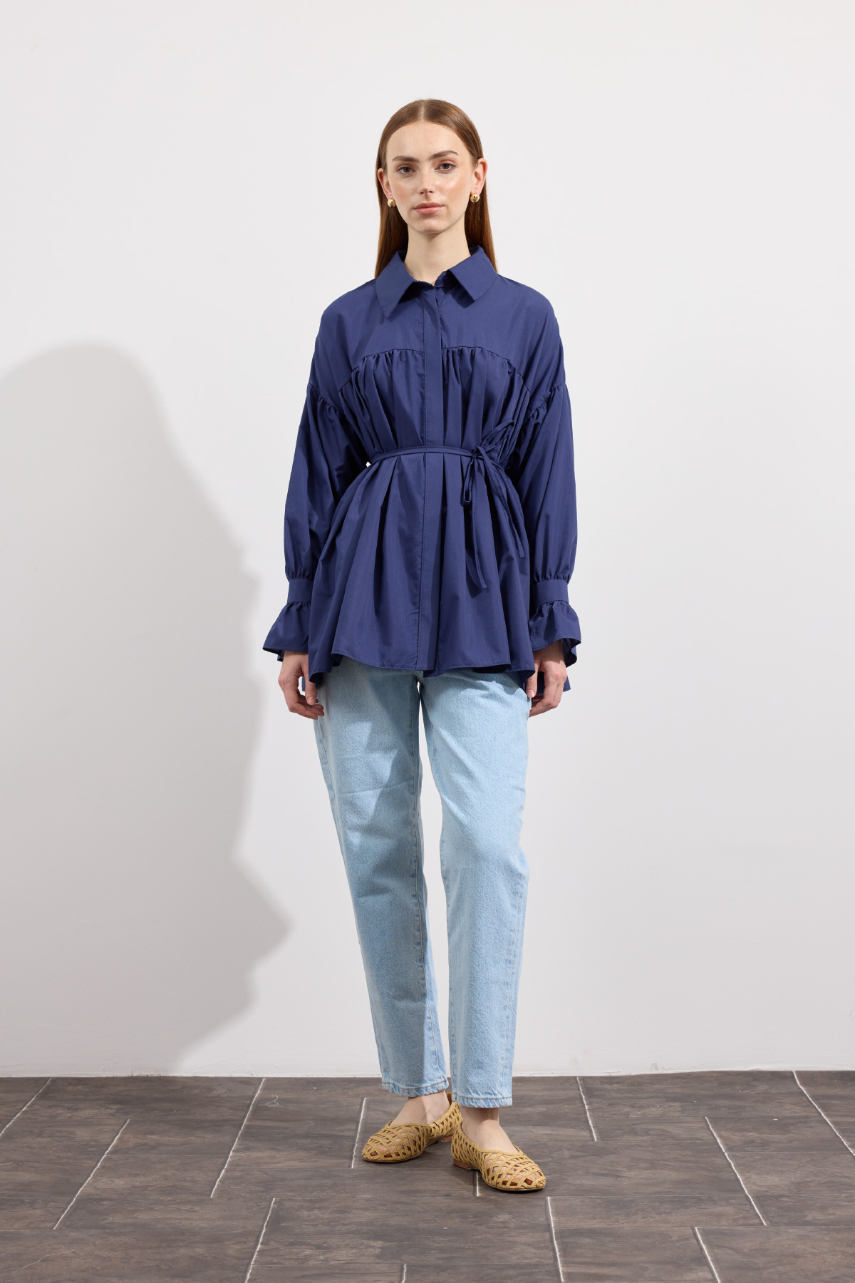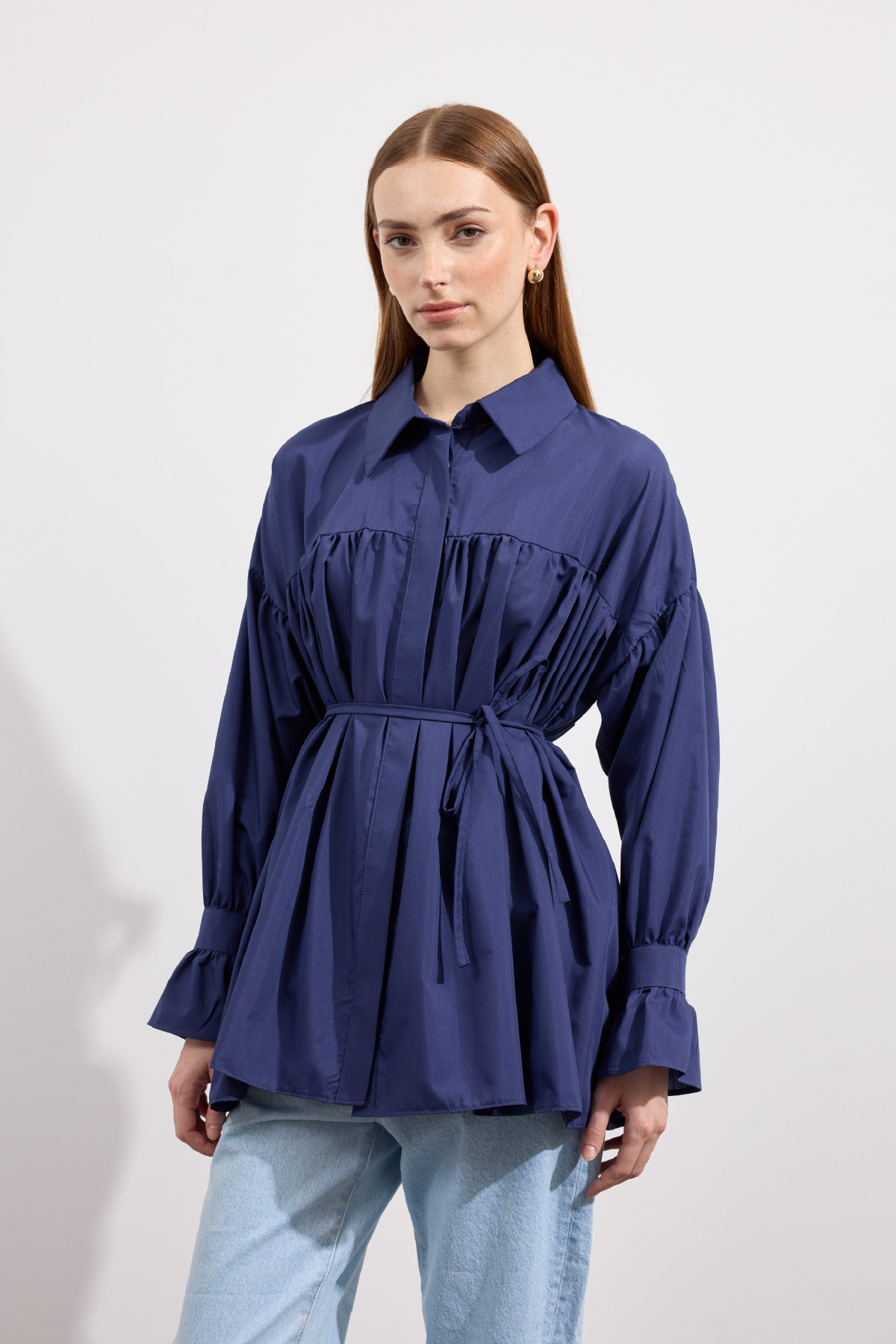 Beden boyunca büzgü detayı, pamuk içerikli, bel kısmı ip biyeli, gizli pat düğmeli, kol manşeti büzgülü ekstra parçalı.
