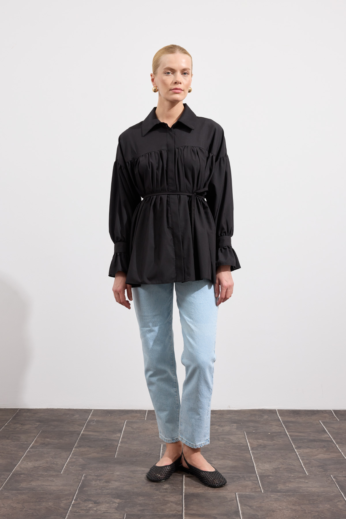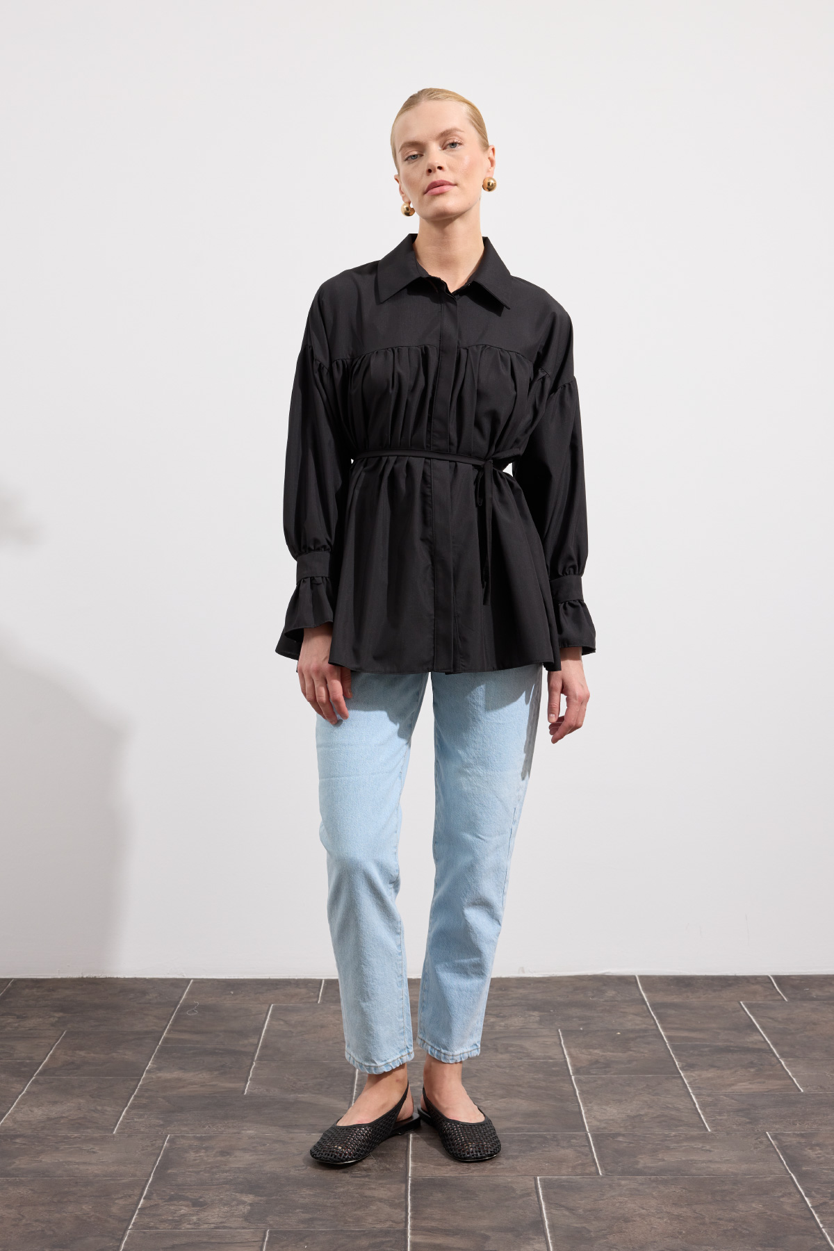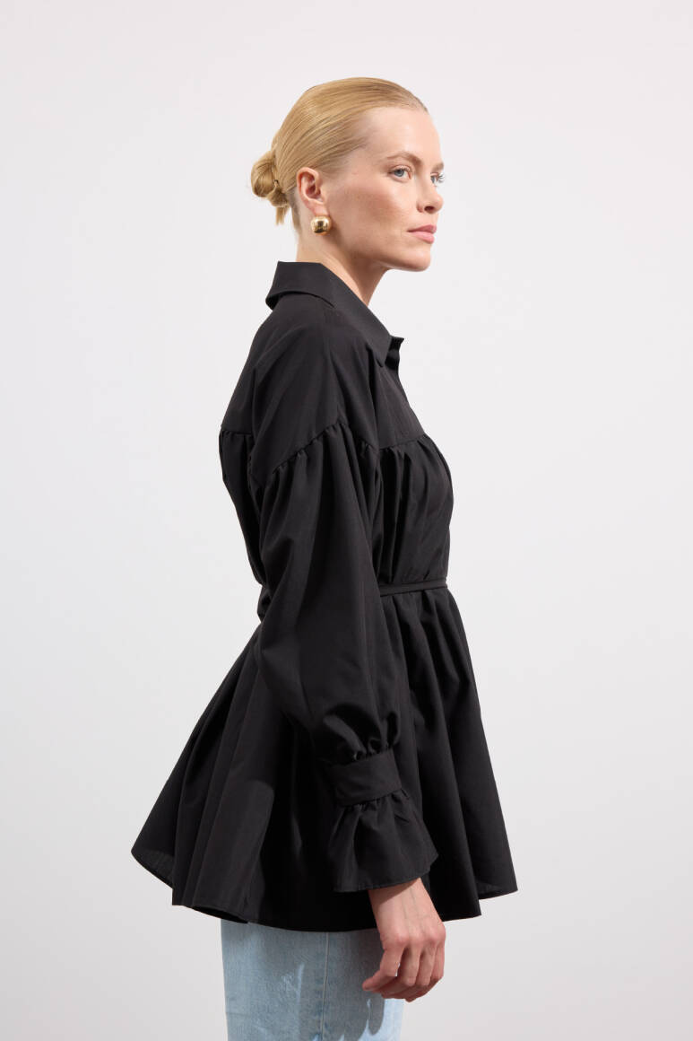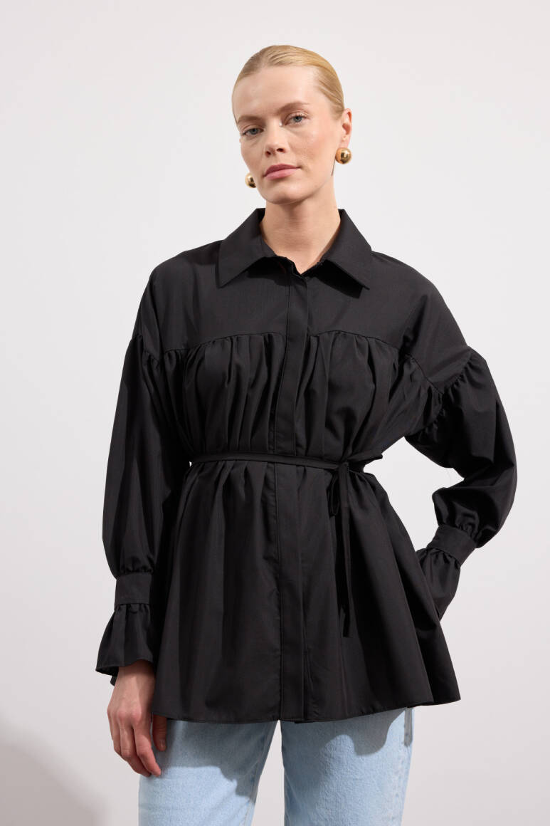 Büzgülü Poplin Gömlek Siyah - 1