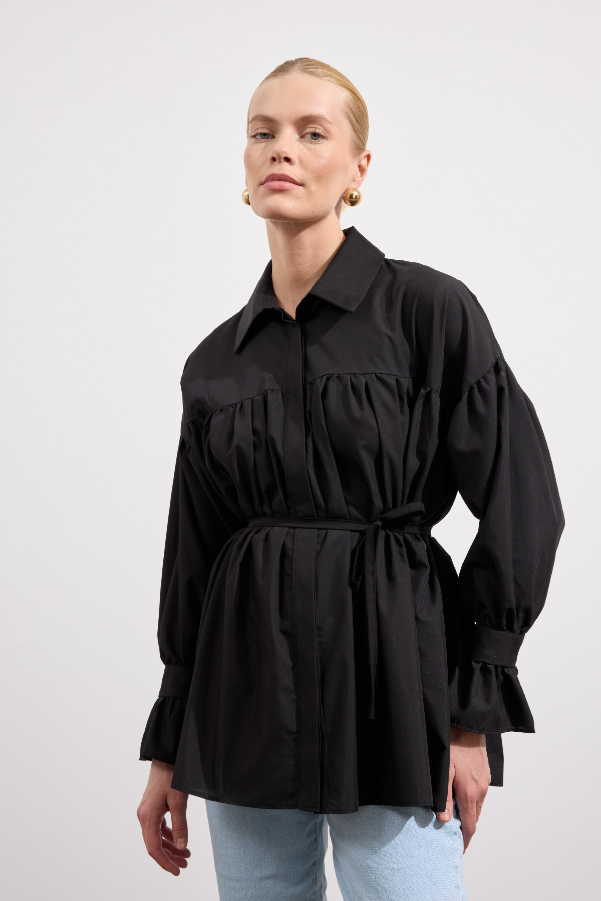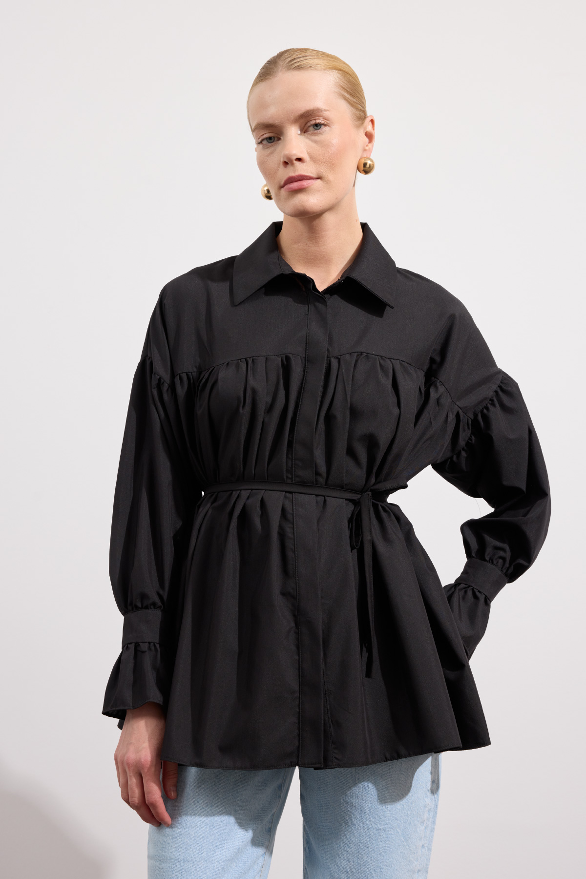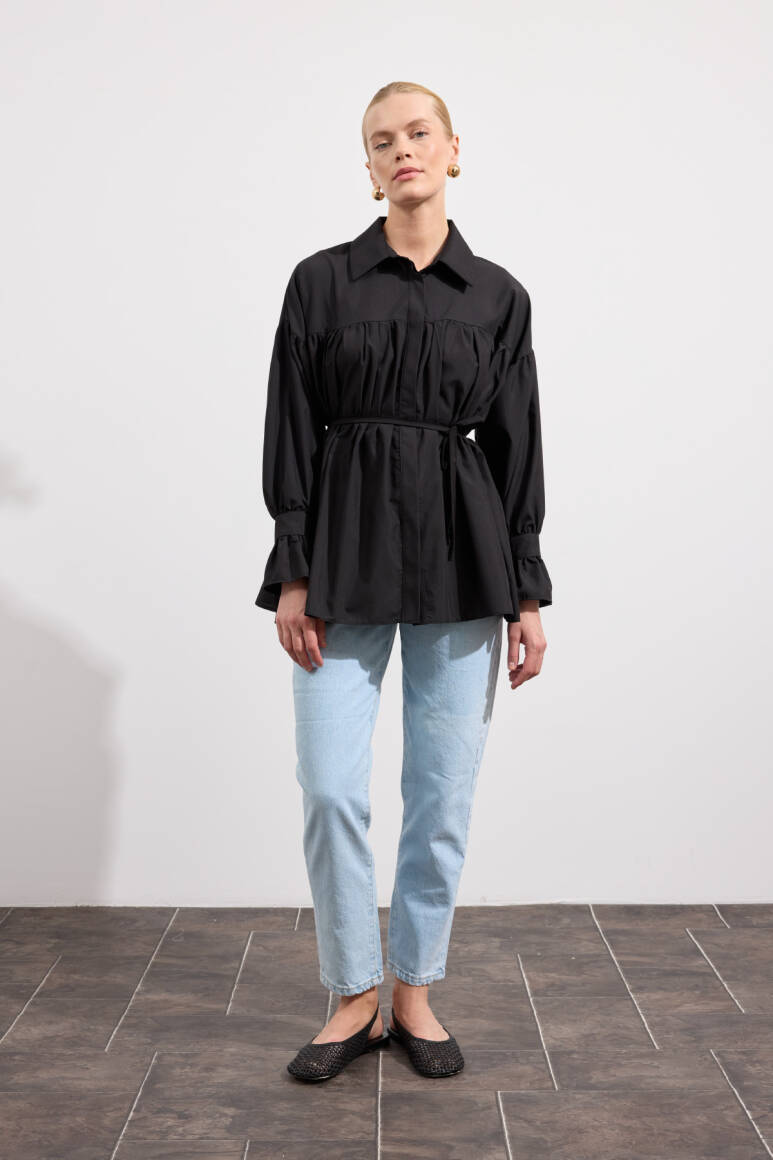 Büzgülü Poplin Gömlek Siyah