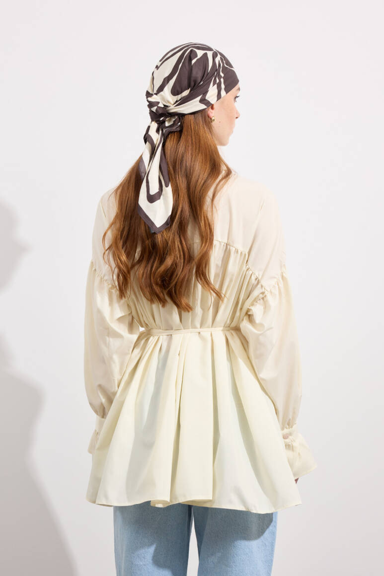 Beden boyunca büzgü detayı, pamuk içerikli, bel kısmı ip biyeli, gizli pat düğmeli, kol manşeti büzgülü ekstra parçalı.