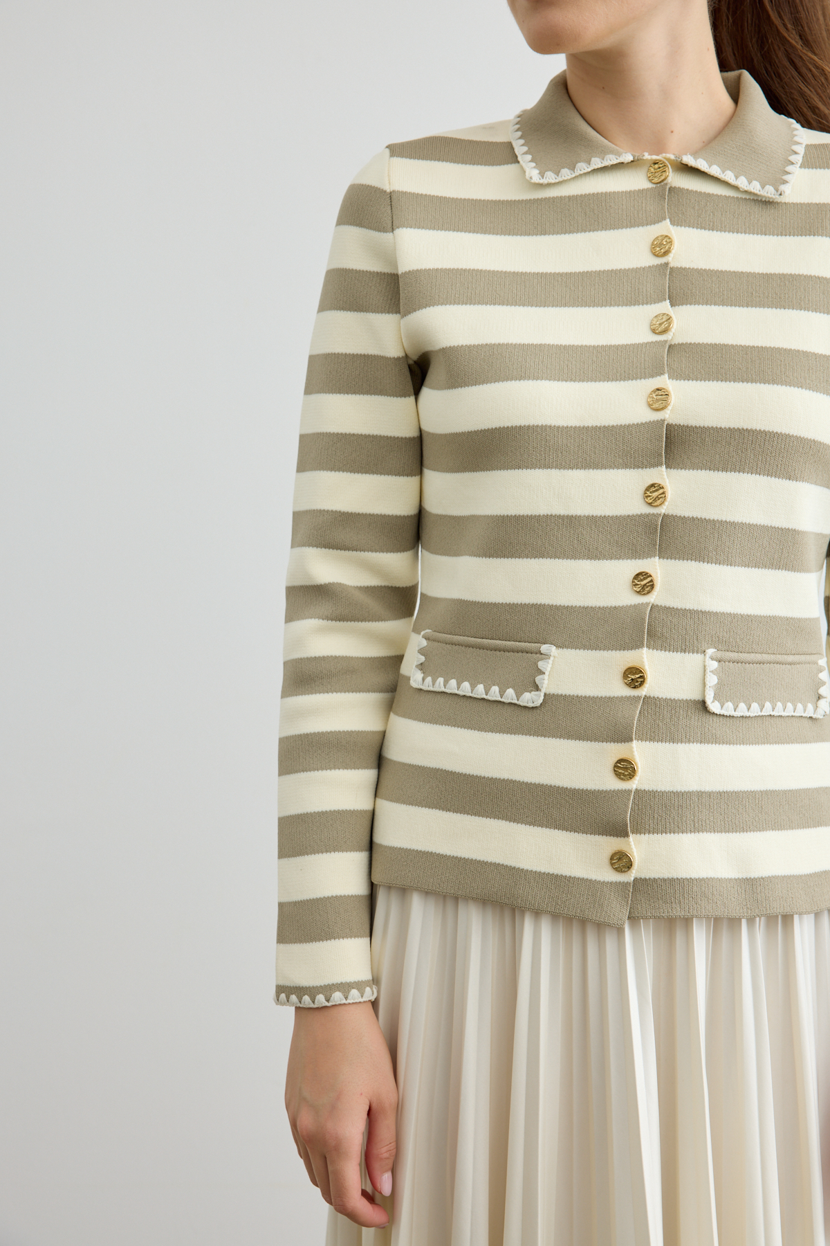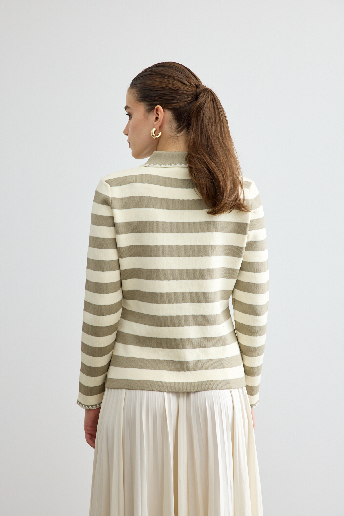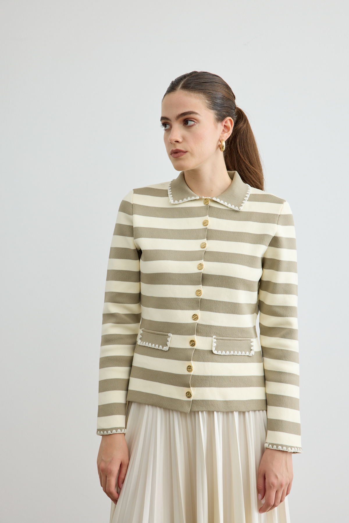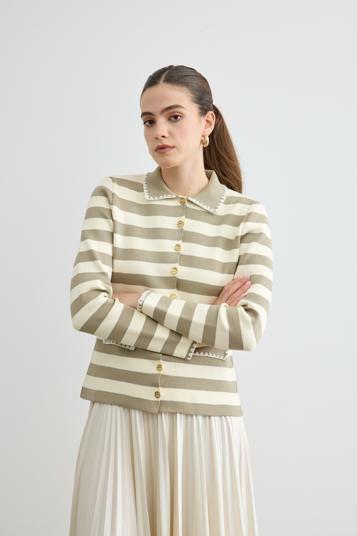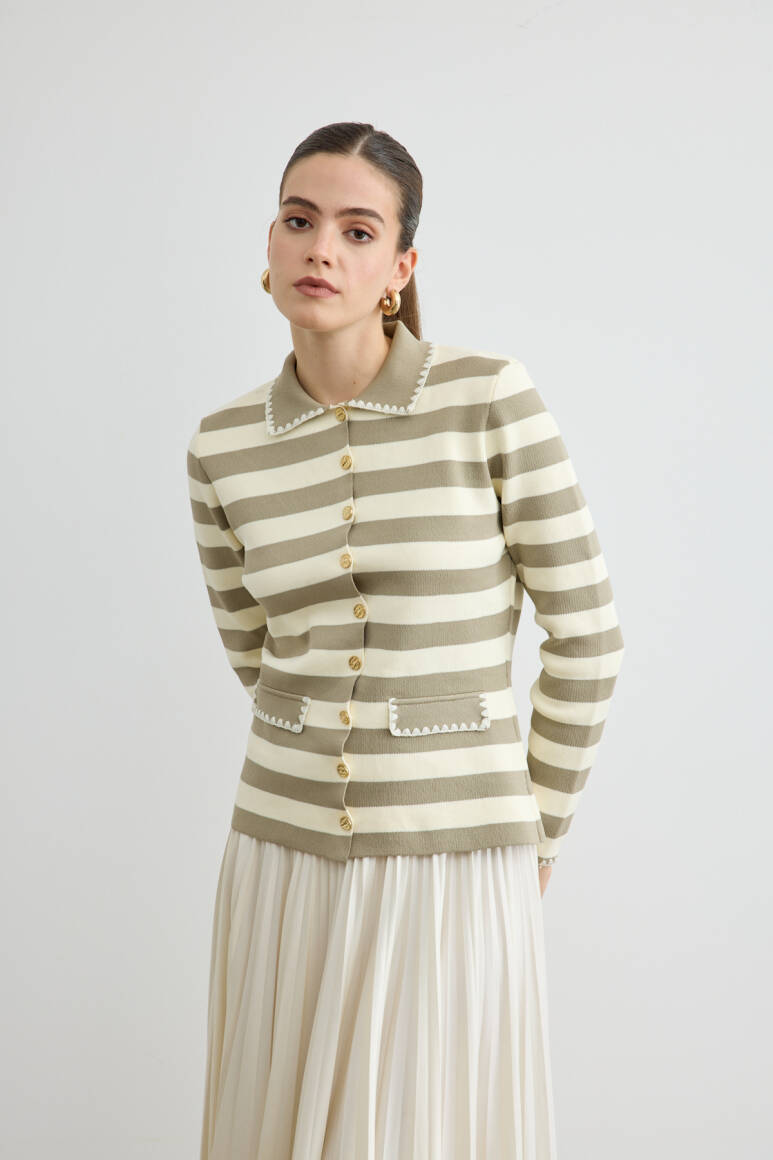 Modern çizgisi ve rahat formu ile öne çıkan triko hırka, gündelik stile sofistike bir dokunuş katıyor. Yumuşak dokusu sayesinde konforlu, çizgili deseniyle zamansız bir görünüm sunar.