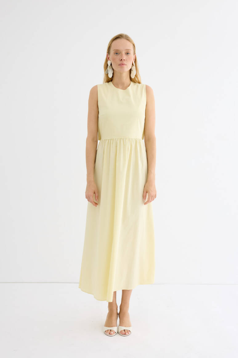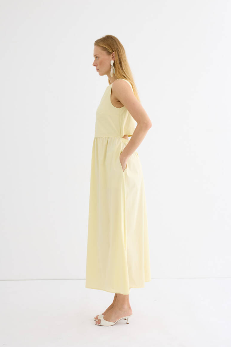 Modern çizgilere sahip, sade ve zarif tasarımıyla öne çıkan elbise. Üst kısmı bel pencereli görünümlü, alt kısmı yüksek bel, geniş kesimle tamamlanmıştır. Hafif ve akışkan kumaşı sayesinde gün boyu konfor sunar. Günlük şıklık veya özel davetler için ideal bir parça.