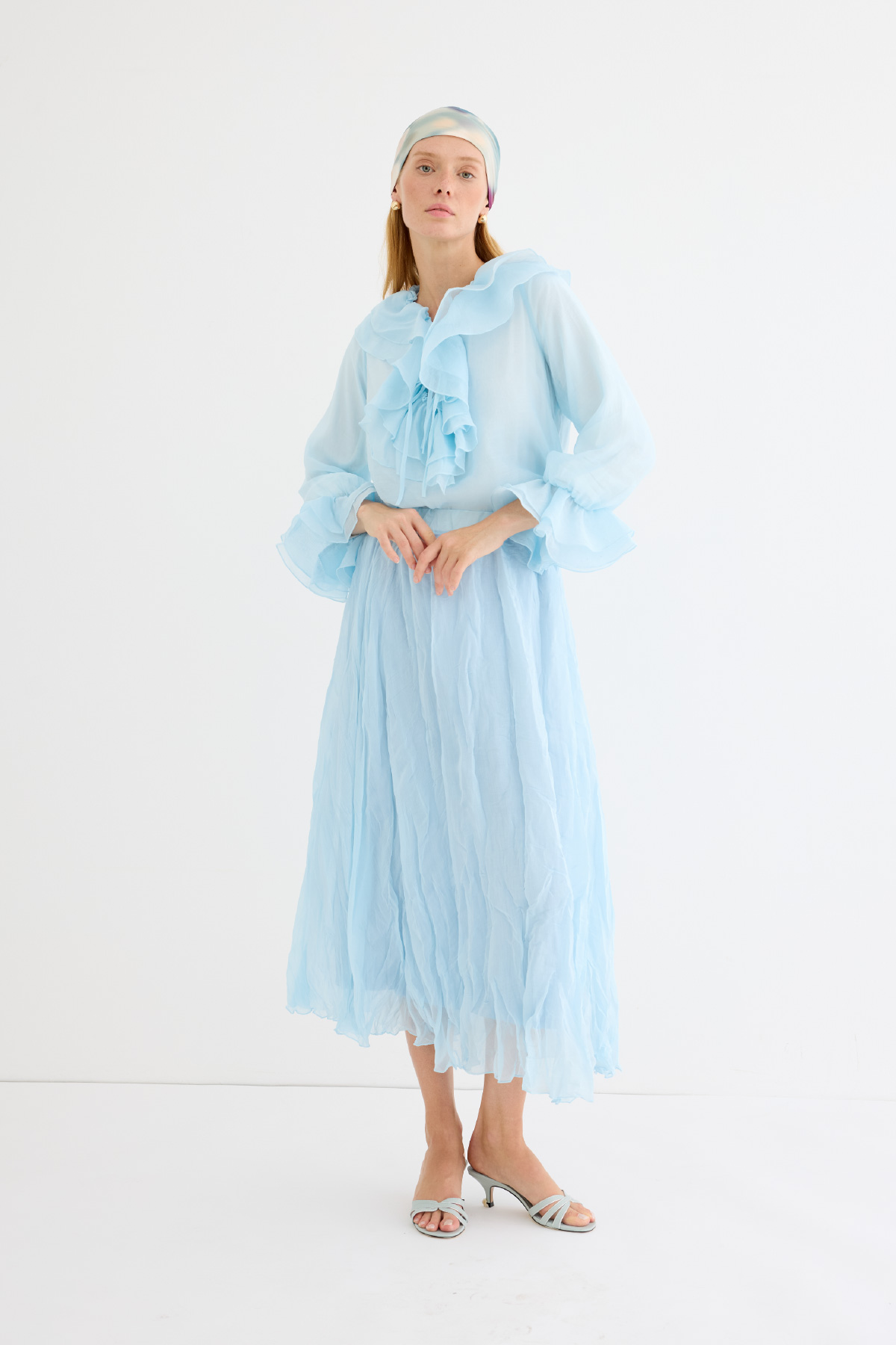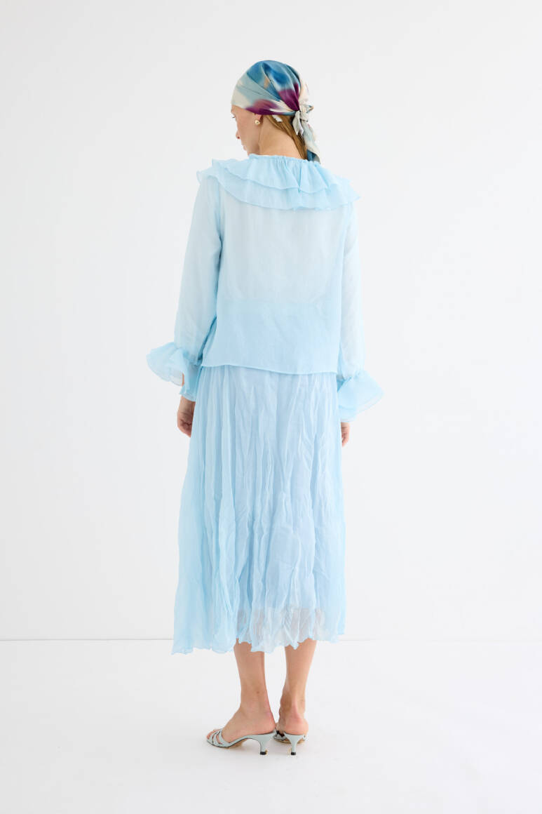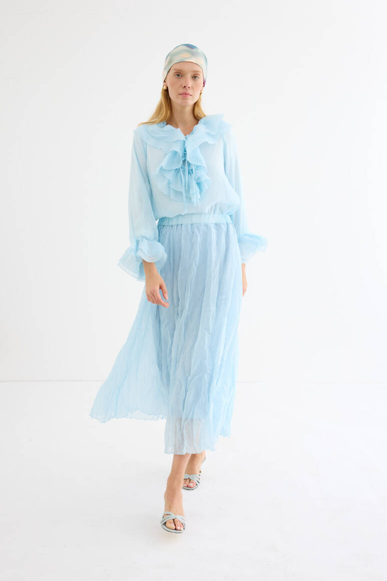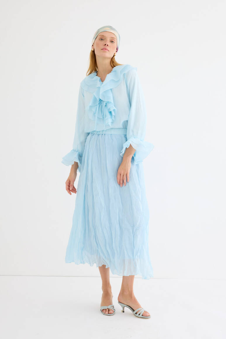 Hafif yapısıyla gün boyu konfor sunan, dökümlü ve kırışık dokuya sahip maxi etek. Elastik bel detayı ile rahat bir kullanım sağlar. Yarı transparan, uçuşan yapısıyla yaz stiline ferah bir dokunuş katar. Astarlıdır.