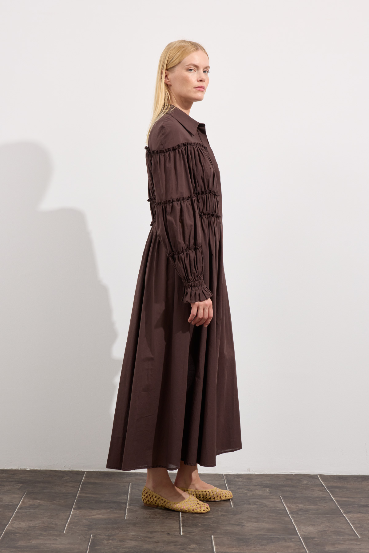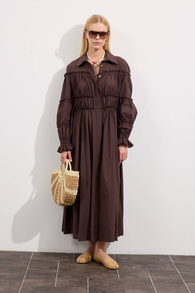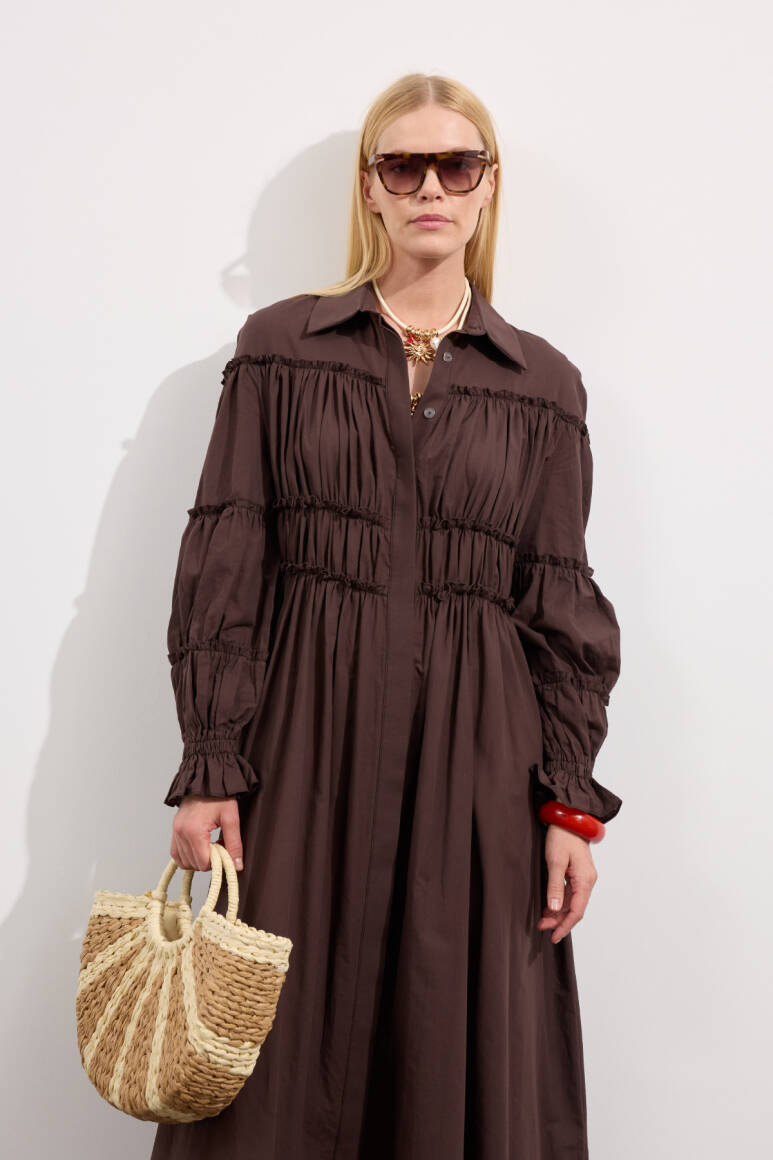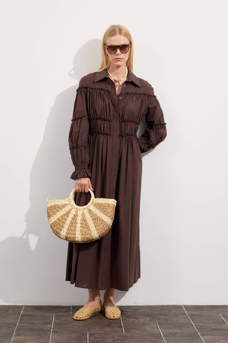 Sezonun en dikkat çekici parçasıyla tanış. Kotonun rahatlığı ve modern kesimin buluştuğu bu elbise, gömlek yaka detayı ve büzgülü beliyle siluetine vurgu yapıyor. Balon kolları ve uzun etek boyu, dinamik ve şık bir duruş sergilerken, hem gündüz hem de gece şıklığını yakala.