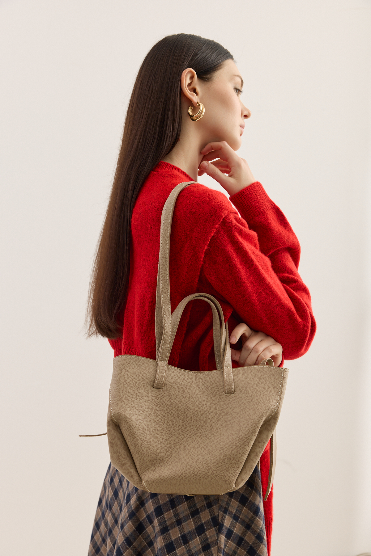 Zamansız tasarımıyla sade şıklığı yeniden tanımlayan tote çanta, modern stilin güçlü ama zahmetsiz bir yansıması. Çift askılı formu sayesinde elde ya da omuzda konforlu bir taşıma sunarken, dengeli yapısıyla gün boyu formunu korur. Çıt çıt kapamalı ana bölmesi pratik kullanım sağlarken, astarsız iç yapısı çantaya doğal, özgür ve hafif bir karakter kazandırır. Yan kısmında yer alan, küçük cüzdan detayı ise hem işlevsel hem de tasarıma ince bir zarafet katar; kartlarınız ve küçük eşyalarınız için şık bir alan sunar.