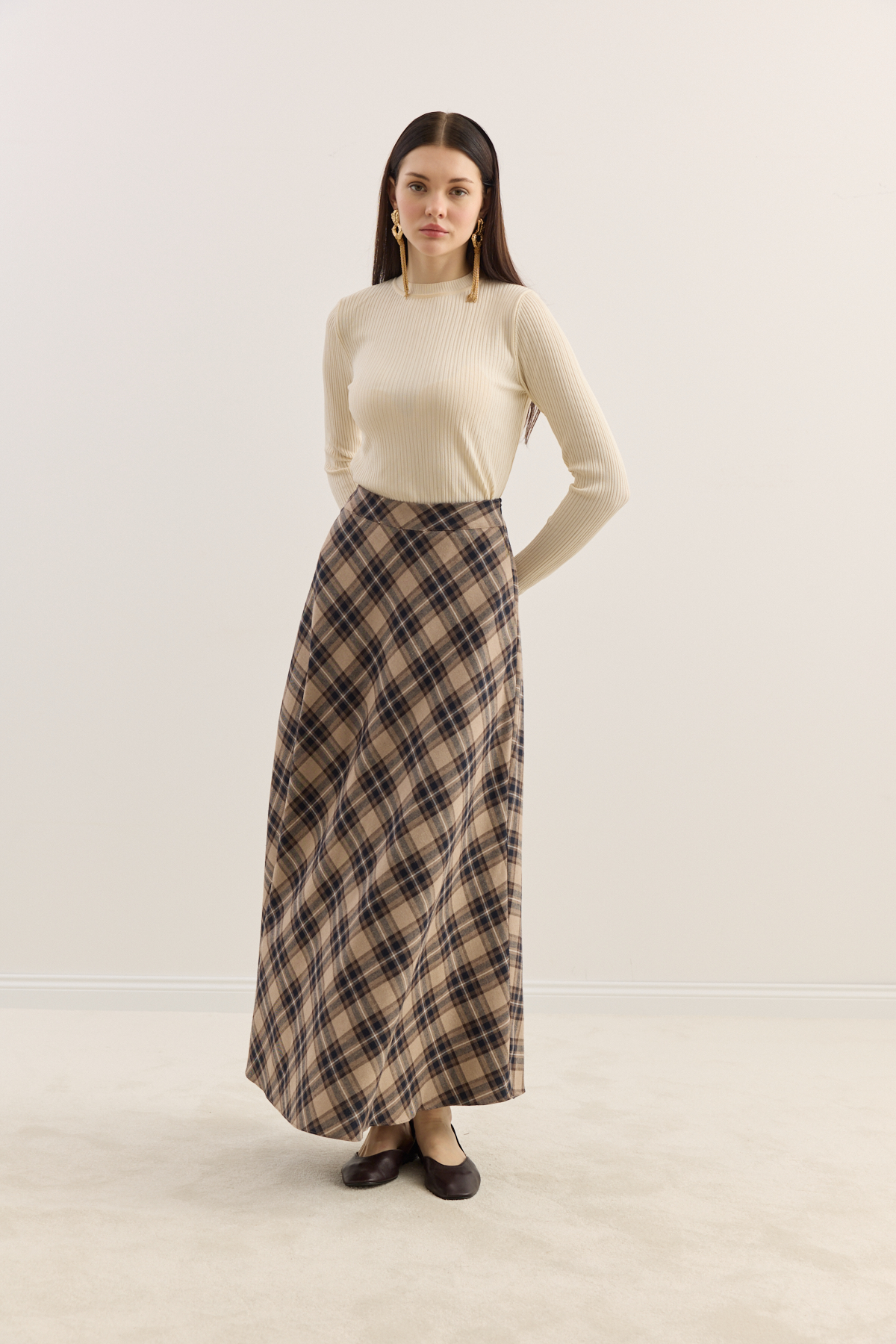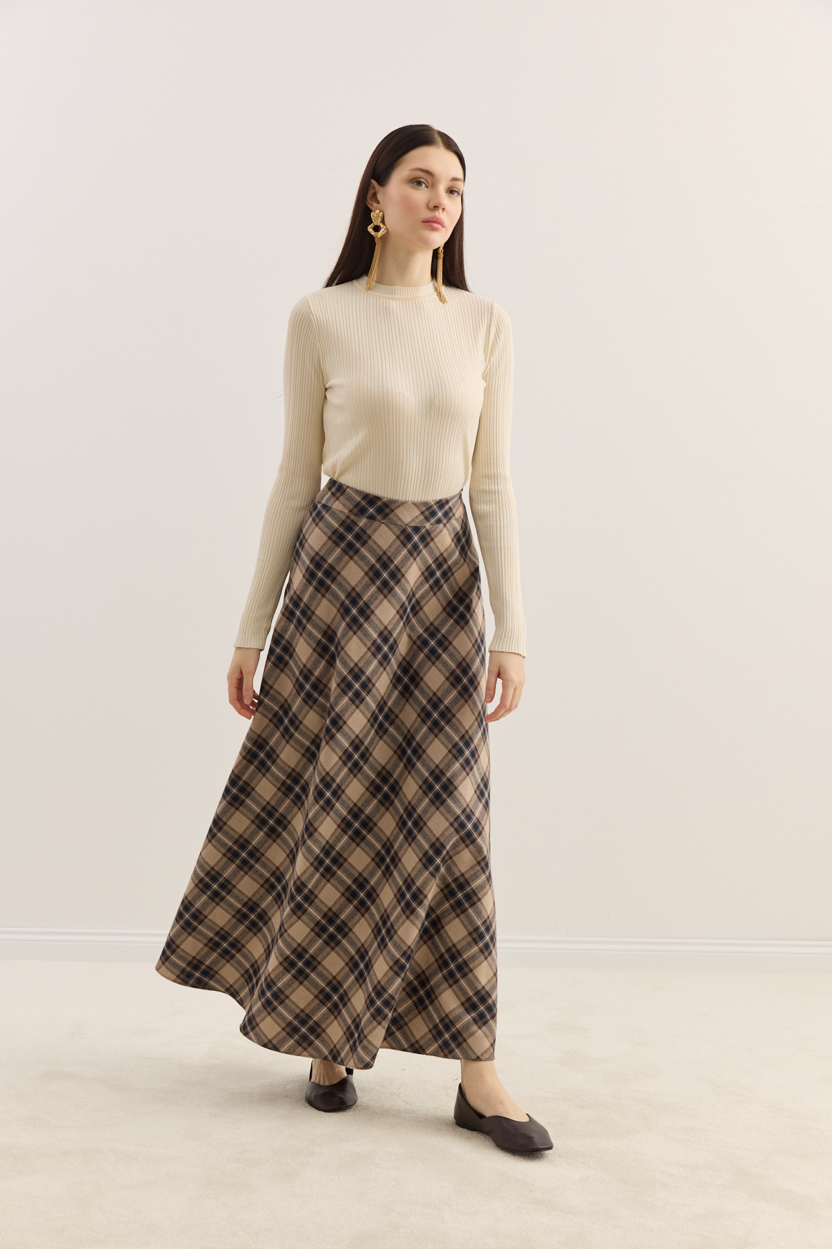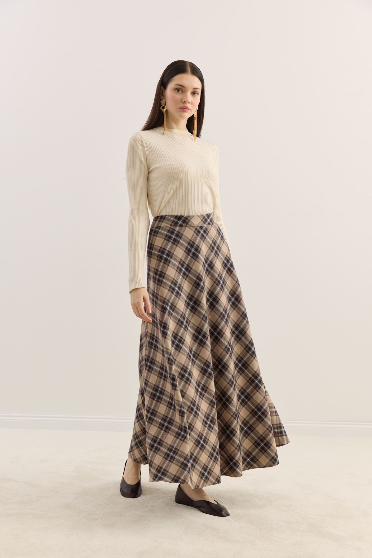 Zamansız ekose deseni ve kloş kesimiyle öne çıkan bu etek, hareketli formu sayesinde gün boyu rahat bir kullanım sunar. Bel hattına oturan yapısı vücut oranlarını dengelerken, aşağı doğru genişleyen kesimiyle akıcı ve zarif bir duruş sağlar.