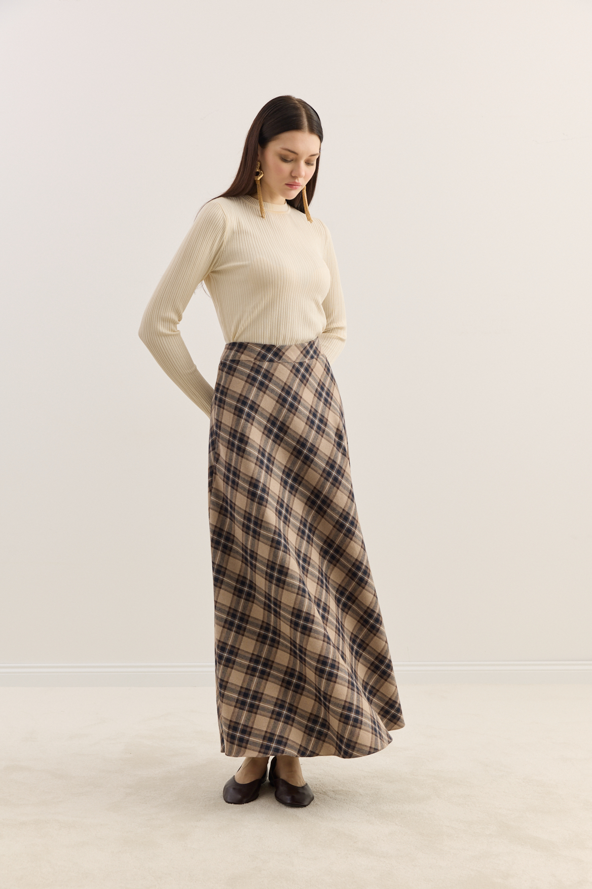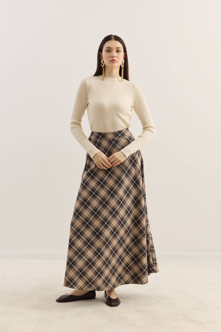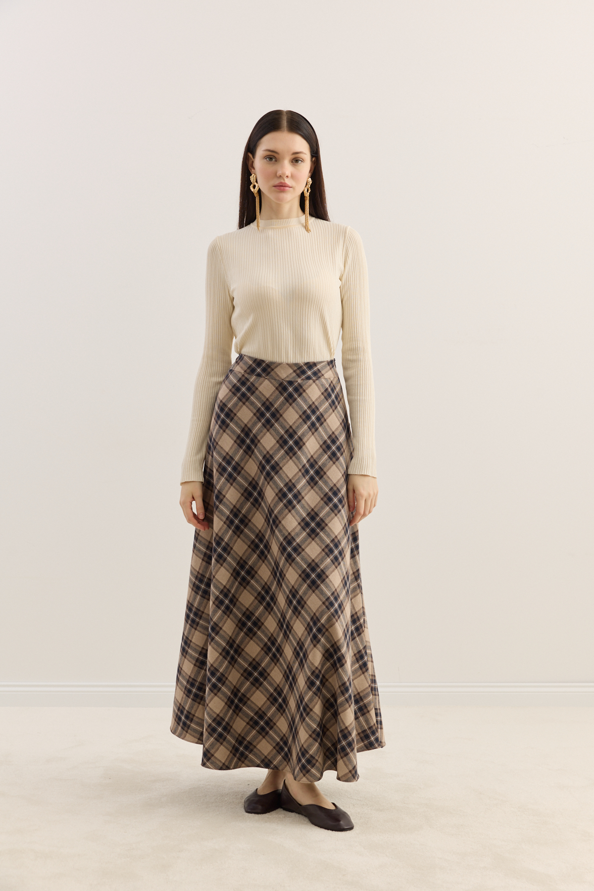 Zamansız ekose deseni ve kloş kesimiyle öne çıkan bu etek, hareketli formu sayesinde gün boyu rahat bir kullanım sunar. Bel hattına oturan yapısı vücut oranlarını dengelerken, aşağı doğru genişleyen kesimiyle akıcı ve zarif bir duruş sağlar.