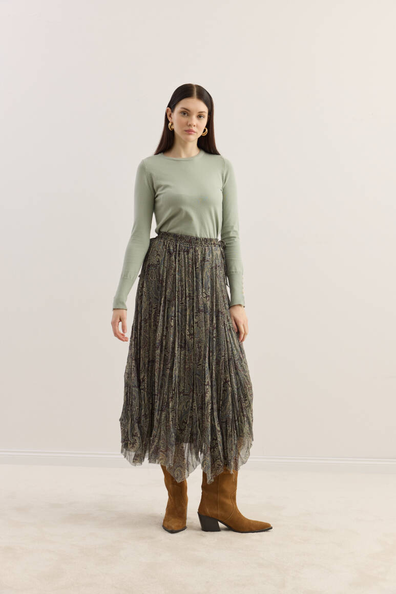 Zarif dokusu ve romantik detaylarıyla öne çıkan şifon etek, iki yanından bağlanabilen fiyonk detayıyla feminen bir siluet sunar. Hafif ve akışkan kumaşı hareket ettikçe doğal bir döküm sağlarken, bel kısmındaki bağlama detayı eteğe hoş ve modern bir görünüm kazandırır.