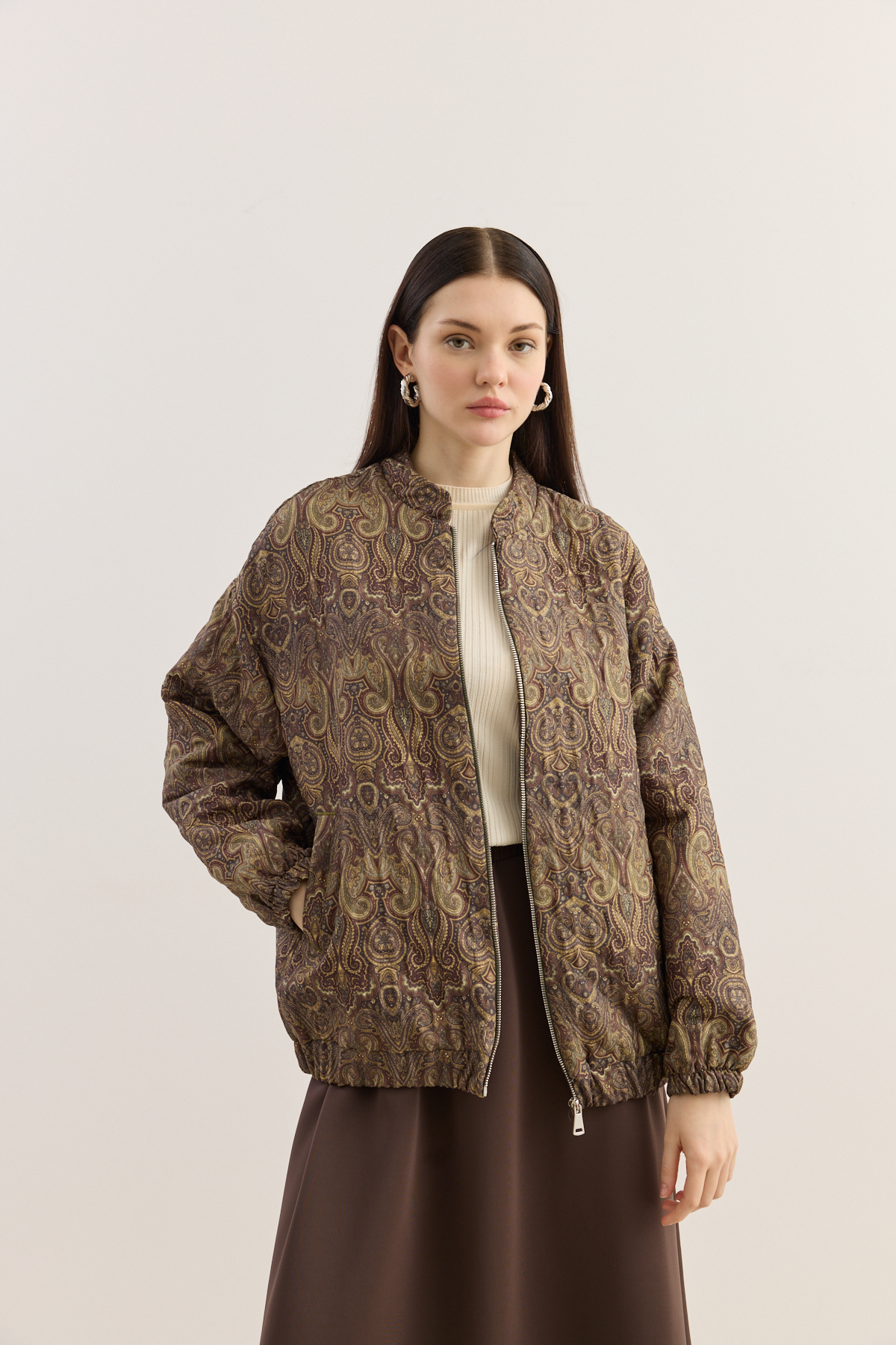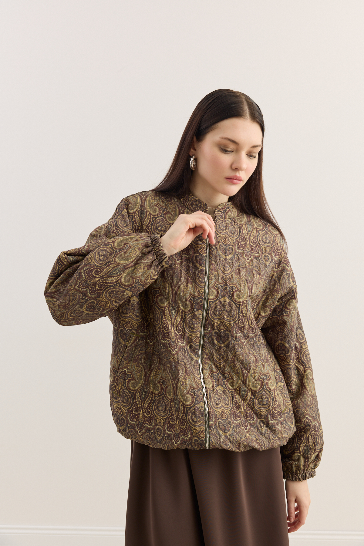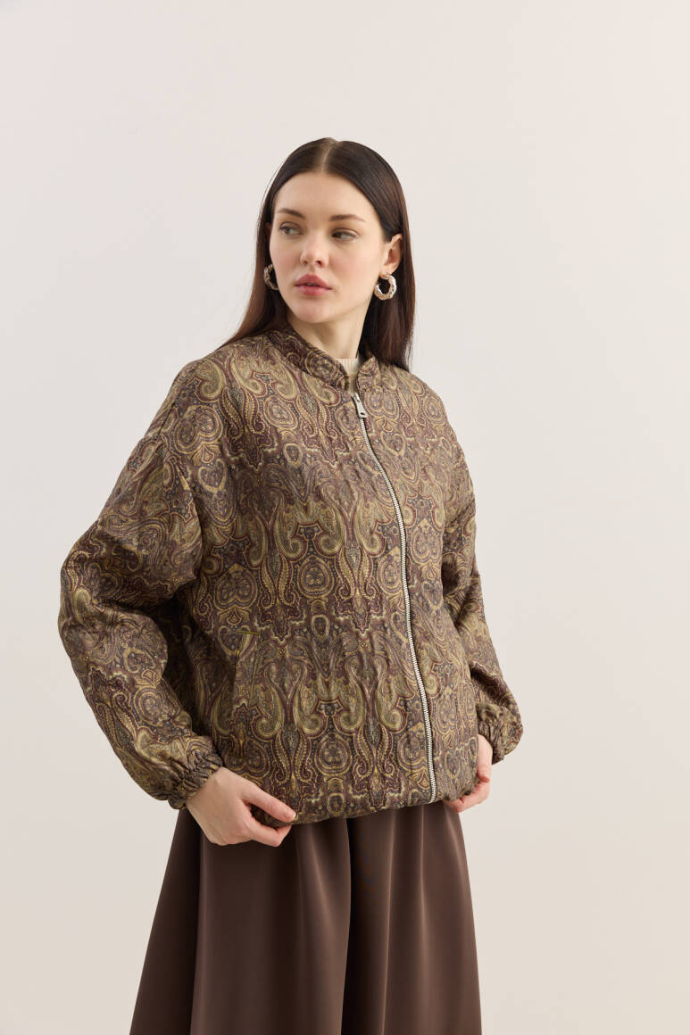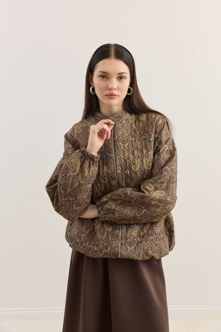 Kapitone dokulu, hafif hacimli formda tasarlanmış bomber mont. Tüm yüzeyde dekoratif desenli kumaş kullanılmıştır. Yuvarlak yaka, uzun kol ve elastik manşet detaylarına sahiptir. İç kısmı tam astarlıdır ve mevsim geçişlerinde konforlu bir kullanım sunar.