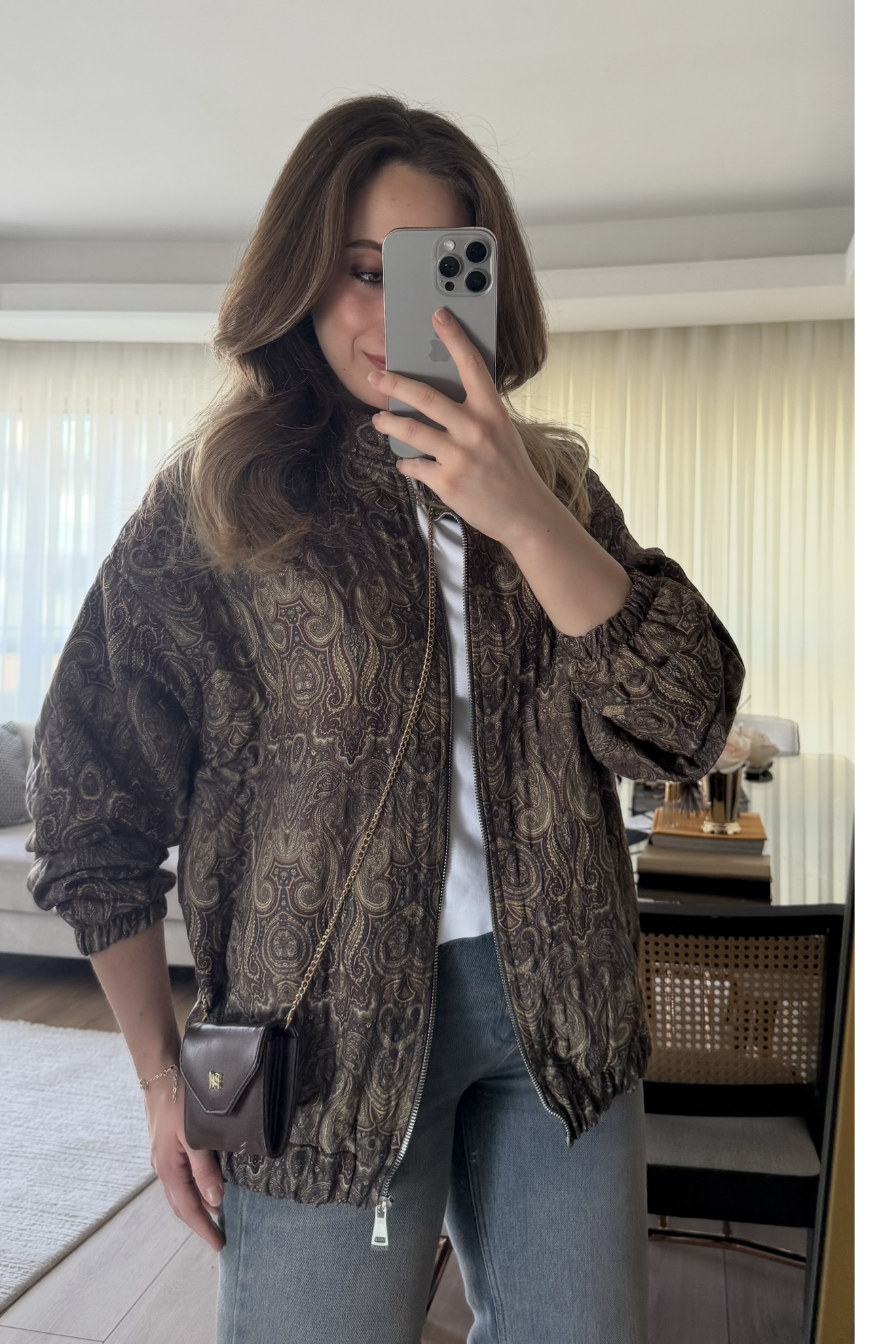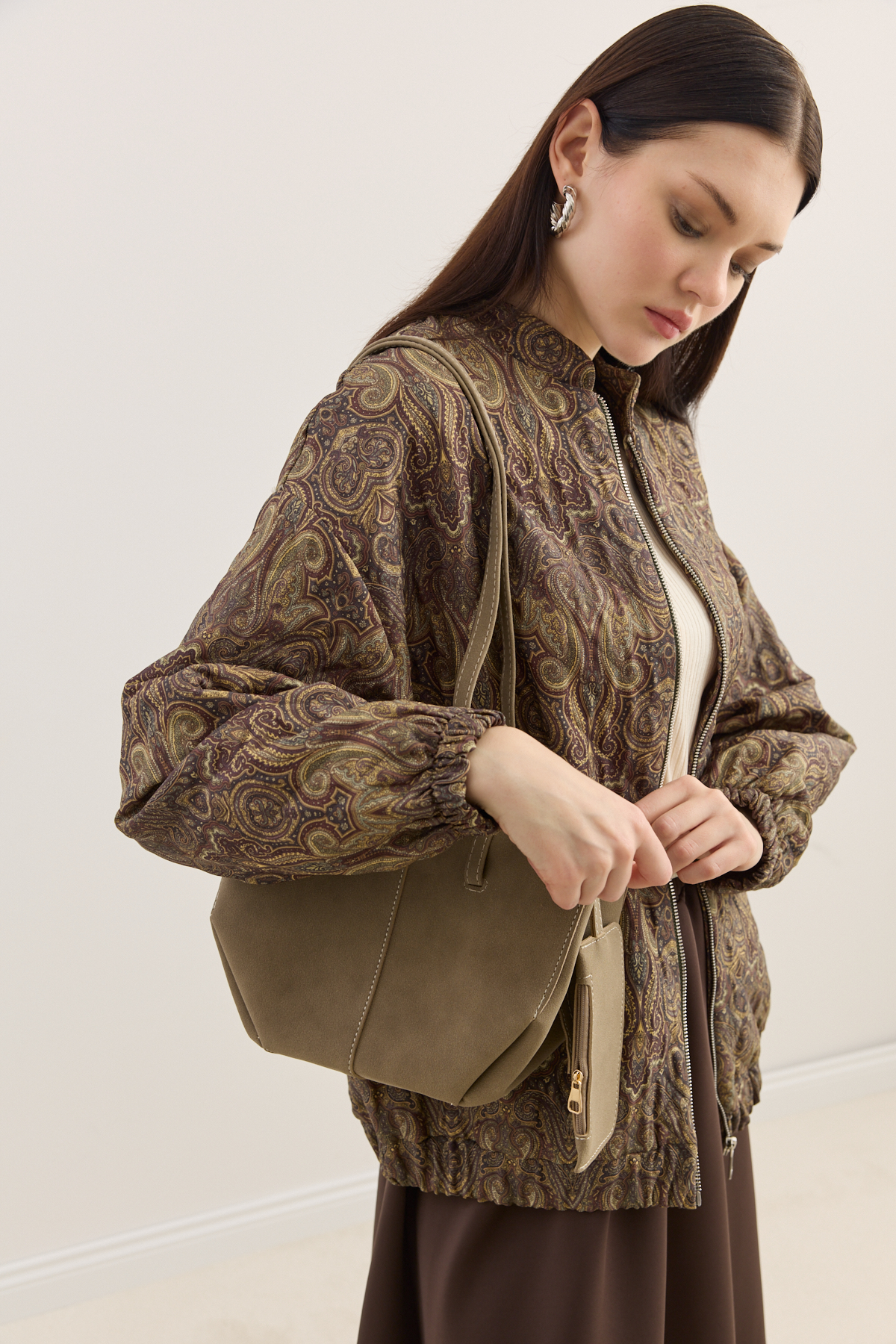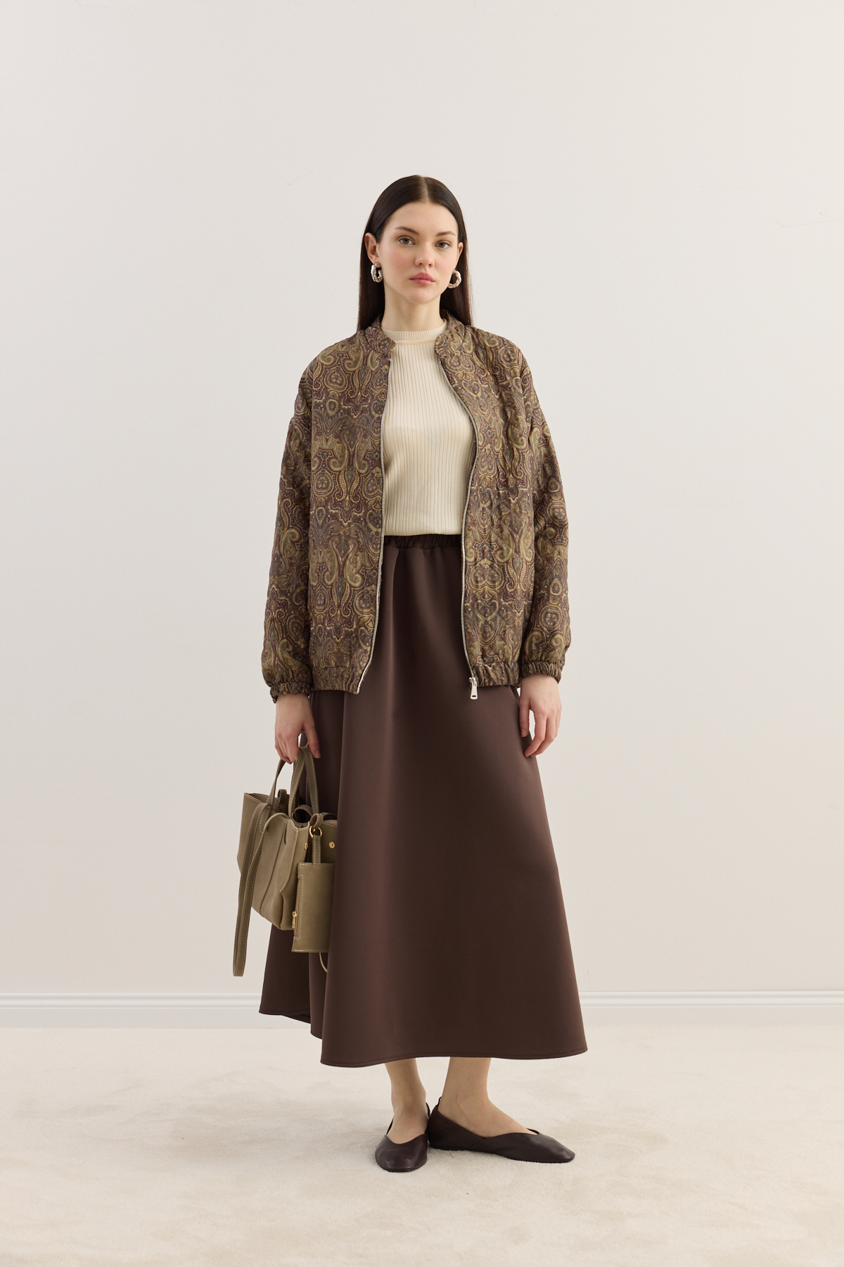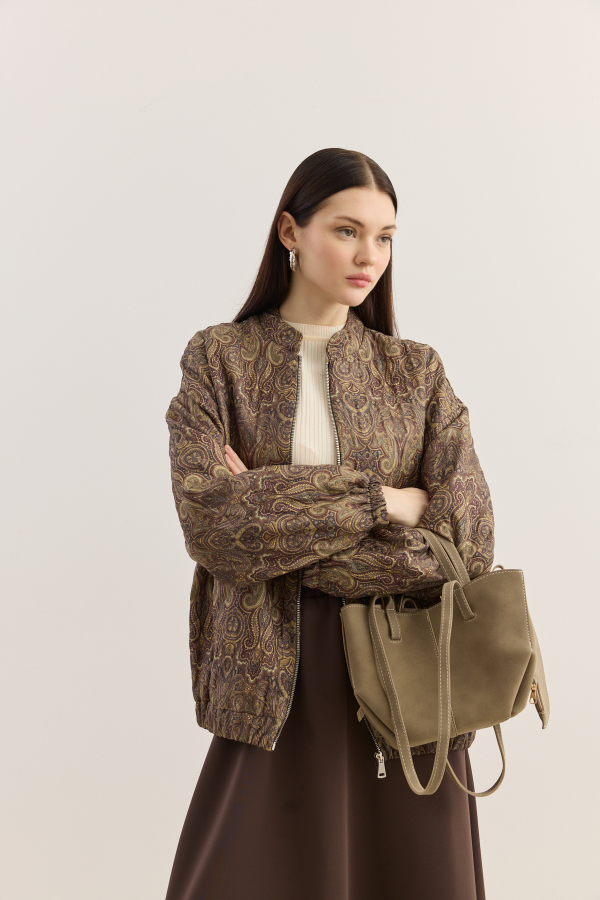 Kapitone dokulu, hafif hacimli formda tasarlanmış bomber mont. Tüm yüzeyde dekoratif desenli kumaş kullanılmıştır. Yuvarlak yaka, uzun kol ve elastik manşet detaylarına sahiptir. İç kısmı tam astarlıdır ve mevsim geçişlerinde konforlu bir kullanım sunar.