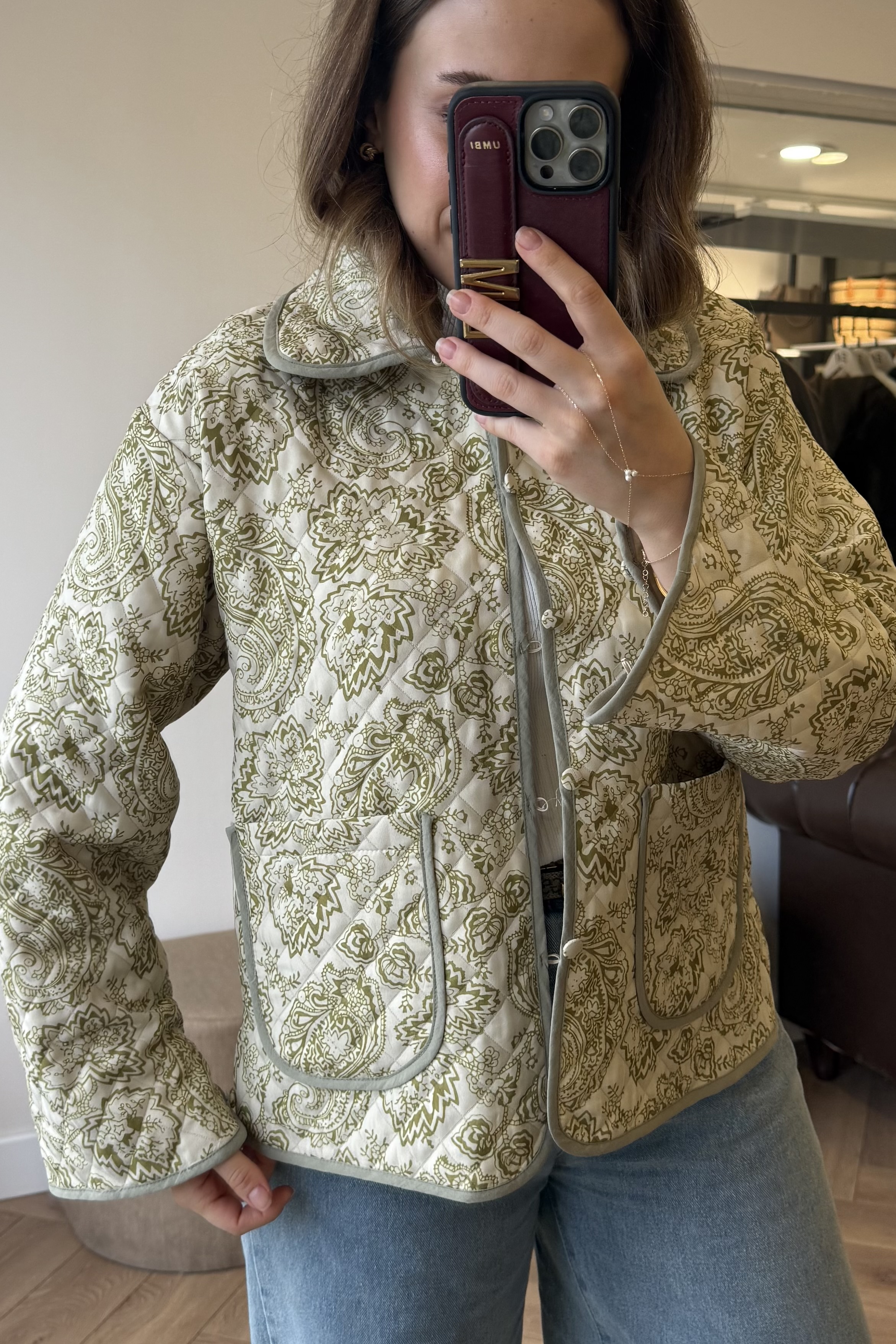 Etnik Desenli Kapitone Ceket Yeşil - 1