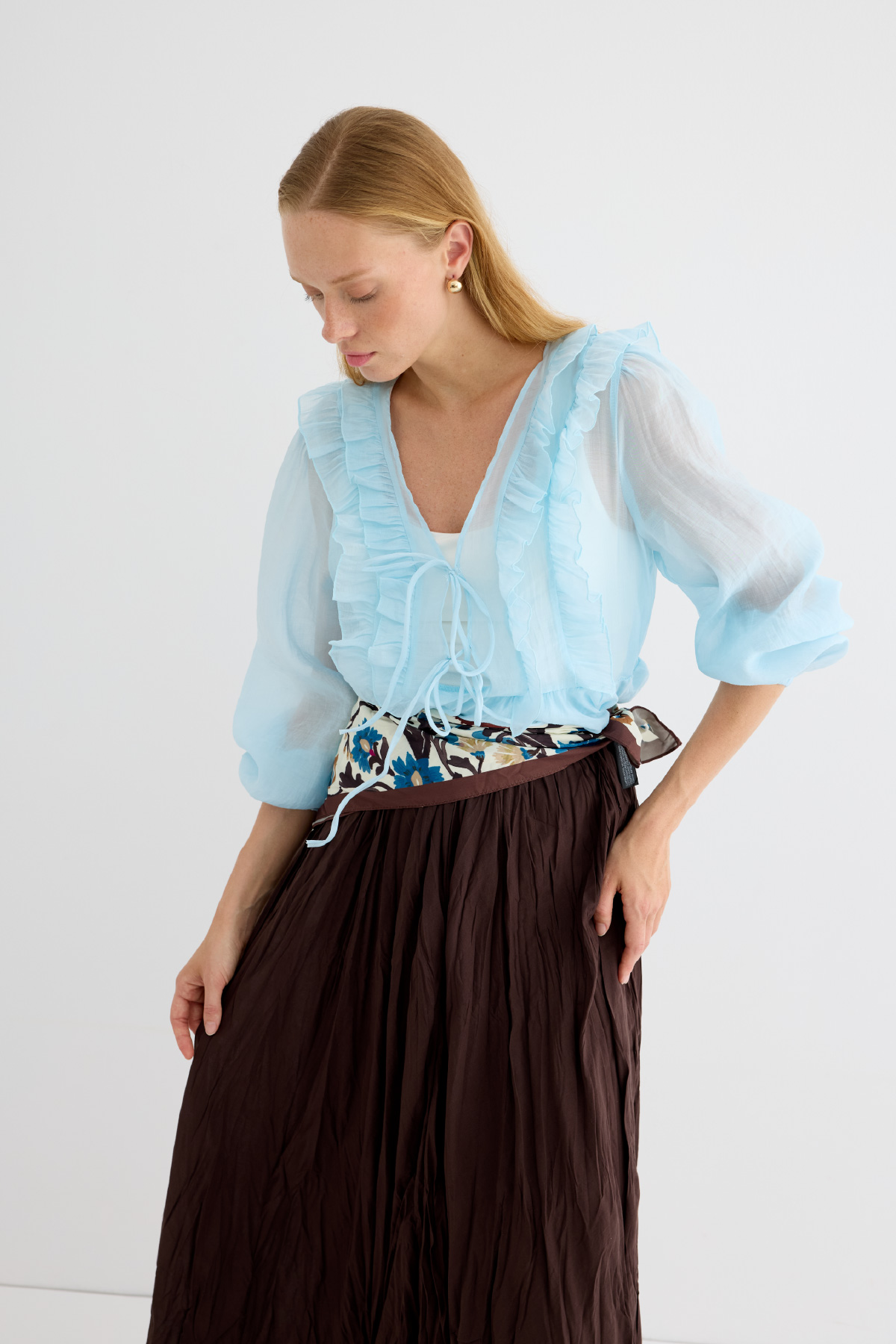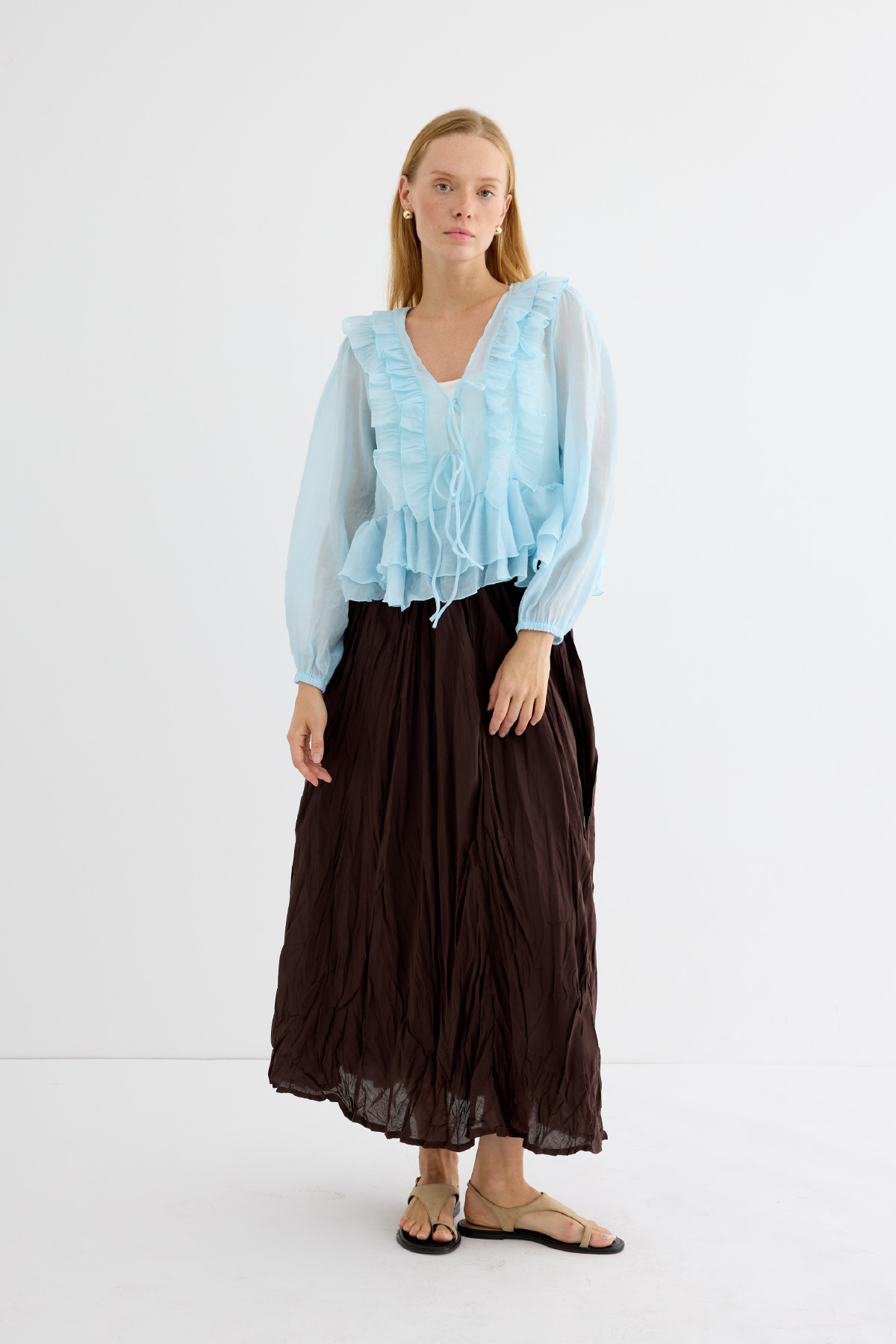 Yeni sezonun romantik ve modern ruhunu yansıtan bluz. Şifonun hafifliği ve fırfırların hareketli dokusu, her kombine feminen bir hava katıyor. Bağlamalı yaka detayı, stilinize dinamik bir dokunuş sağlar.