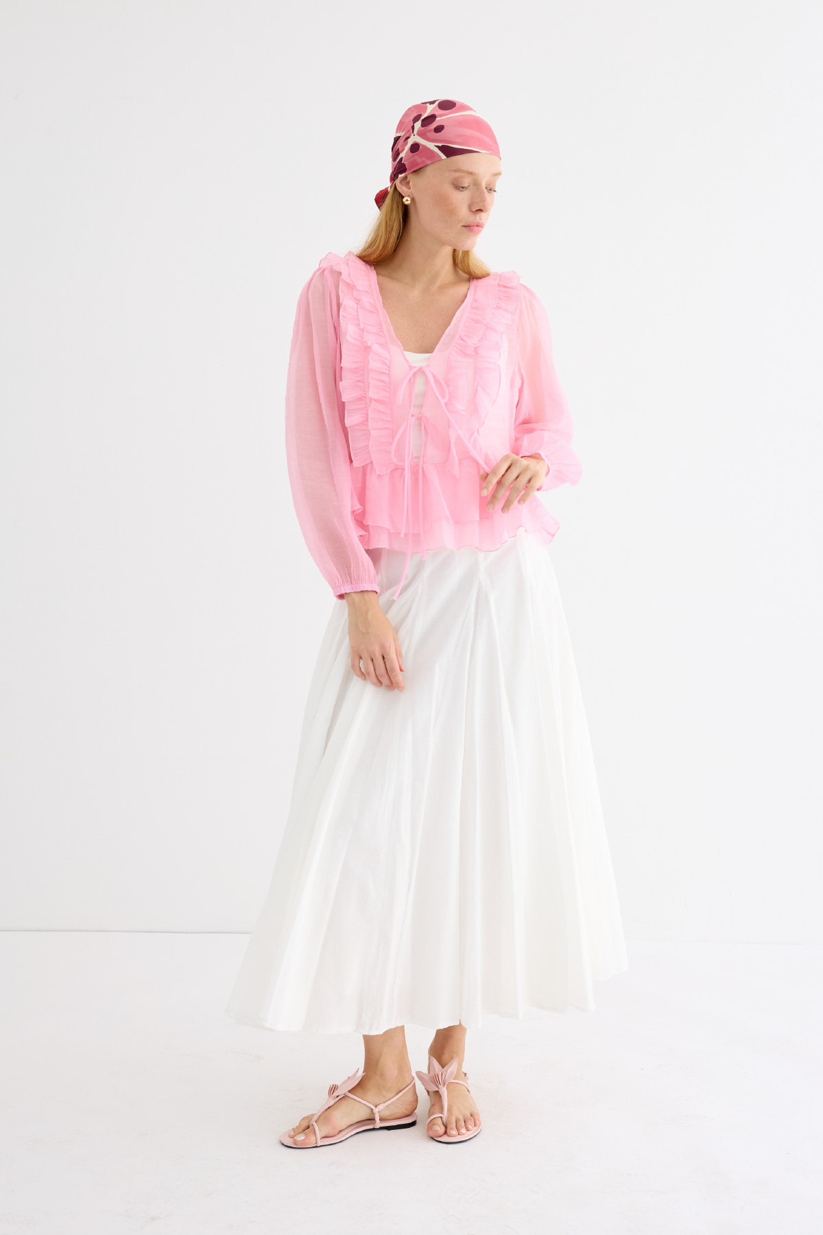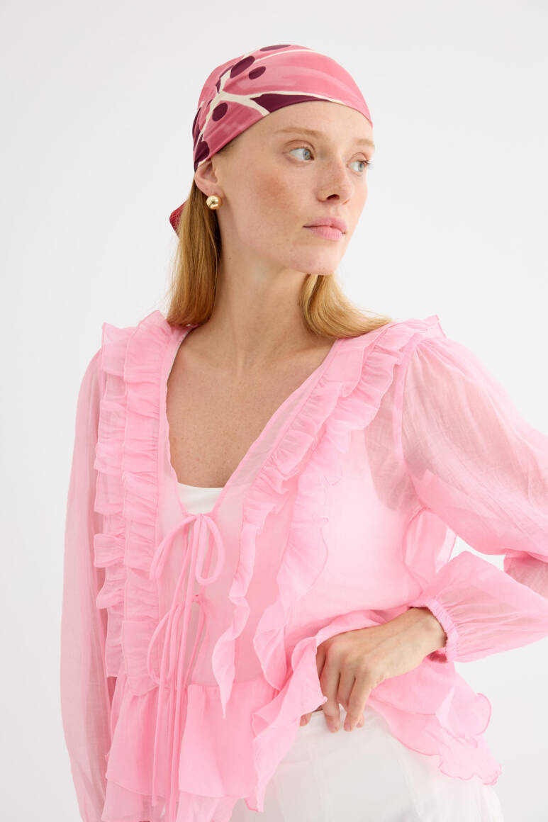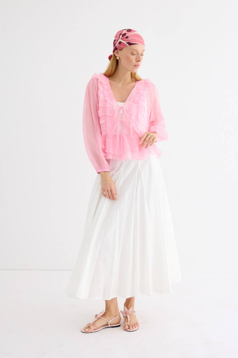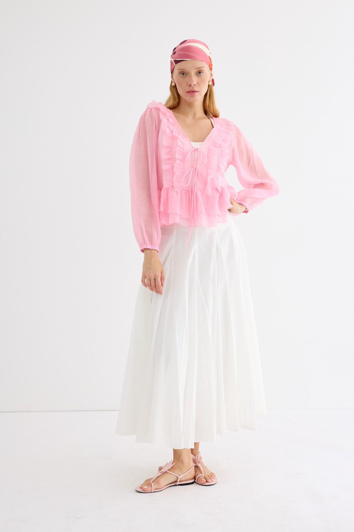Yeni sezonun romantik ve modern ruhunu yansıtan bluz. Şifonun hafifliği ve fırfırların hareketli dokusu, her kombine feminen bir hava katıyor. Bağlamalı yaka detayı, stilinize dinamik bir dokunuş sağlar.