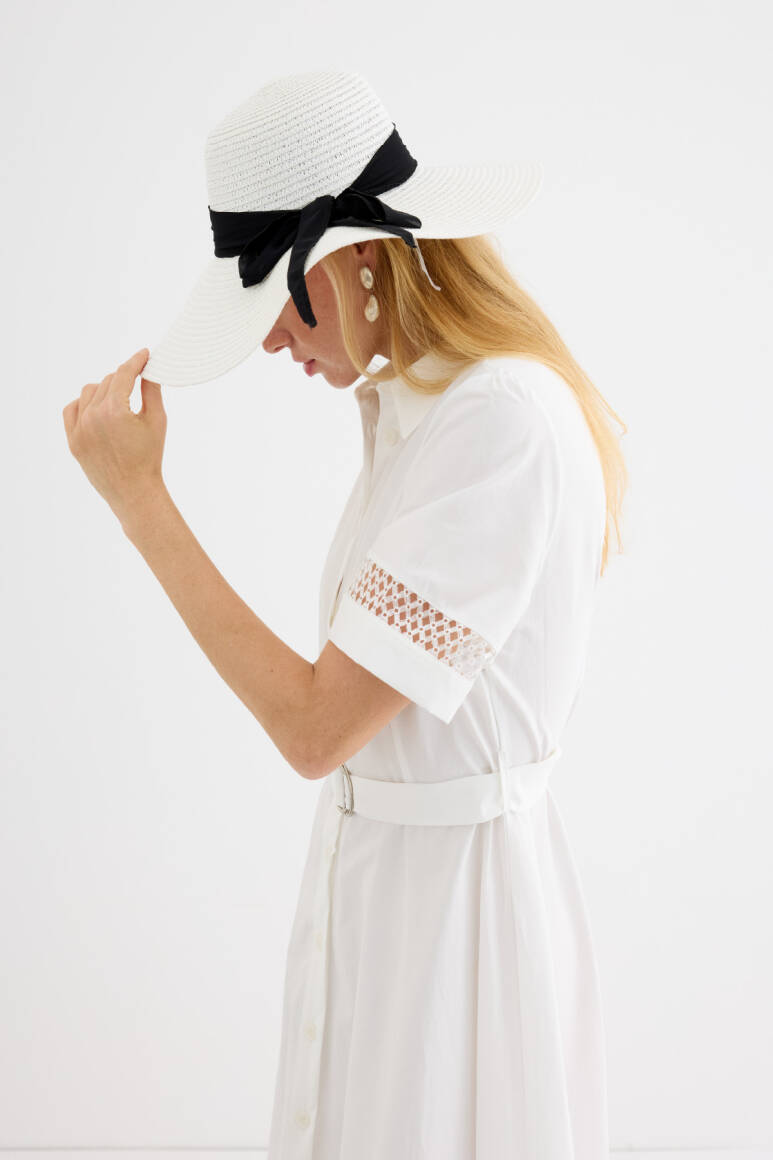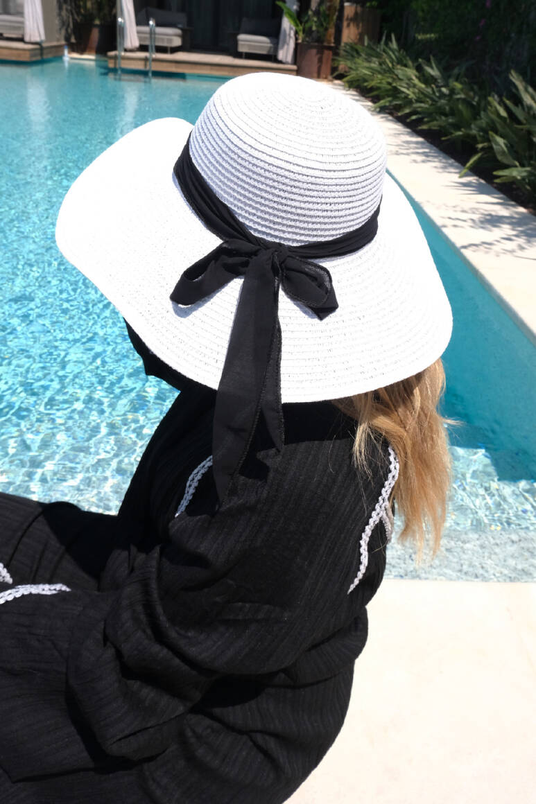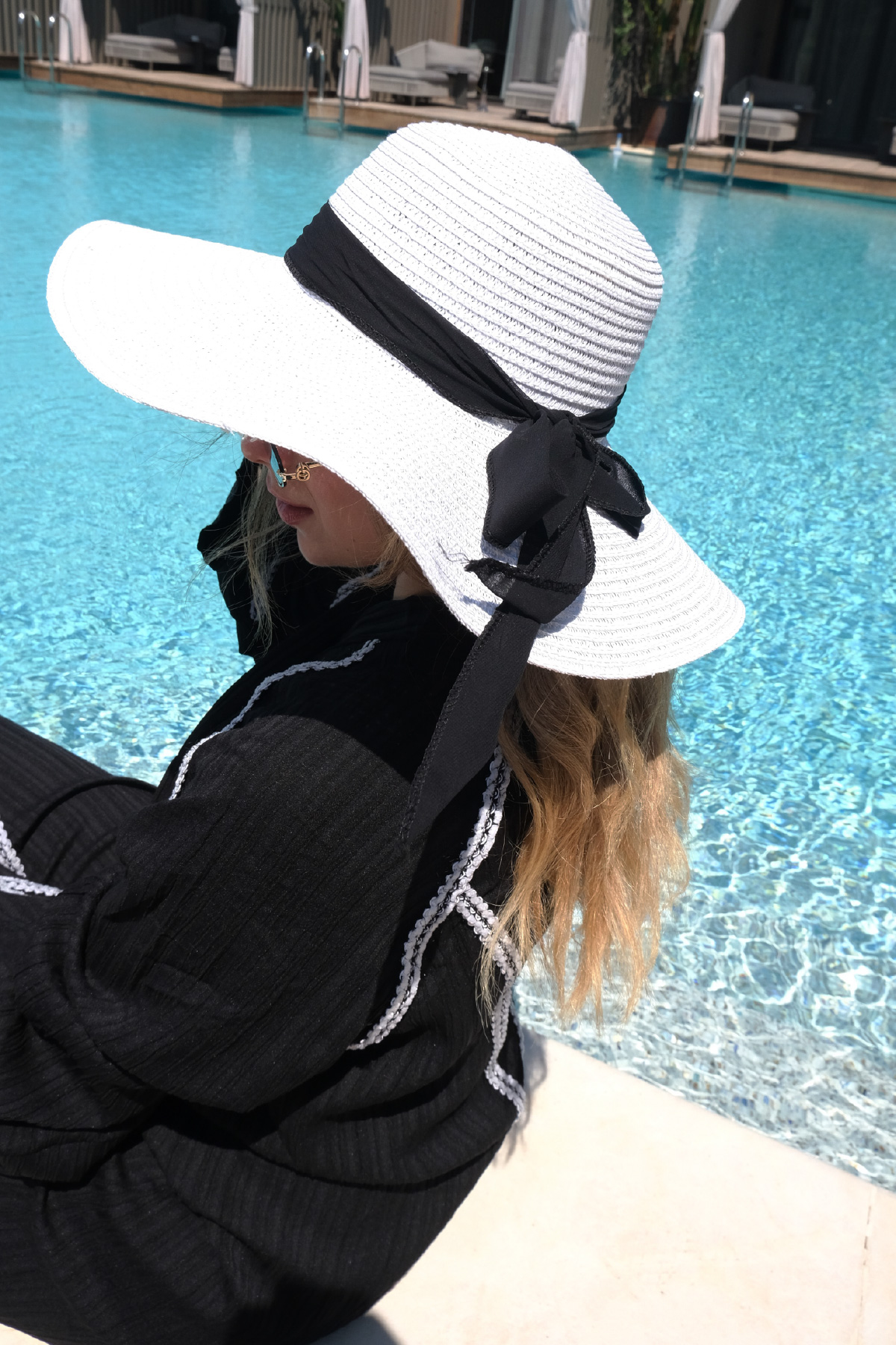 Geniş siperliğiyle güneşten yüksek koruma sağlayan hasır şapka, zarif siyah fular detayıyla klasik ve şık bir görünüm sunar.