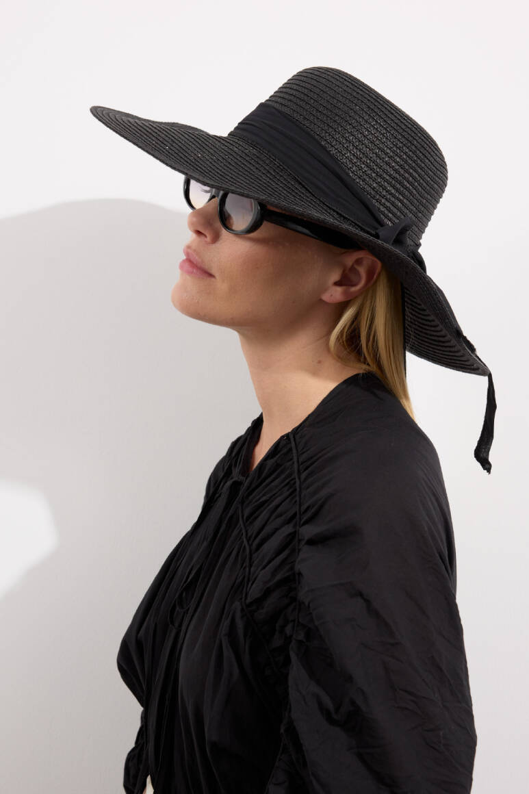 Geniş siperliğiyle güneşten yüksek koruma sağlayan hasır şapka, zarif siyah fular detayıyla klasik ve şık bir görünüm sunar.