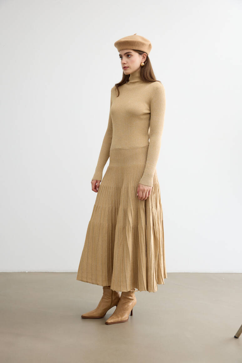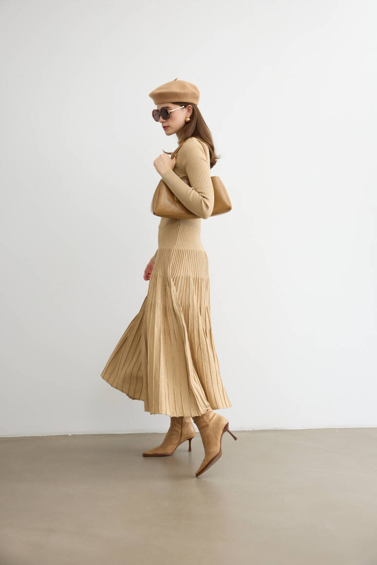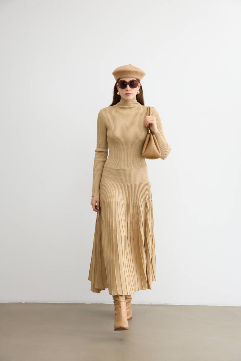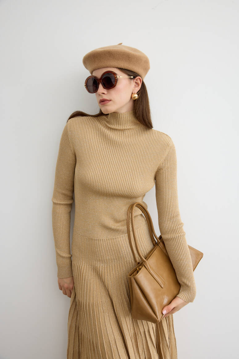 Sonbaharın romantik havasına uyum sağlayan ışıltılı çan elbise, hareket halinde zarifçe sallanan siluetiyle öne çıkıyor. Işıltılı dokusu ve akıcı formu, feminen çizgileri vurgularken gün boyu şıklık ve konfor sunuyor. Yapısı sayesinde hem gündelik kombinlerde hem de özel davetlerde sofistike bir tercih yaratıyor.