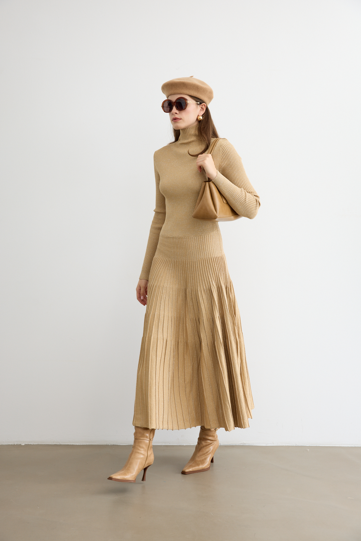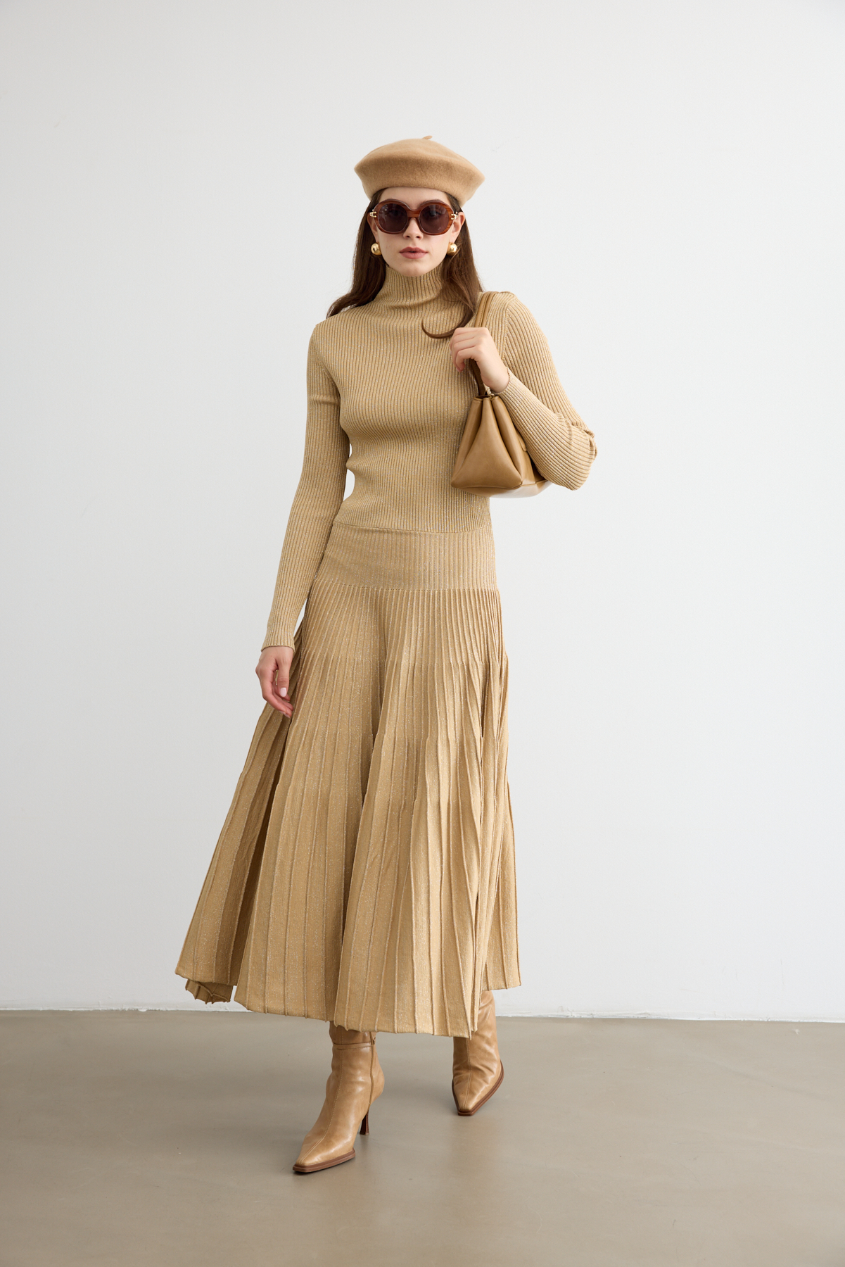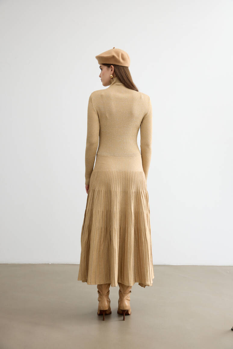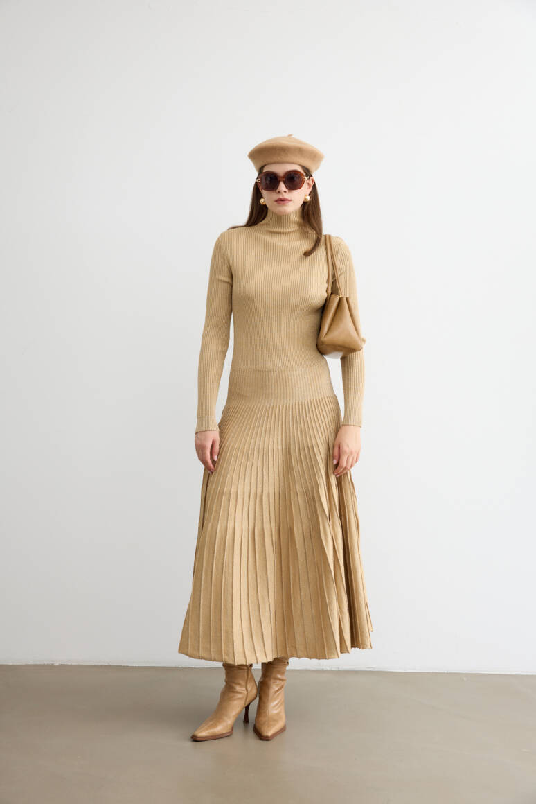 Sonbaharın romantik havasına uyum sağlayan ışıltılı çan elbise, hareket halinde zarifçe sallanan siluetiyle öne çıkıyor. Işıltılı dokusu ve akıcı formu, feminen çizgileri vurgularken gün boyu şıklık ve konfor sunuyor. Yapısı sayesinde hem gündelik kombinlerde hem de özel davetlerde sofistike bir tercih yaratıyor.
