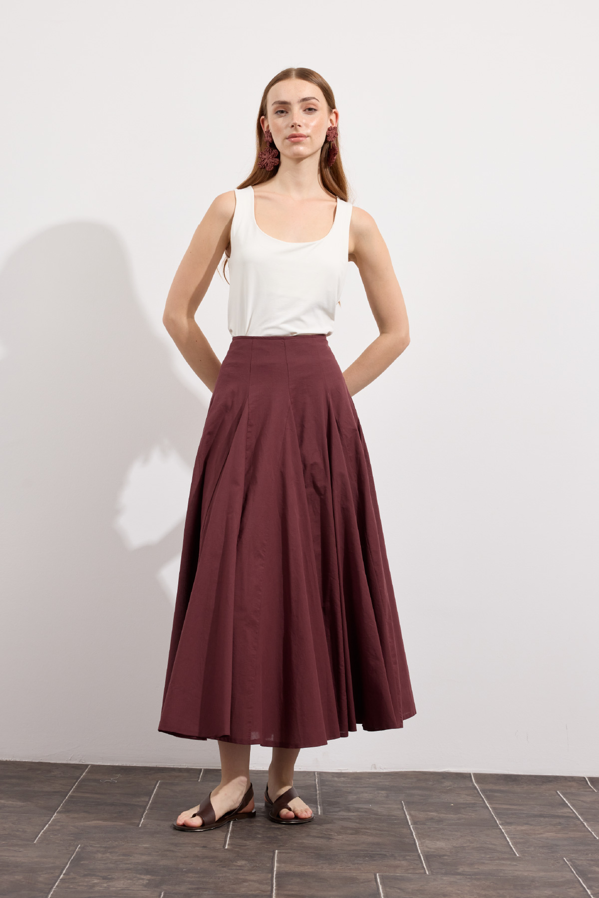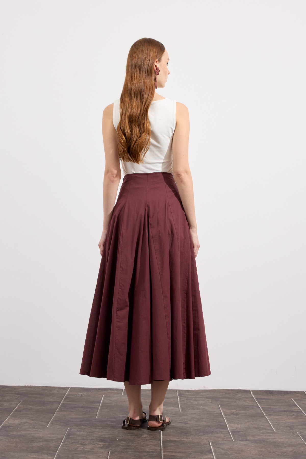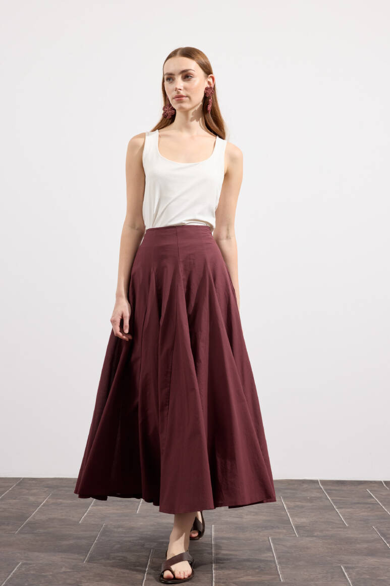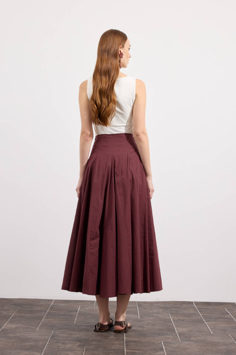 Tam tur özel kloş form, godeli dikiş, bel kısmı düz manşetli, fermuarlı, iç kısmı pamuk astarlı, hareketli ve hacimli doku, Günlük ya da özel gün kombinlerine uygun.