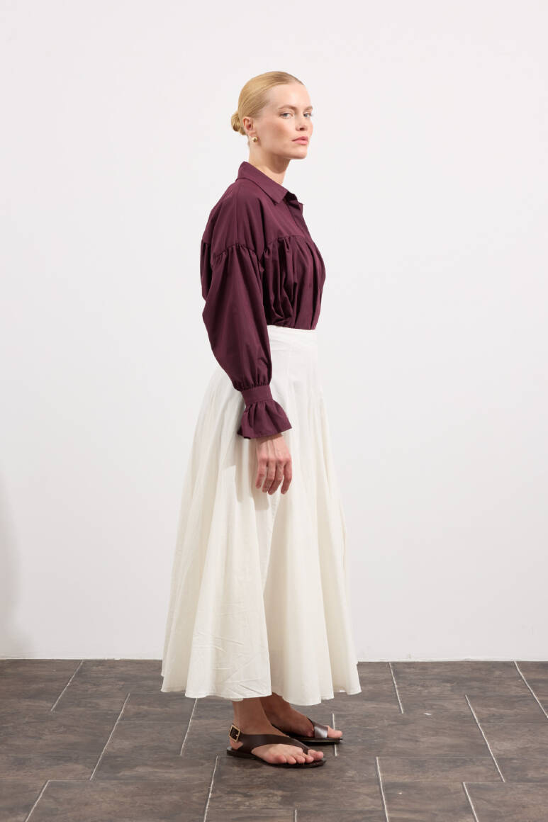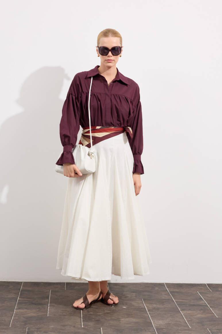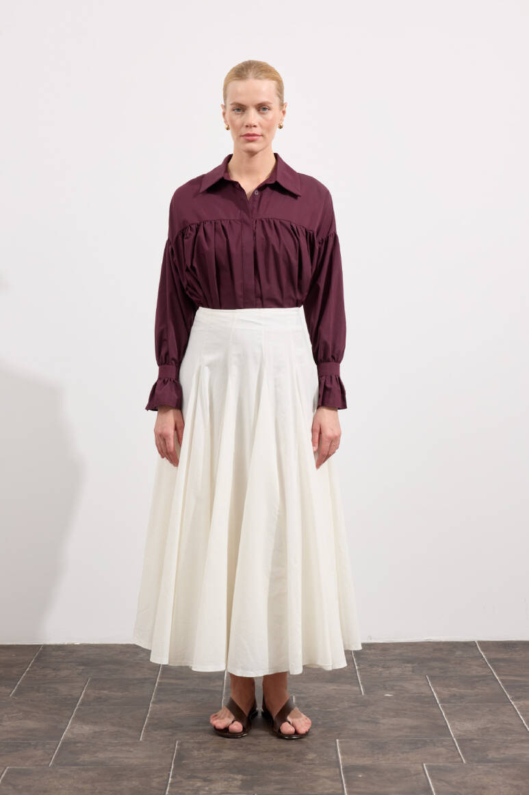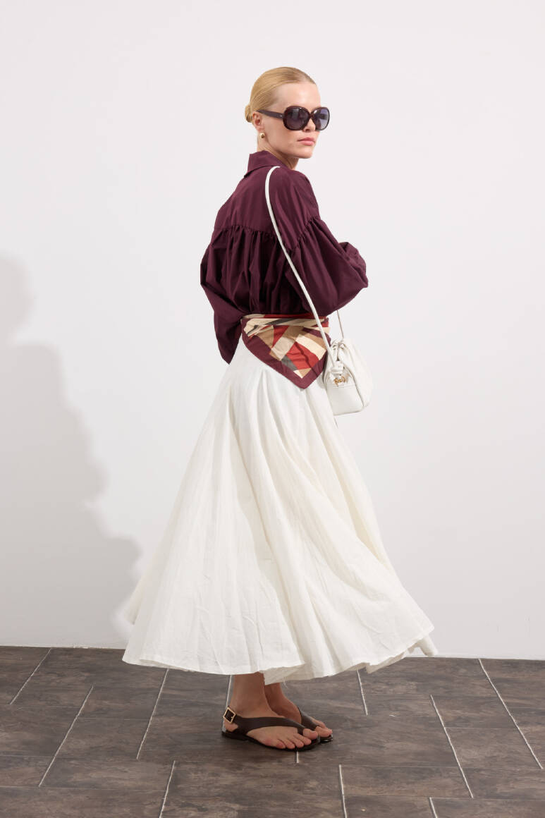 Tam tur özel kloş form, godeli dikiş, bel kısmı düz manşetli, fermuarlı, iç kısmı pamuk astarlı, hareketli ve hacimli doku, Günlük ya da özel gün kombinlerine uygun.