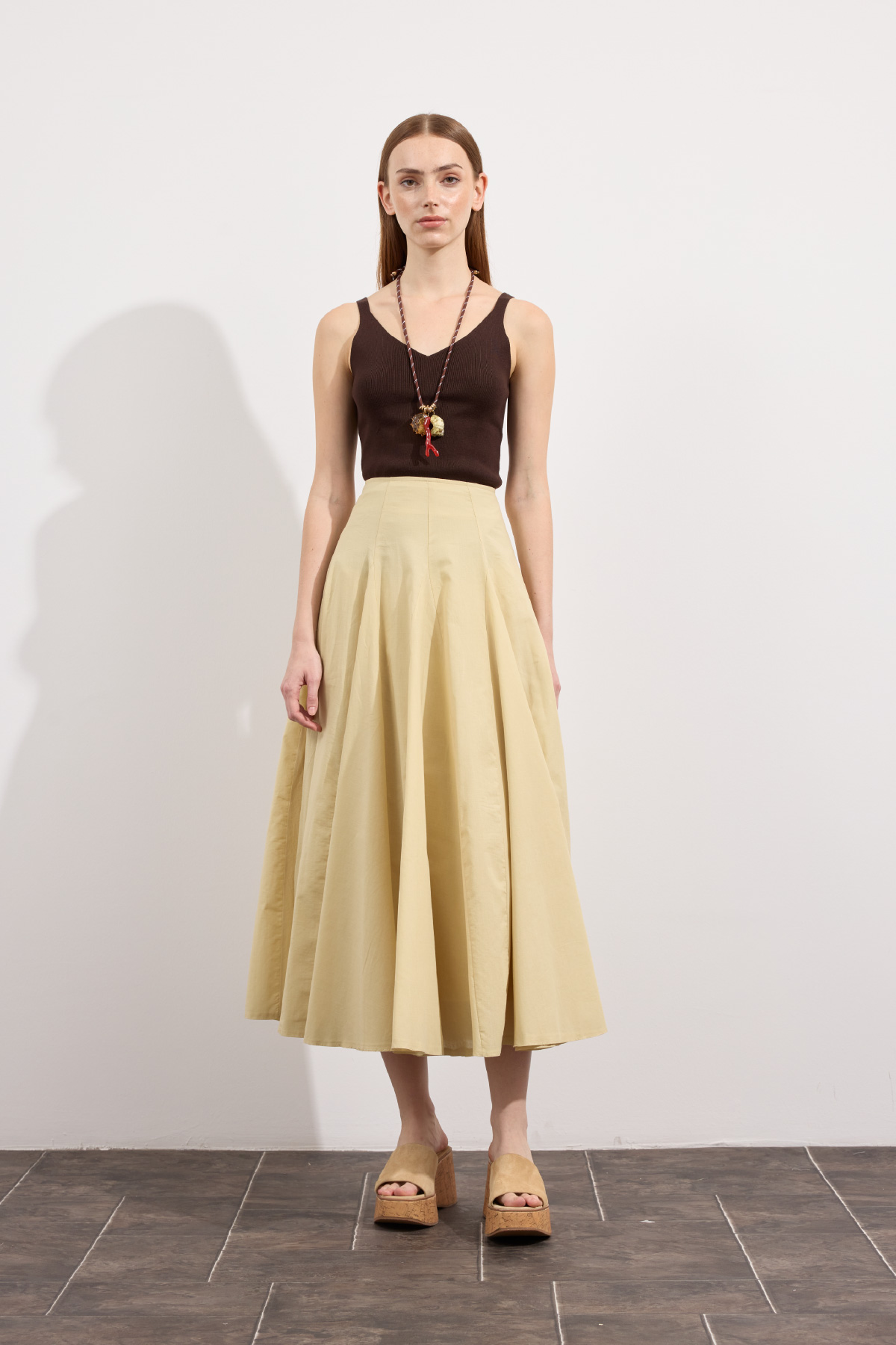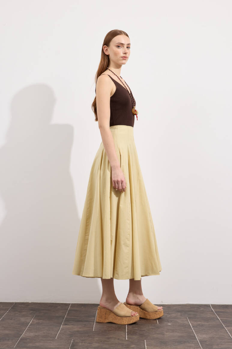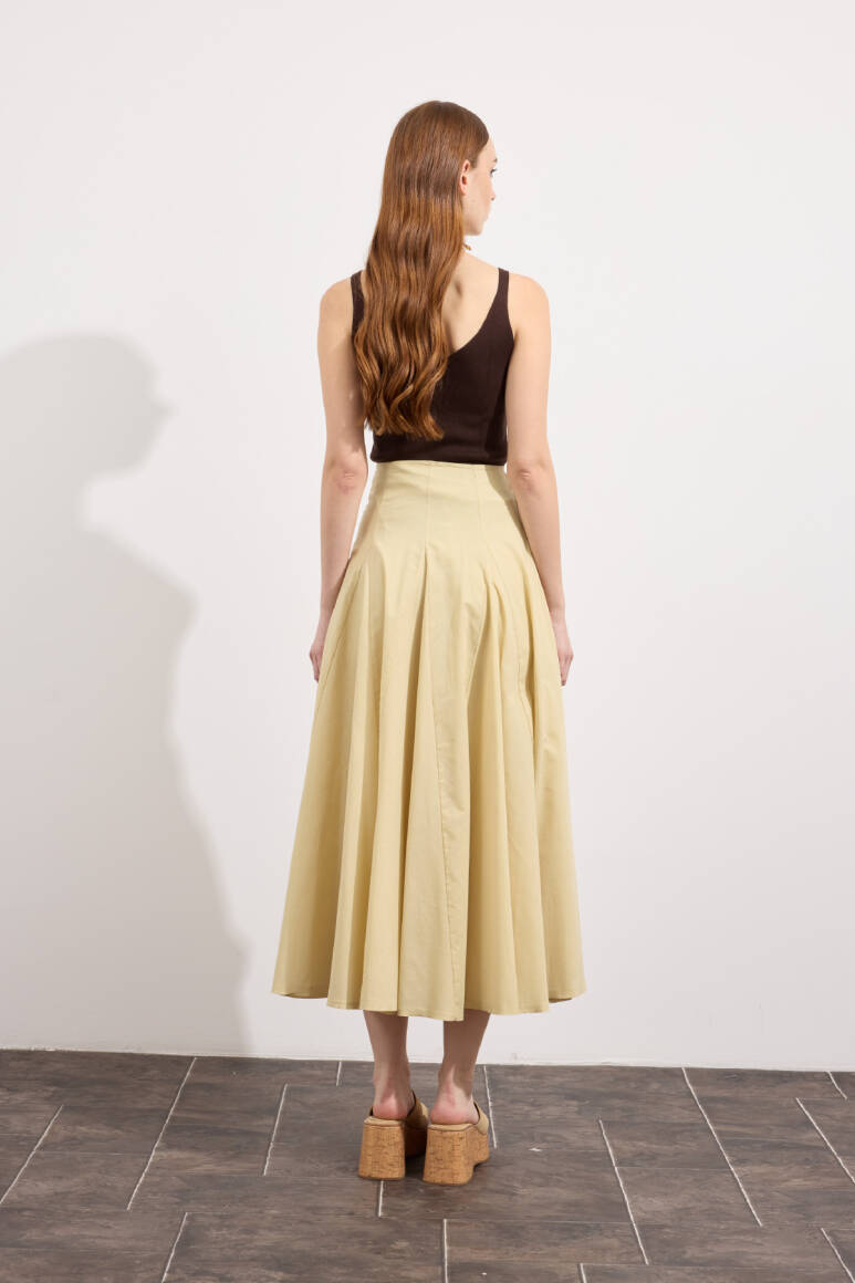 Tam tur özel kloş form, godeli dikiş, bel kısmı düz manşetli, fermuarlı, iç kısmı pamuk astarlı, hareketli ve hacimli doku, Günlük ya da özel gün kombinlerine uygun.