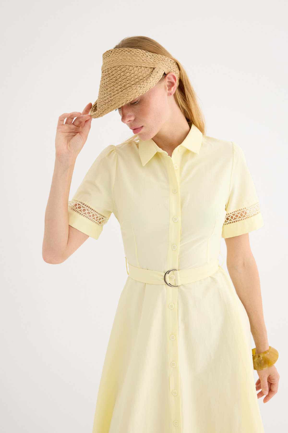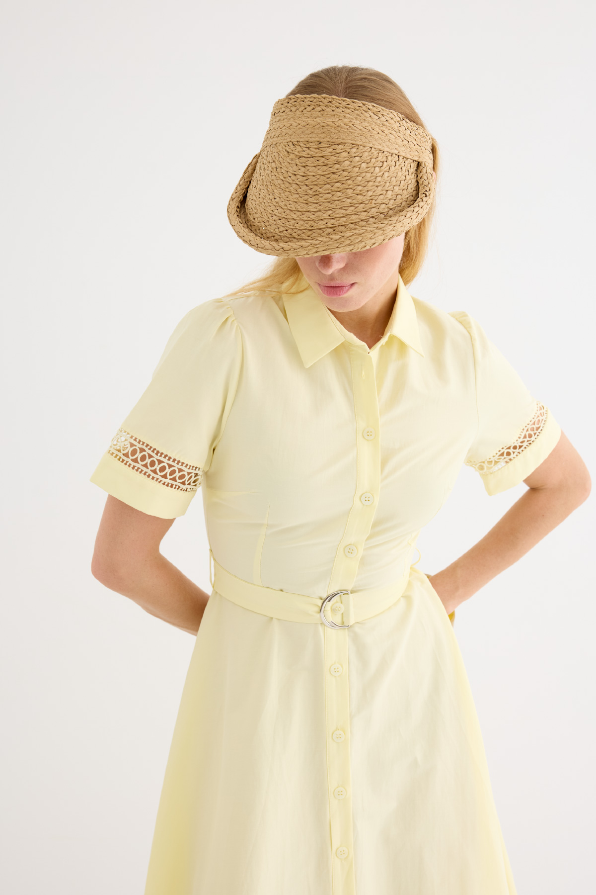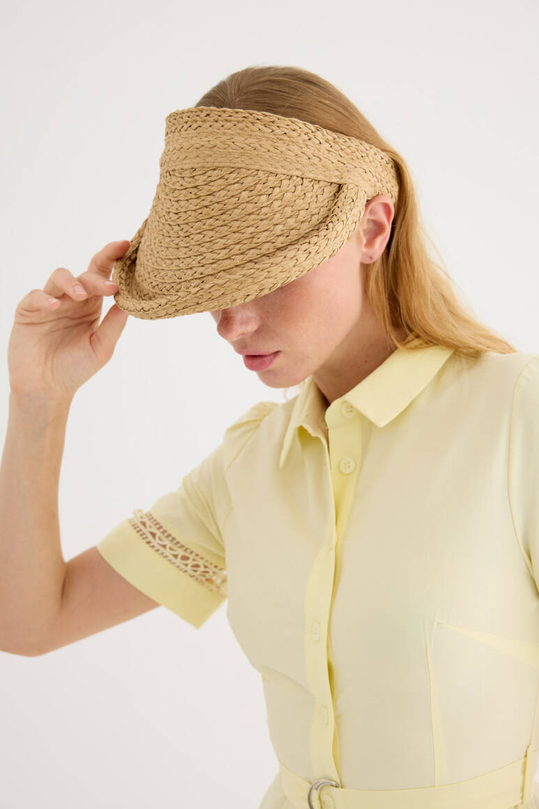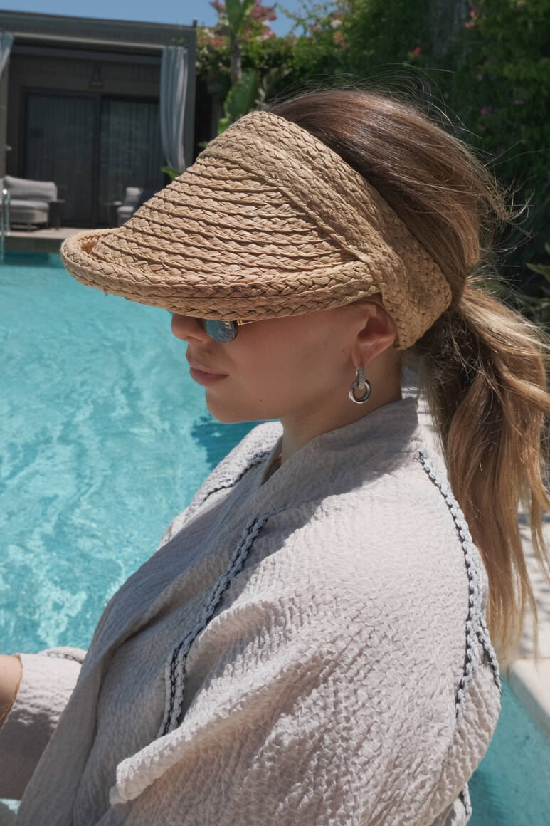 Doğal minimal hasır dokusu ve geniş sperlikli vizör şapka.