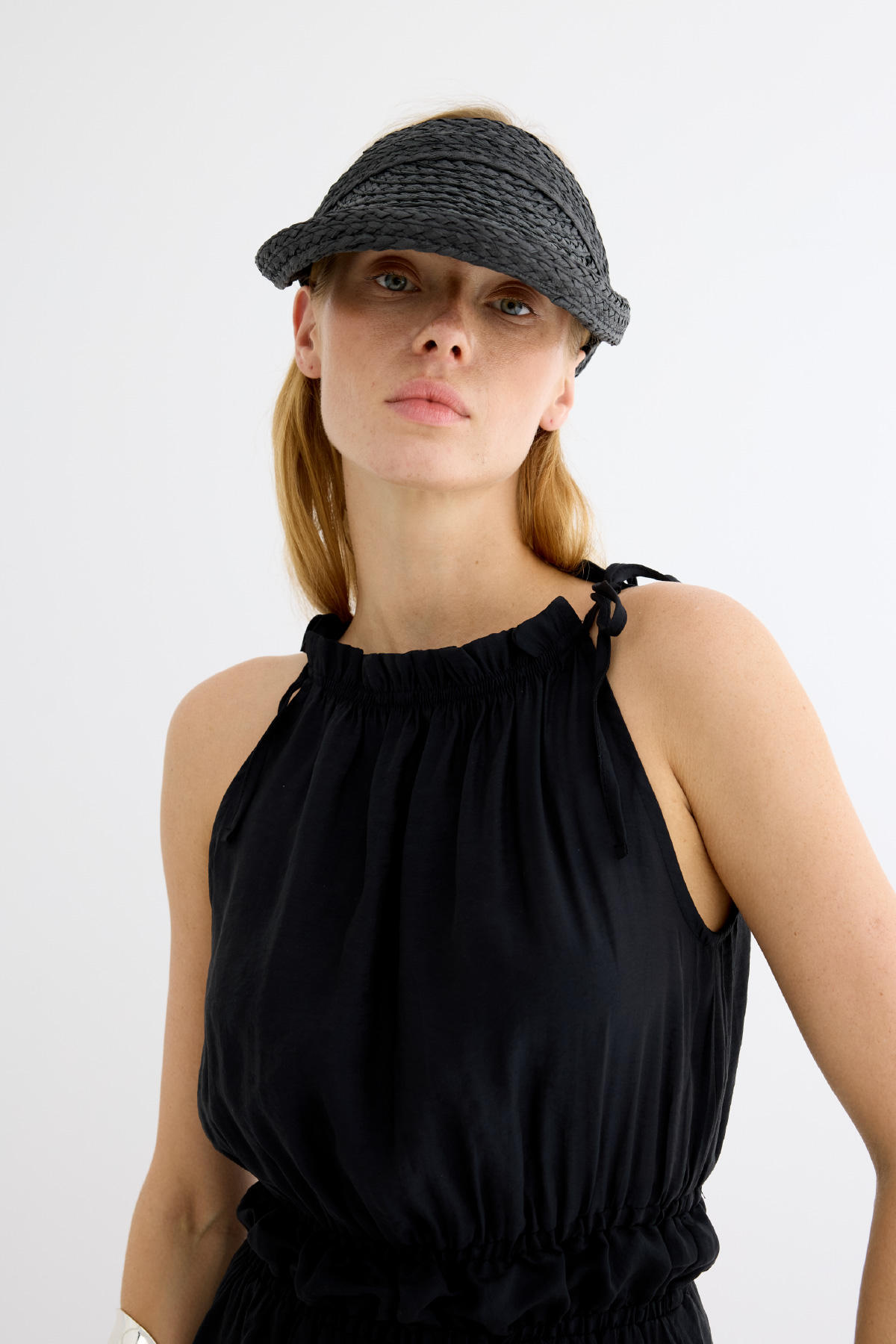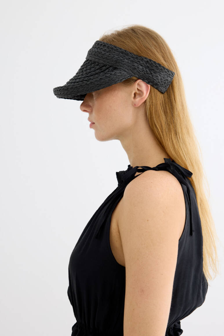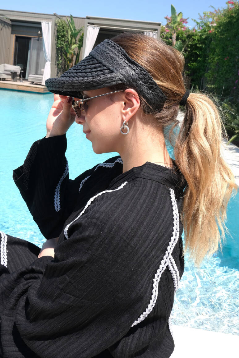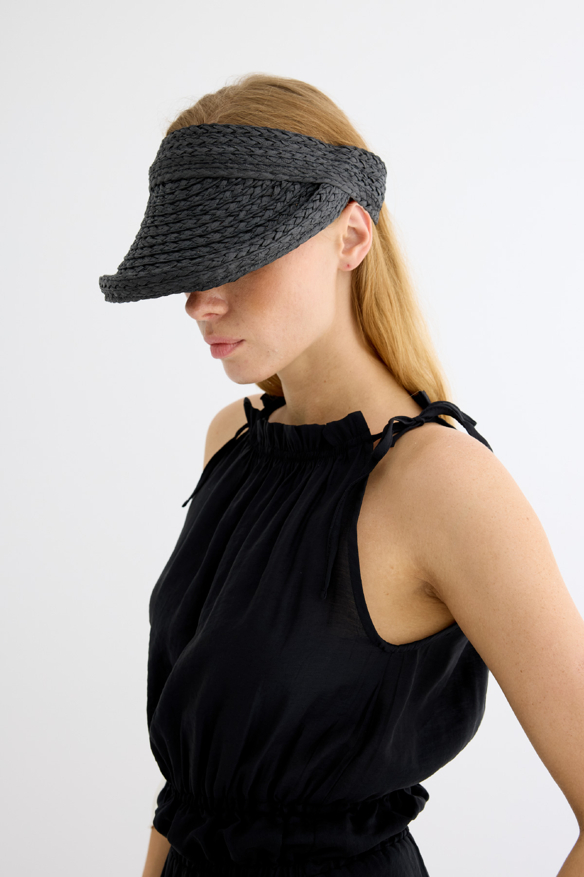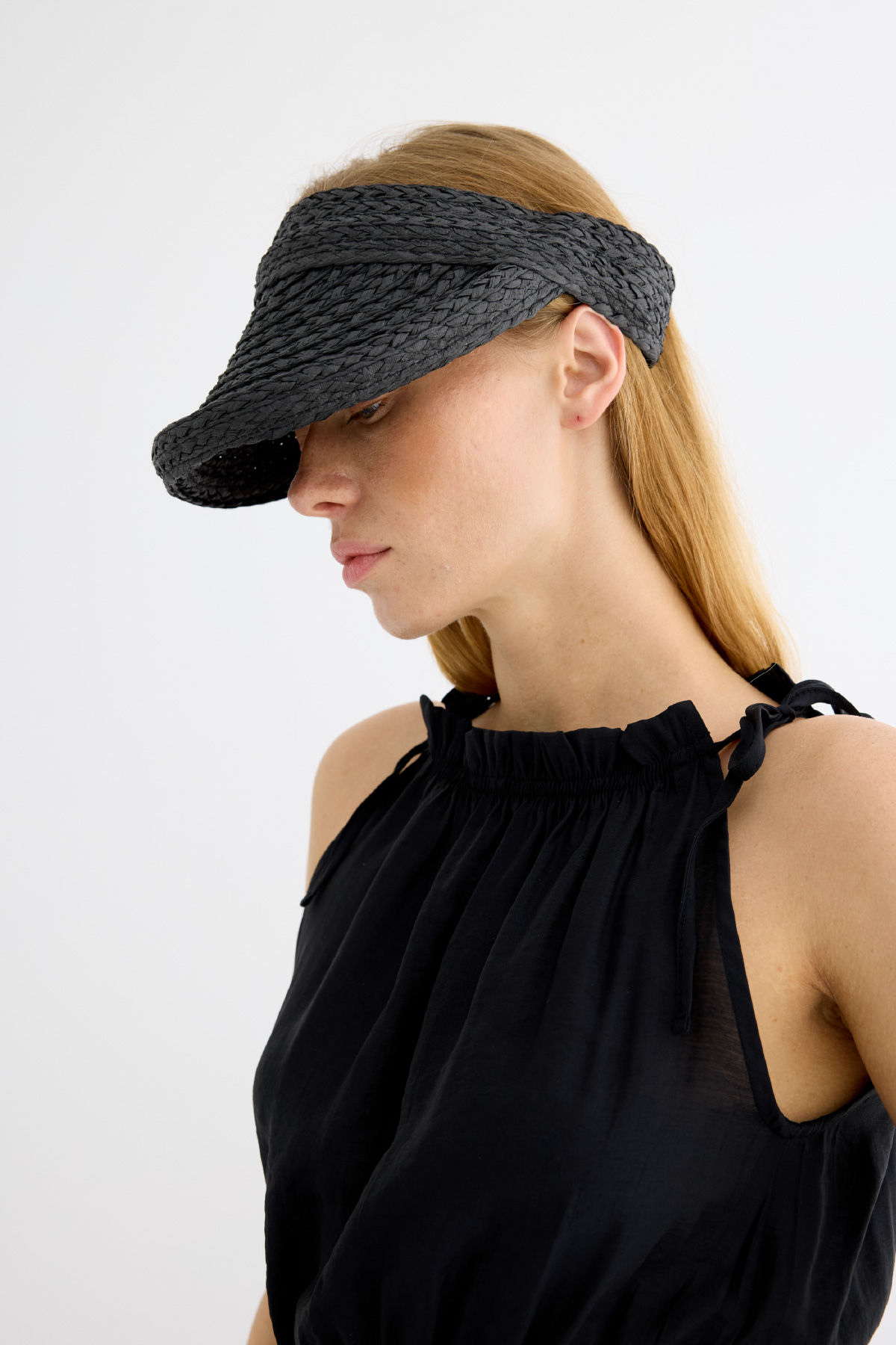 Doğal minimal hasır dokusu ve geniş sperlikli vizör şapka.