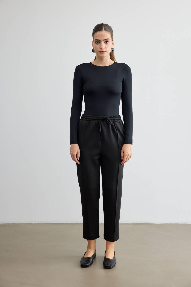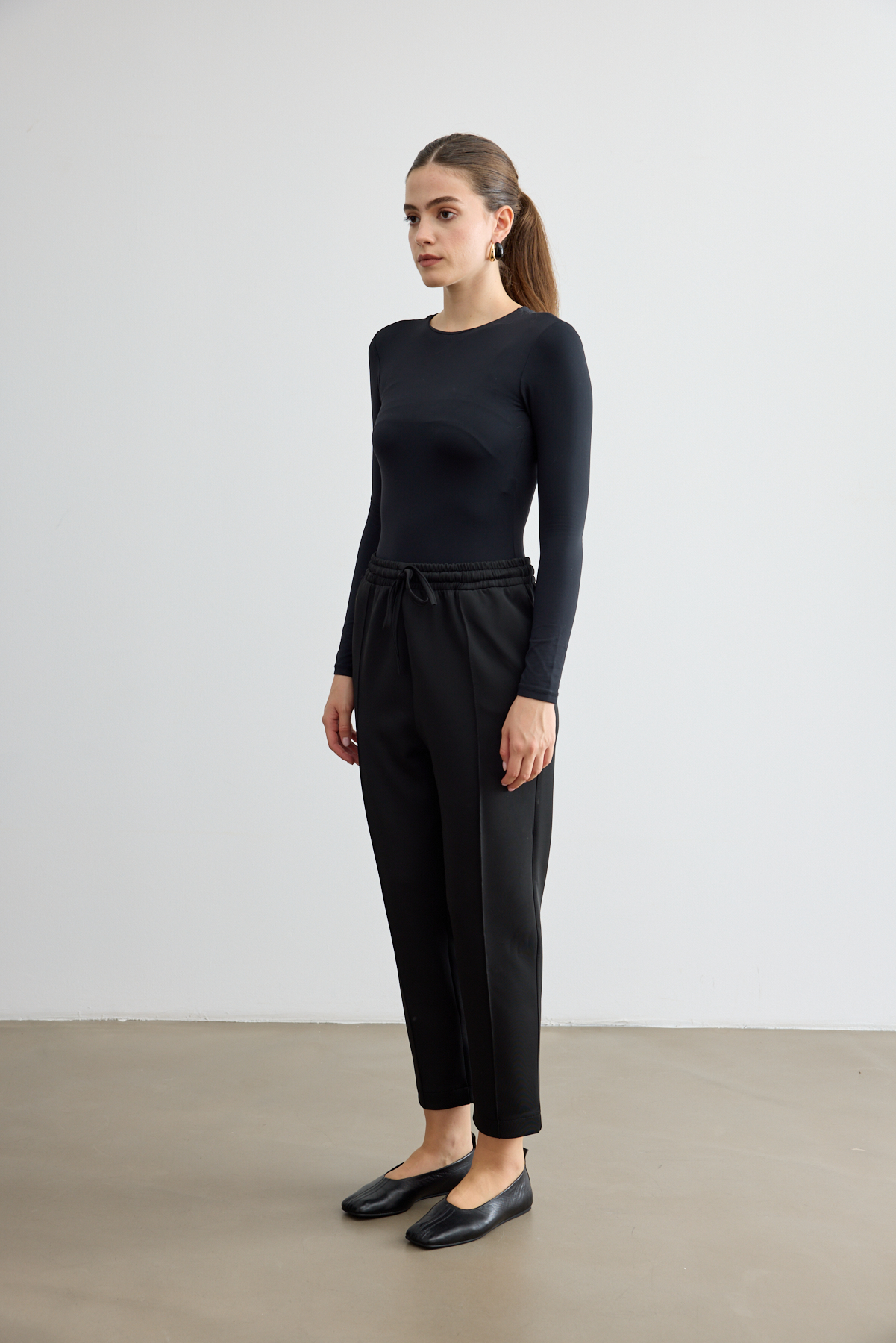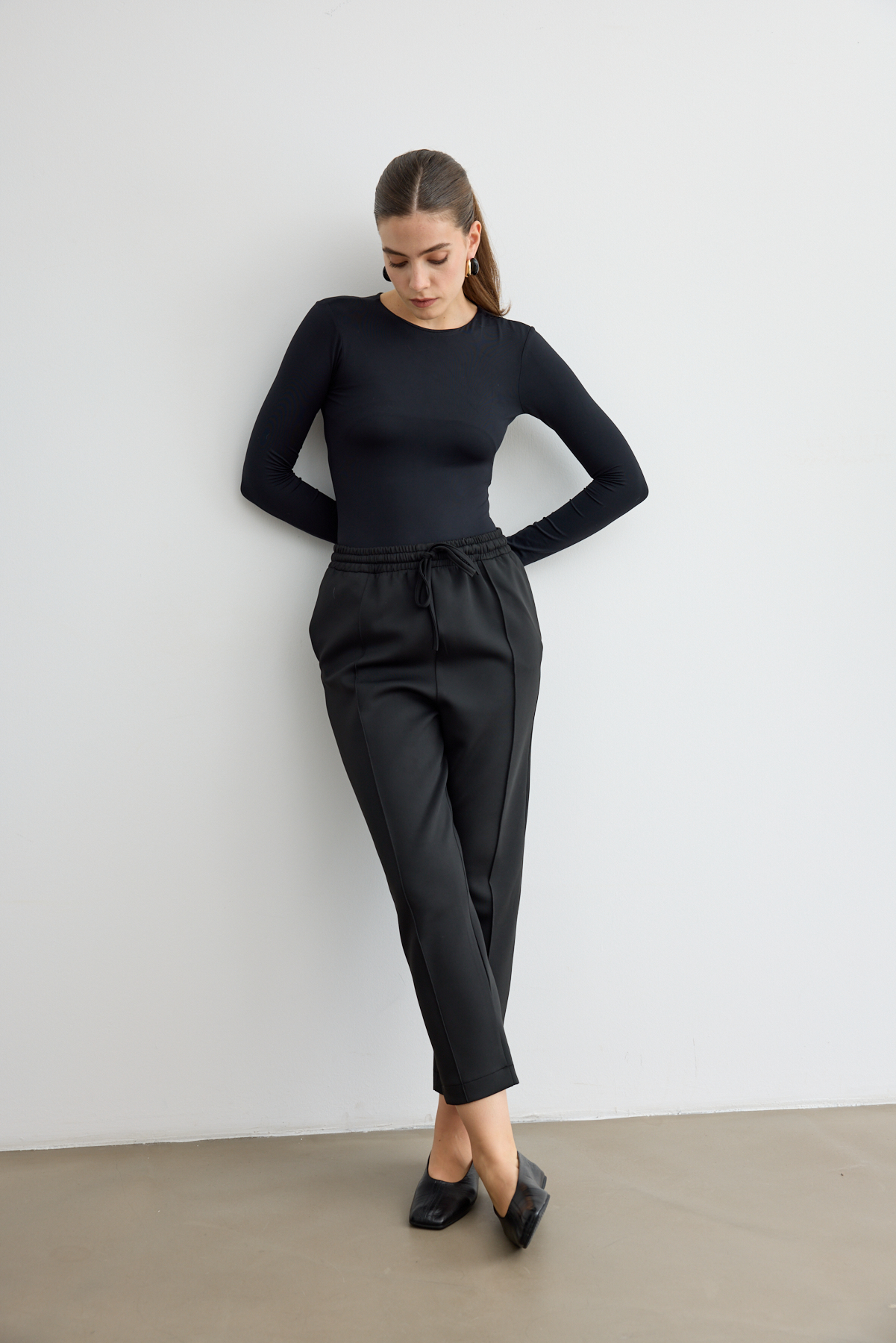 Yumuşak hatları ve hafif formu ile havuç kesim pantolon, rahatlığı şıklıkla buluşturuyor. Yüksek bel tasarımı ve daralan paçaları, modern bir siluet sunarken gündelik ve özel kombinlerde zarif bir duruş sağlıyor.