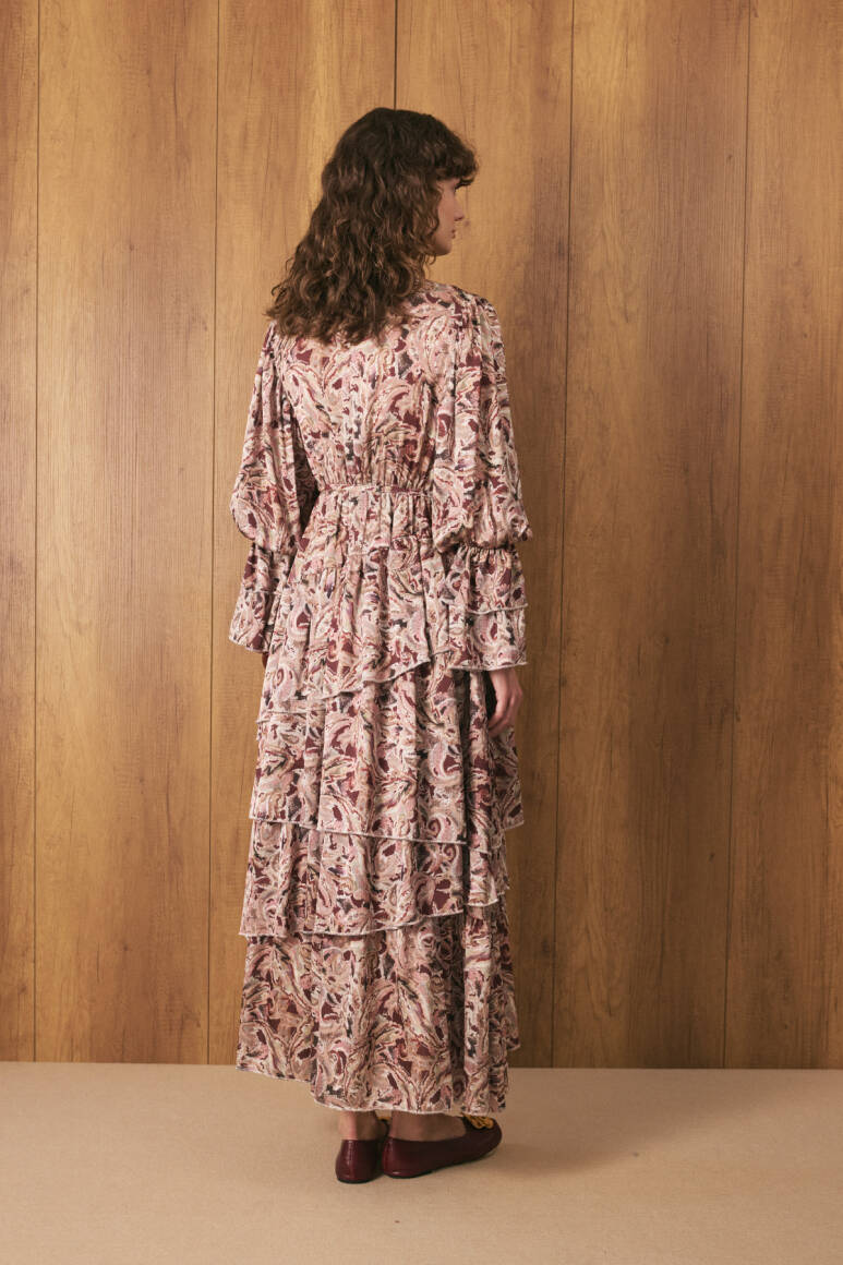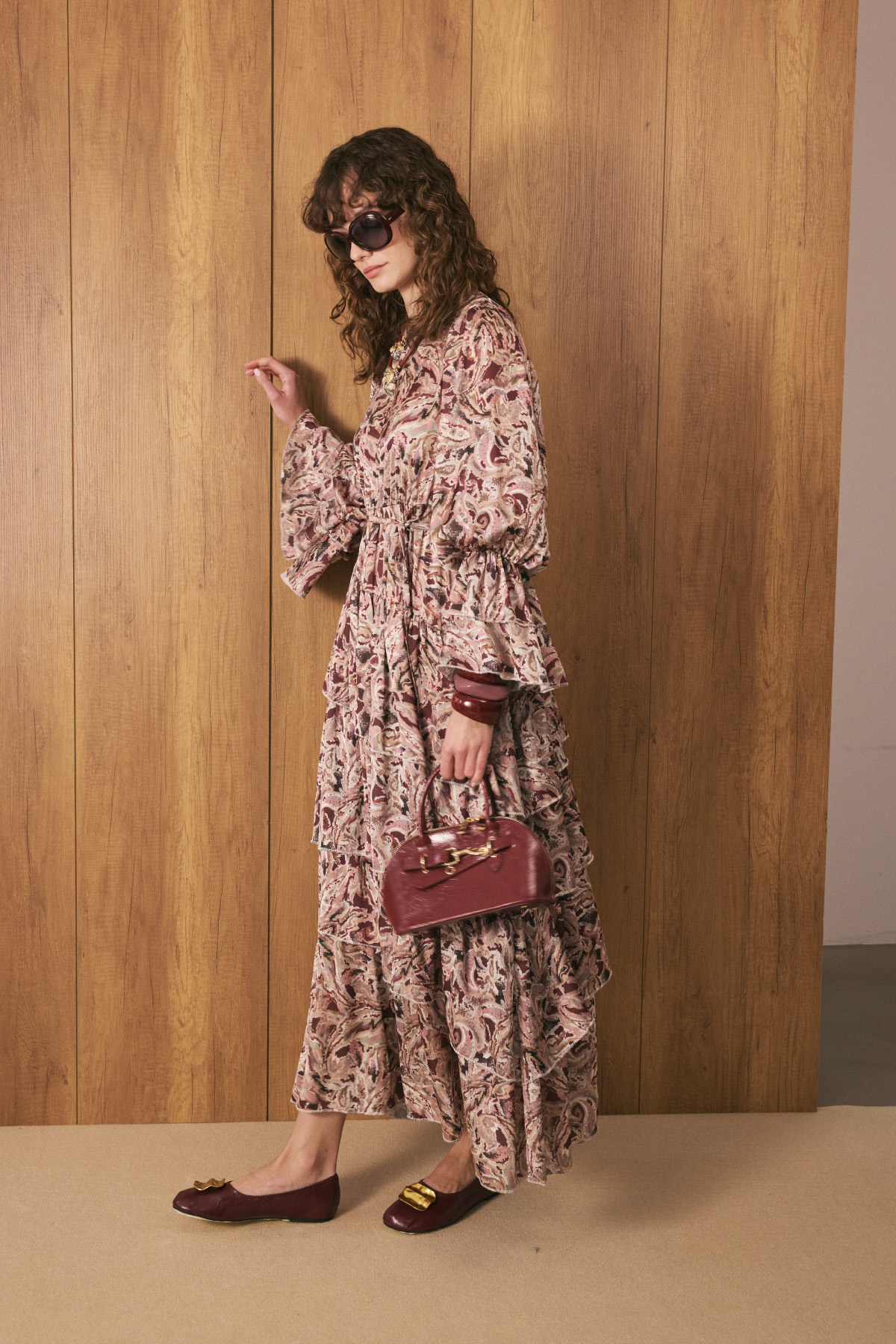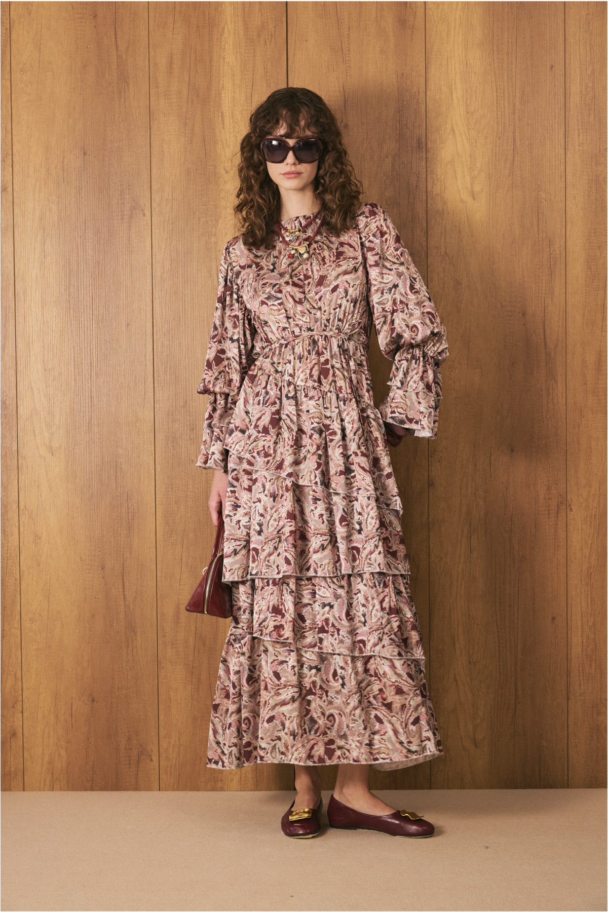 Hafif ve dökümlü kumaş,Kat kat volan detaylı tasarım,Beli vurgulayan elastik yapı,Pastel tonlarda özgün desenler,Uzun kollu ve rahat kesim