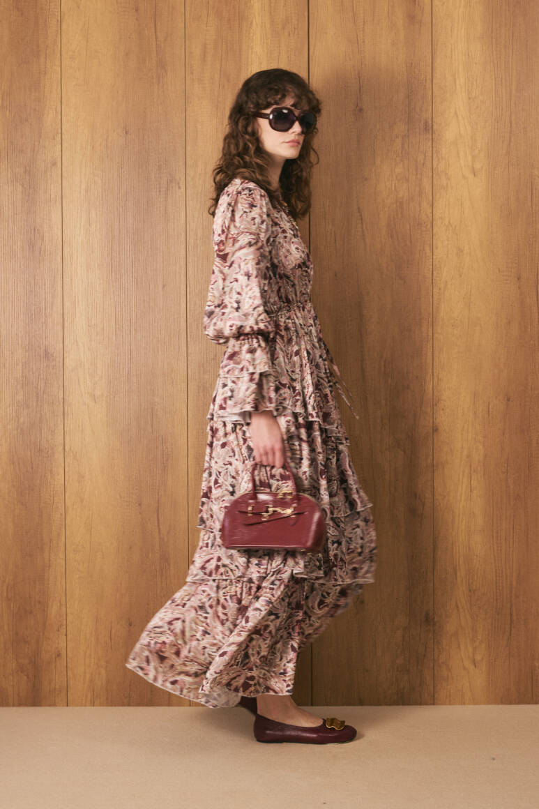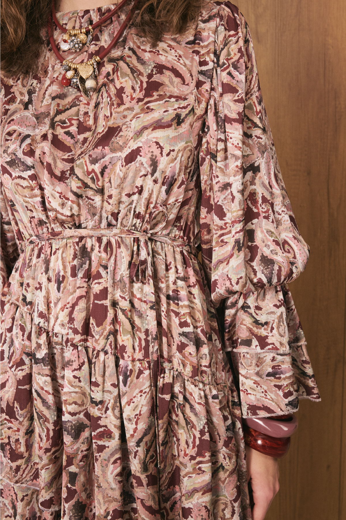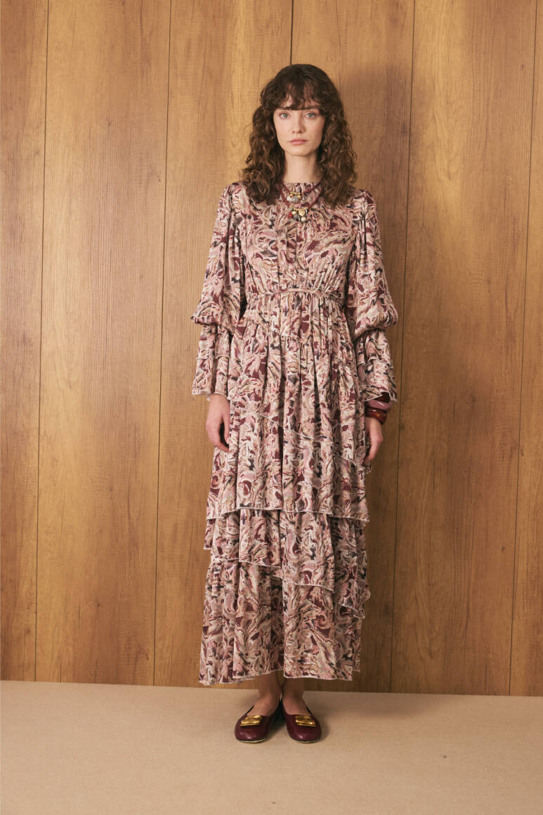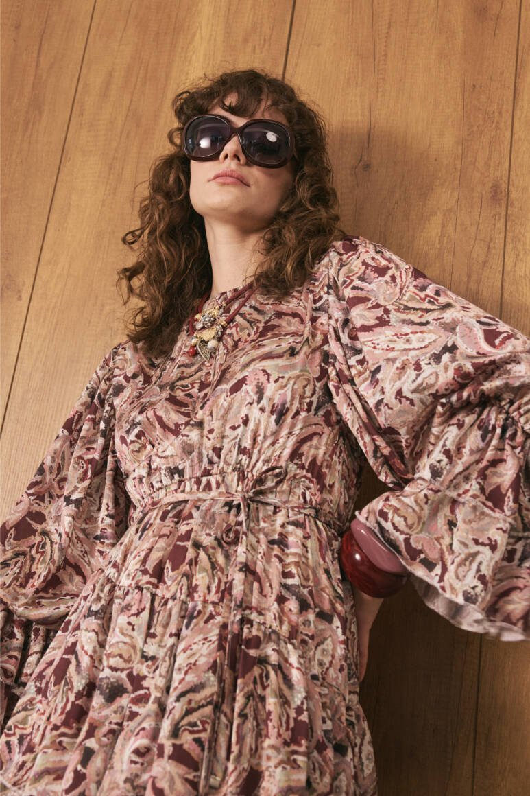 Hafif ve dökümlü kumaş,Kat kat volan detaylı tasarım,Beli vurgulayan elastik yapı,Pastel tonlarda özgün desenler,Uzun kollu ve rahat kesim