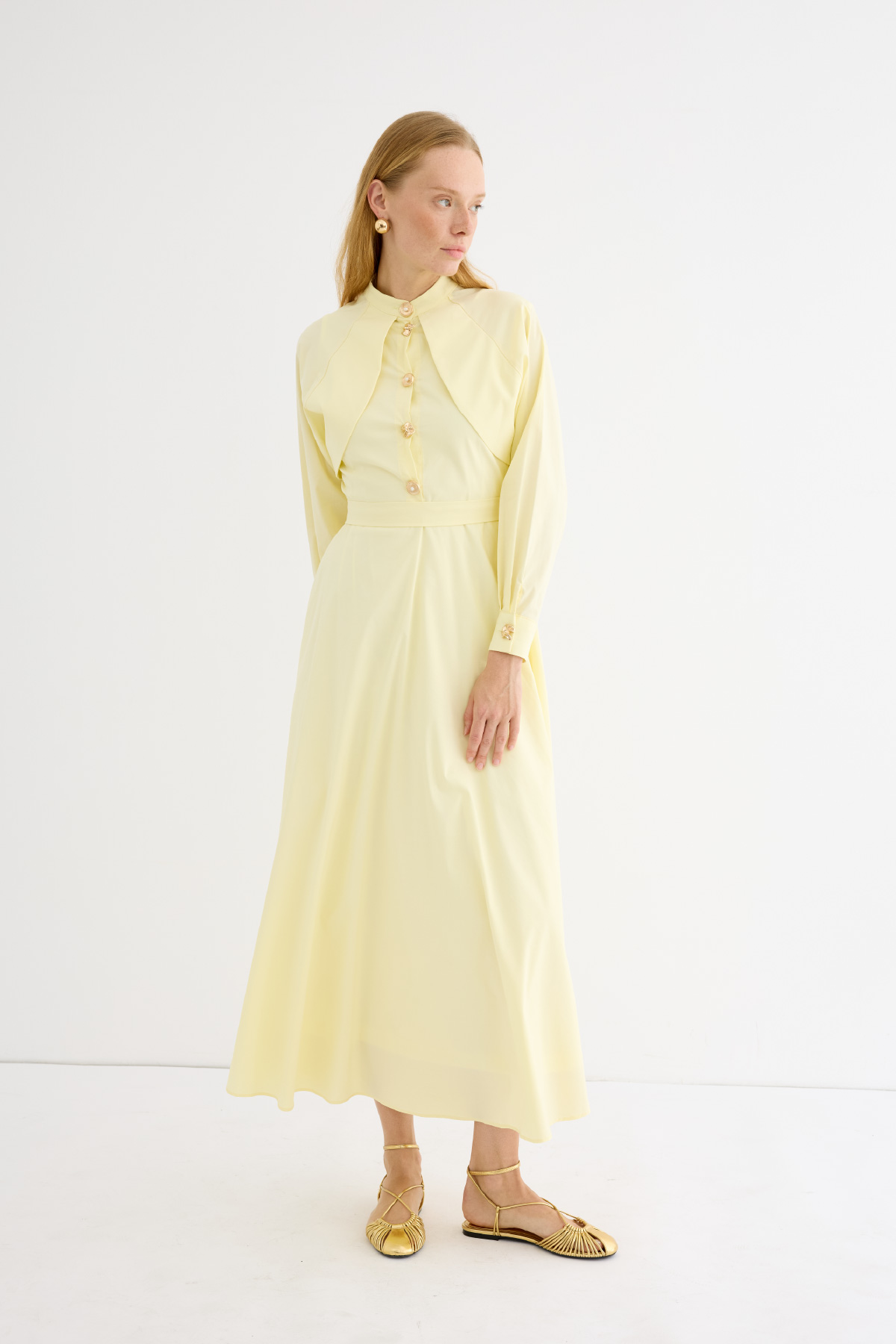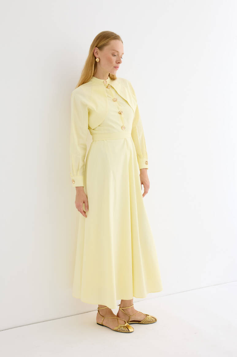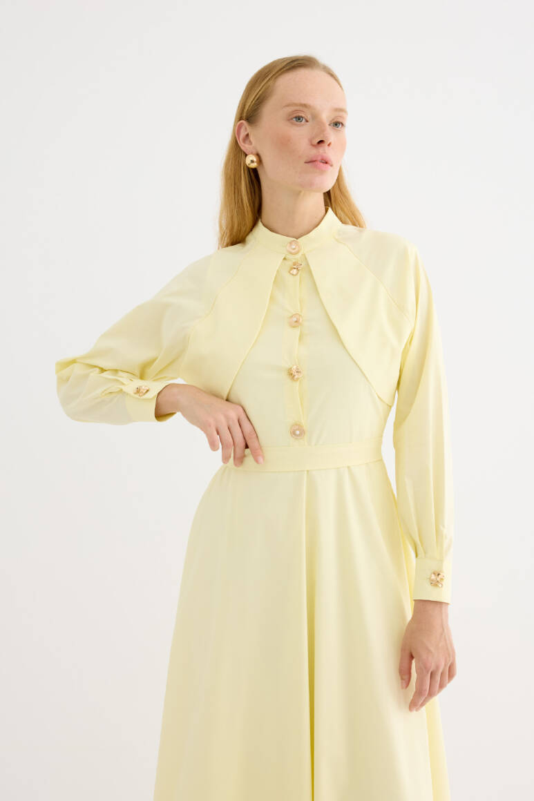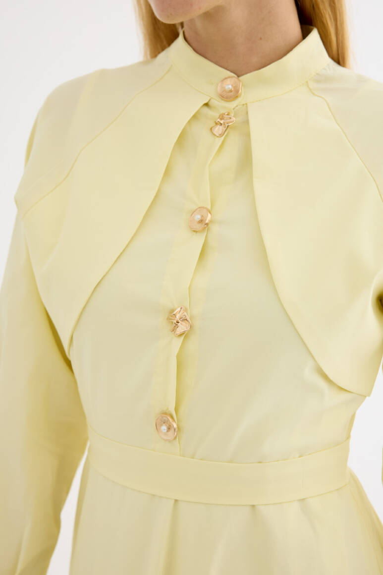 Bilek kısmında manşet ve düğme detayı, ön kısmında kapama detaylı dekoratif düğmeler, dik yaka, uzun kollu